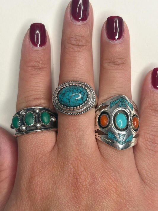 Navajo Native American Silver Ring Turquoise Coral Inlay Shadow Box Size 8 1/2