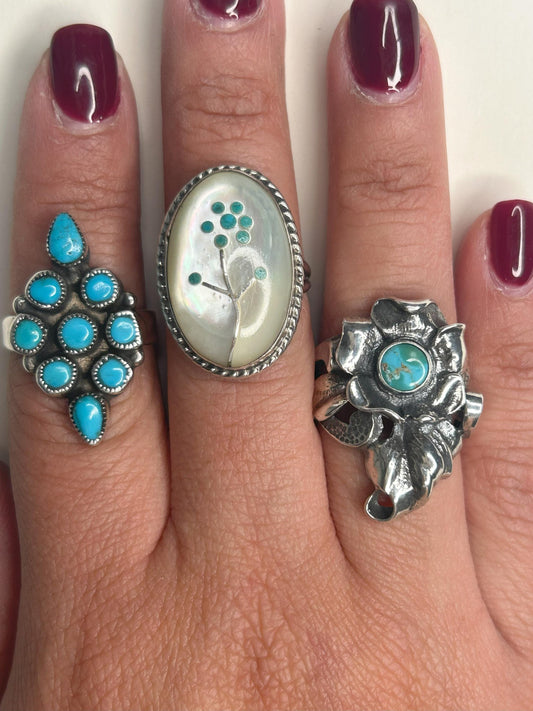 Native American Turquoise Floral Ring Sterling Silver Size 8