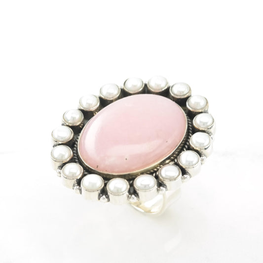Vintage Large Silver Ring Rose Quartz Pearl Sterling Pink Adjustable