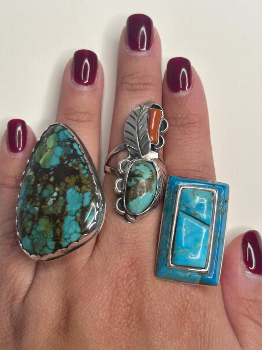 Southwest Silver Ring Turquoise, Coral Feather, Floral, Long Sterling Red, Blue Size 6 1/4