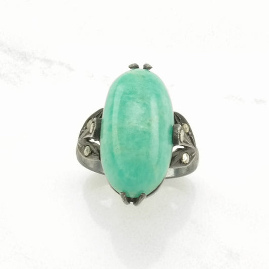 Vintage Art Deco Sterling Silver Ring Amazonite, Marcasite Floral, Green Size 4 1/4