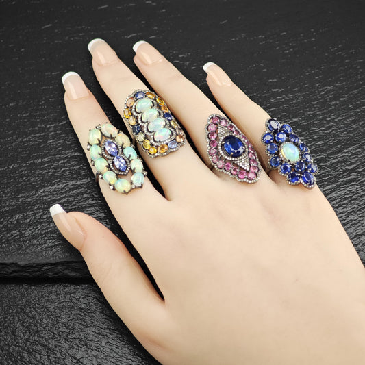 Oxidized Sterling Silver Ring with Ruby, Opal, Diamond, Sapphires