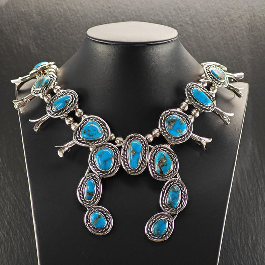 Large Southwest Blue Turquoise Squash Blossom Necklace and Earring Set in Sterling Silver