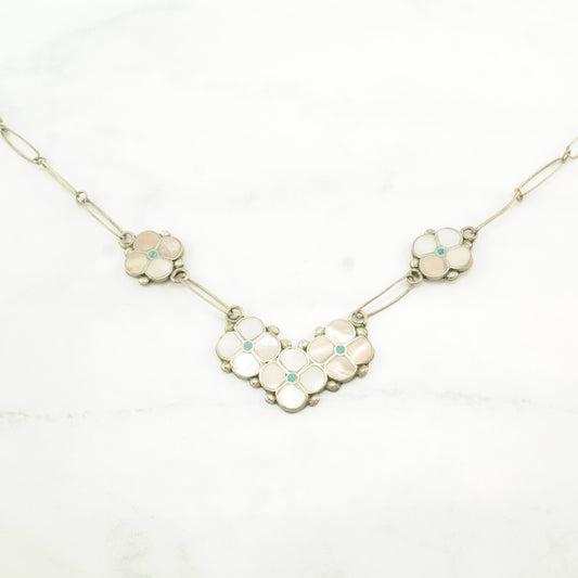 Vintage Zuni Native American MOP, Turquoise, Floral Inlay Sterling Silver Cuff, Necklace, Ring Set