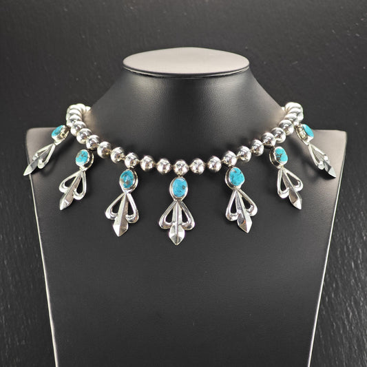 Native American Turquoise Beaded Necklace Earring Set - Sterling Silver Jewelry