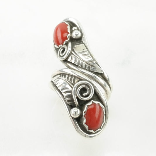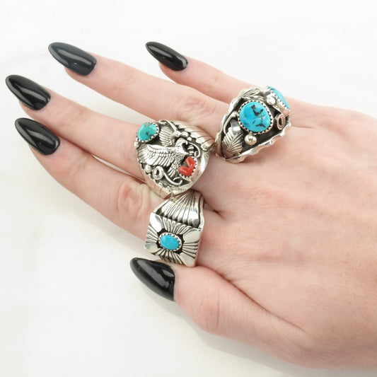 Native American Silver Ring Spiderweb Turquoise, Coral Feather Sterling Green, Red Size 6 1/2