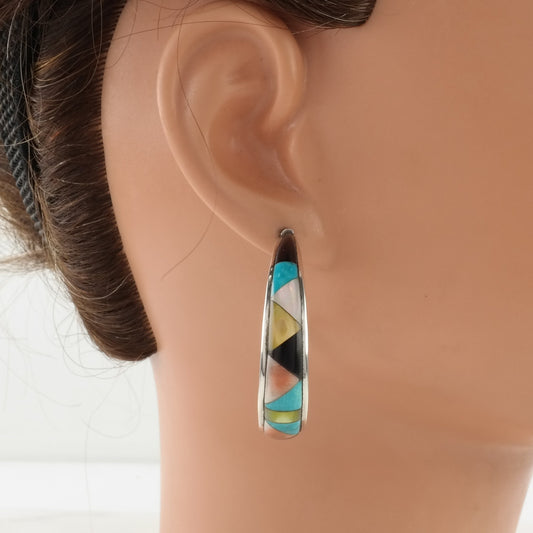 Vintage Sterling Silver Stud/Hoop Earrings Native American Turquoise, Onyx, MOP, Conch Inlay