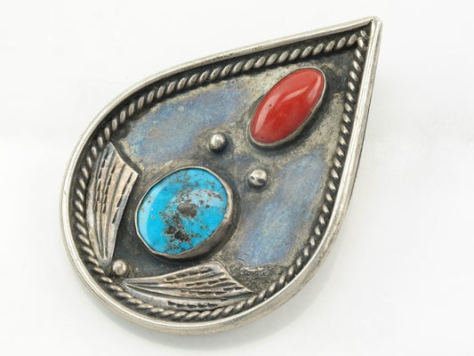 Vintage Turquoise & Coral Pendant | Sterling Silver Teardrop Pendant | Native American Shadowbox Jewelry | 1970s