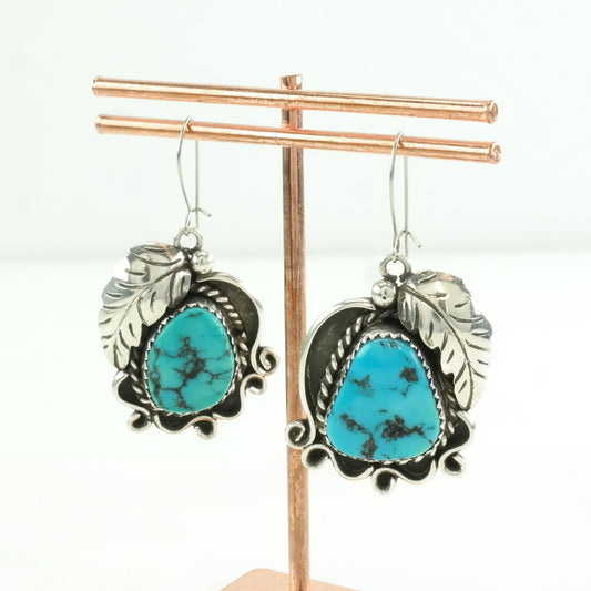 Vintage Sterling Silver Fish Hook/Dangle Earrings Native American Blue Turquoise Leaf