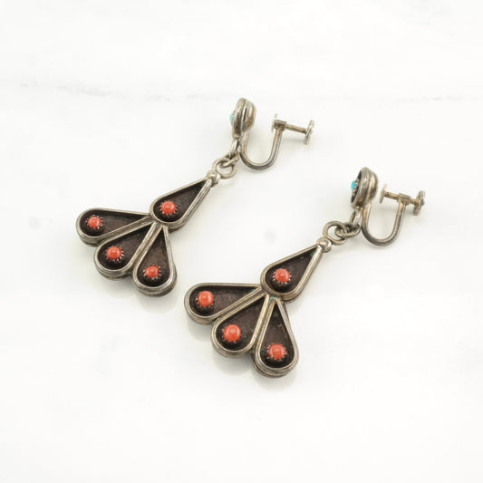 Vintage Sterling Silver Screw back Earrings Native American Red, Blue Turquoise, Coral Reversible