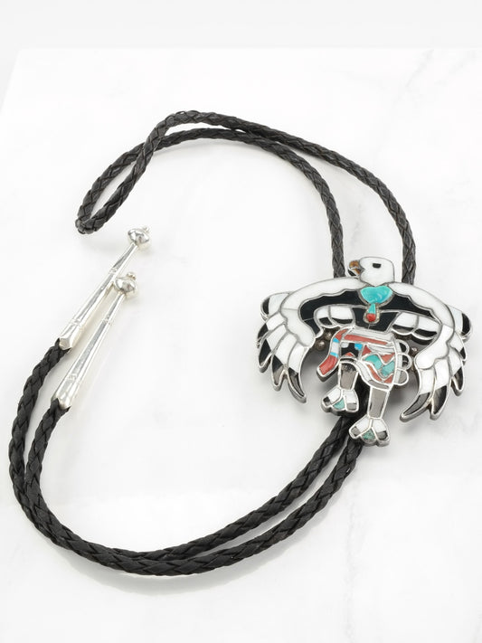 Vintage Native American Sterling Silver MOP, Onyx, Turquoise, Coral Bird, Inlay Bolo Tie