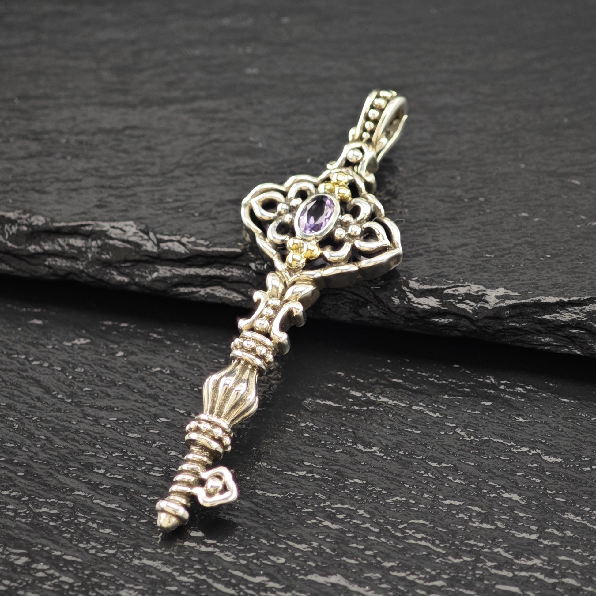 - Features a beautiful amethyst gemstone set in a key-shaped pendant
