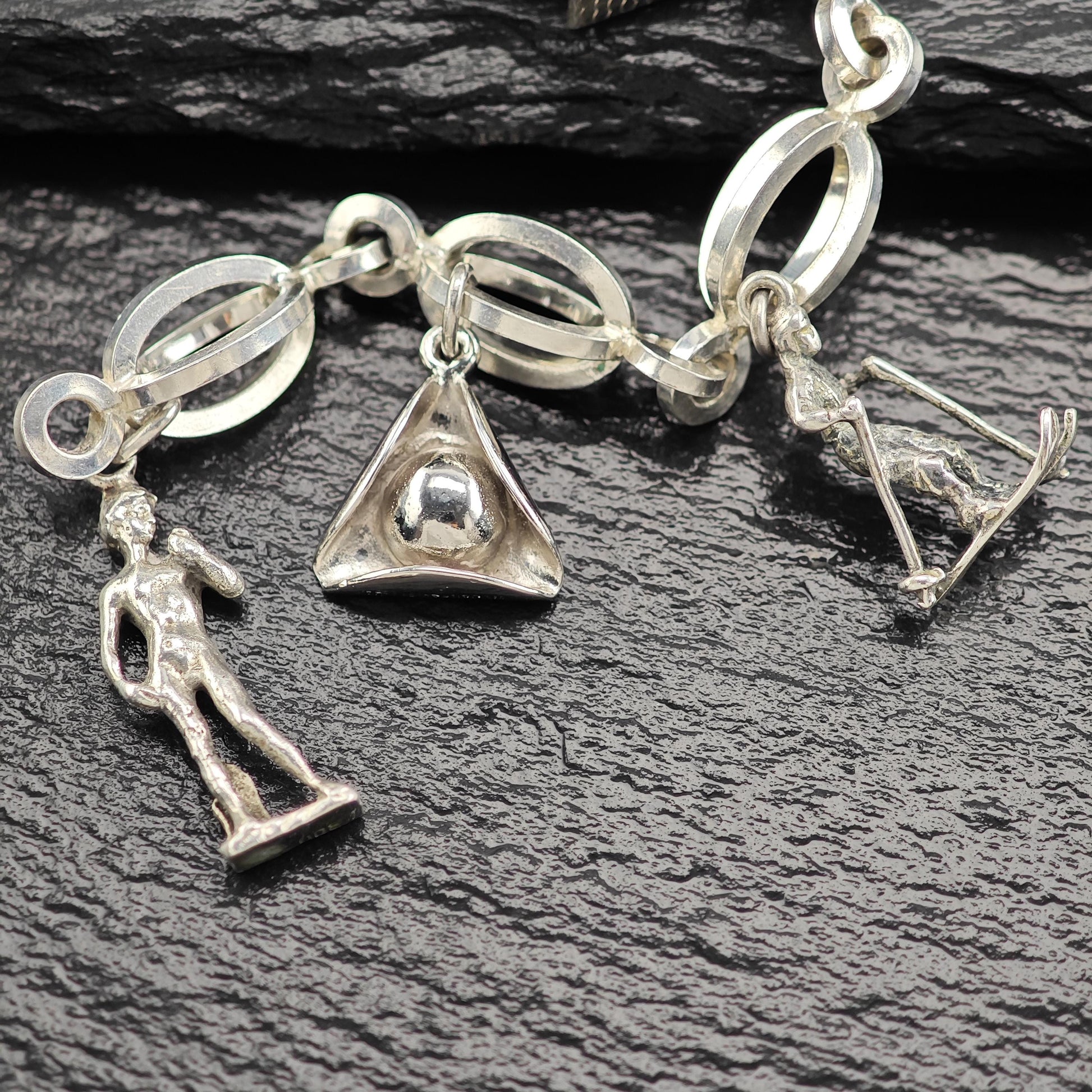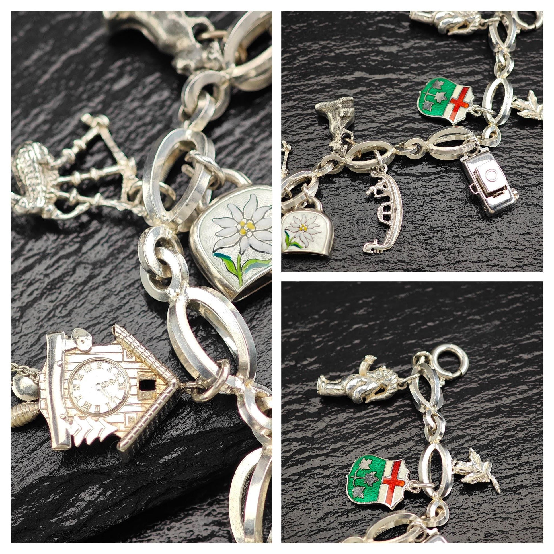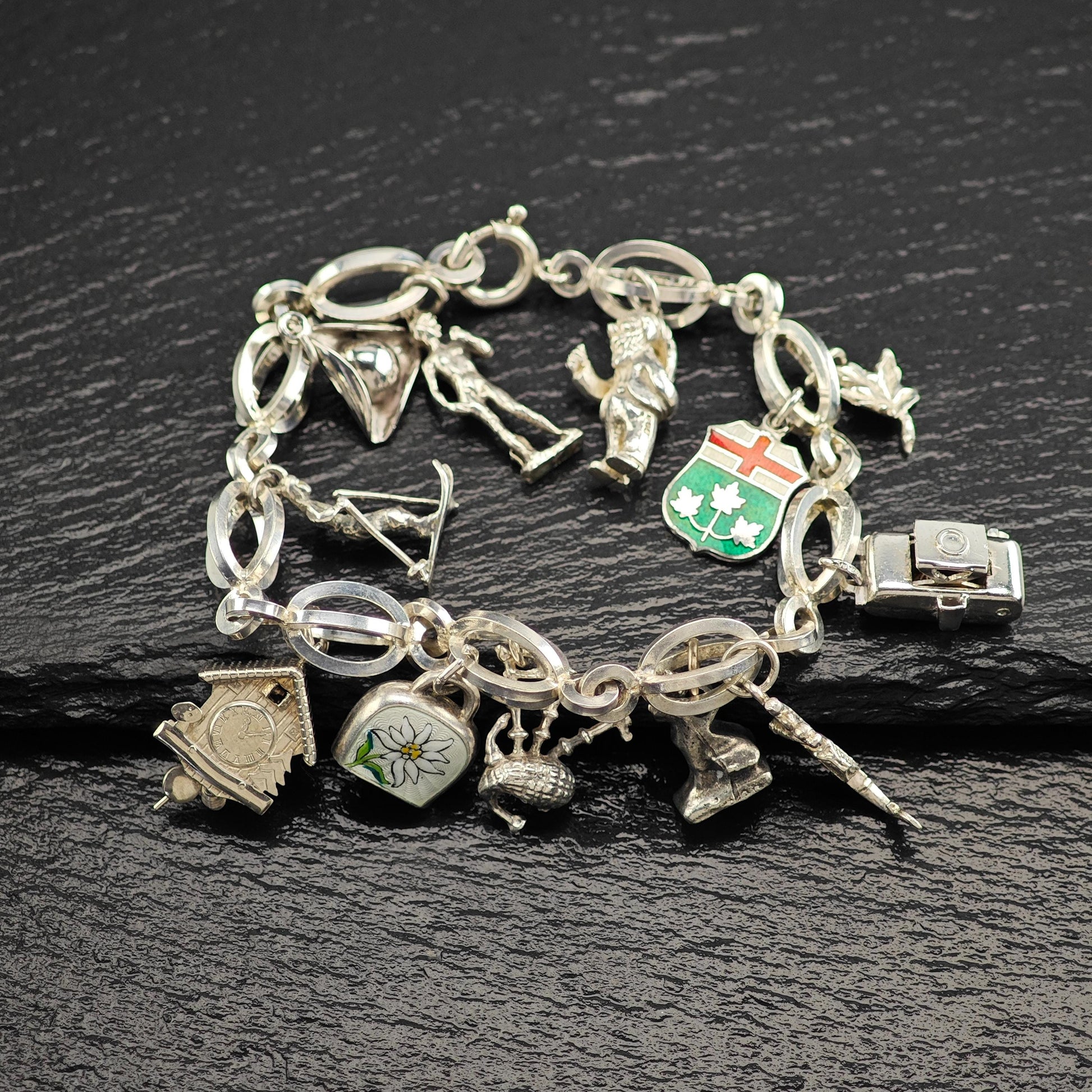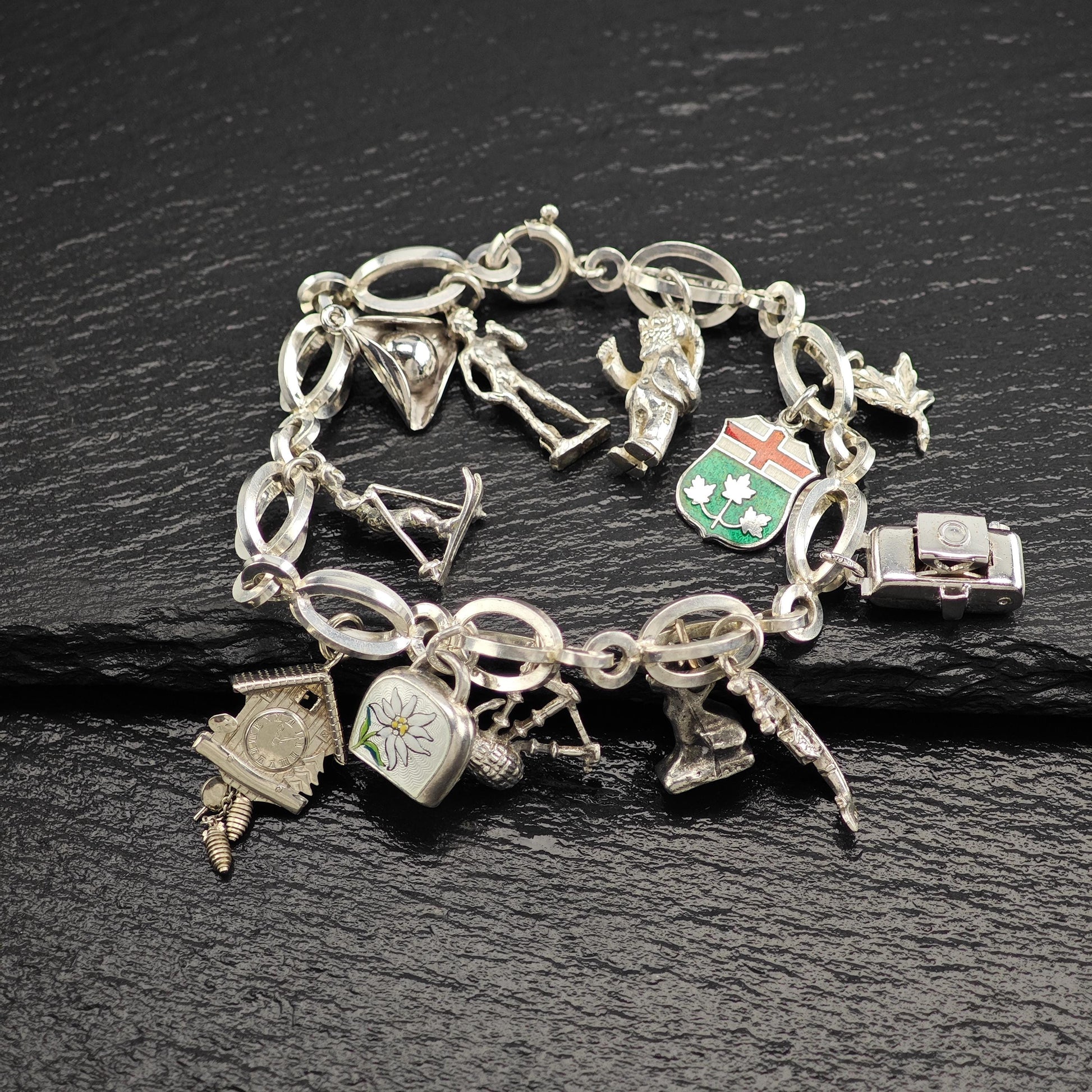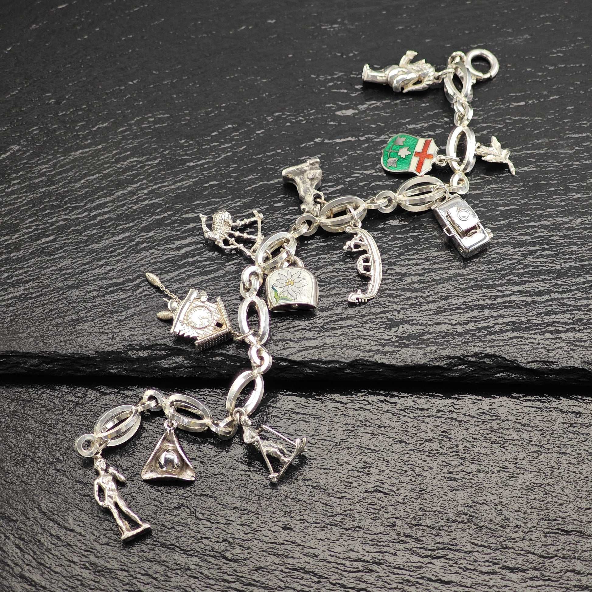 1950's 10 Charm Bracelet 1 Pewter, Enamel, Skier Sterling Silver