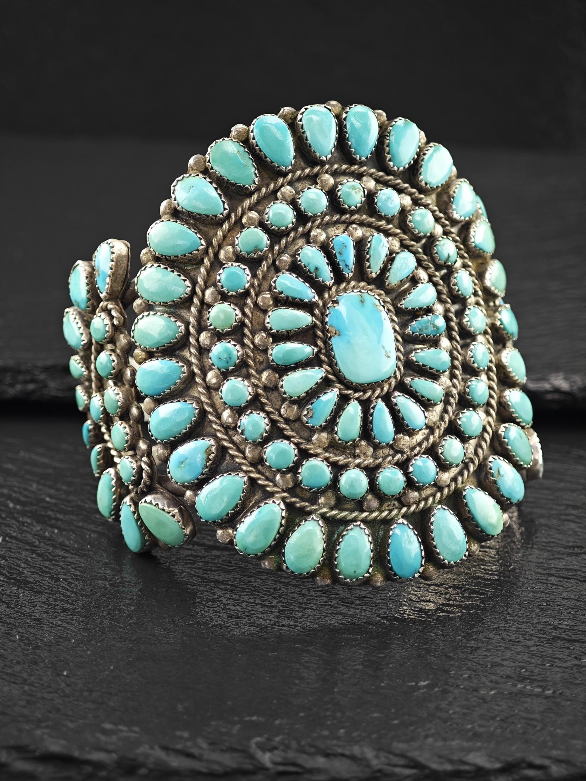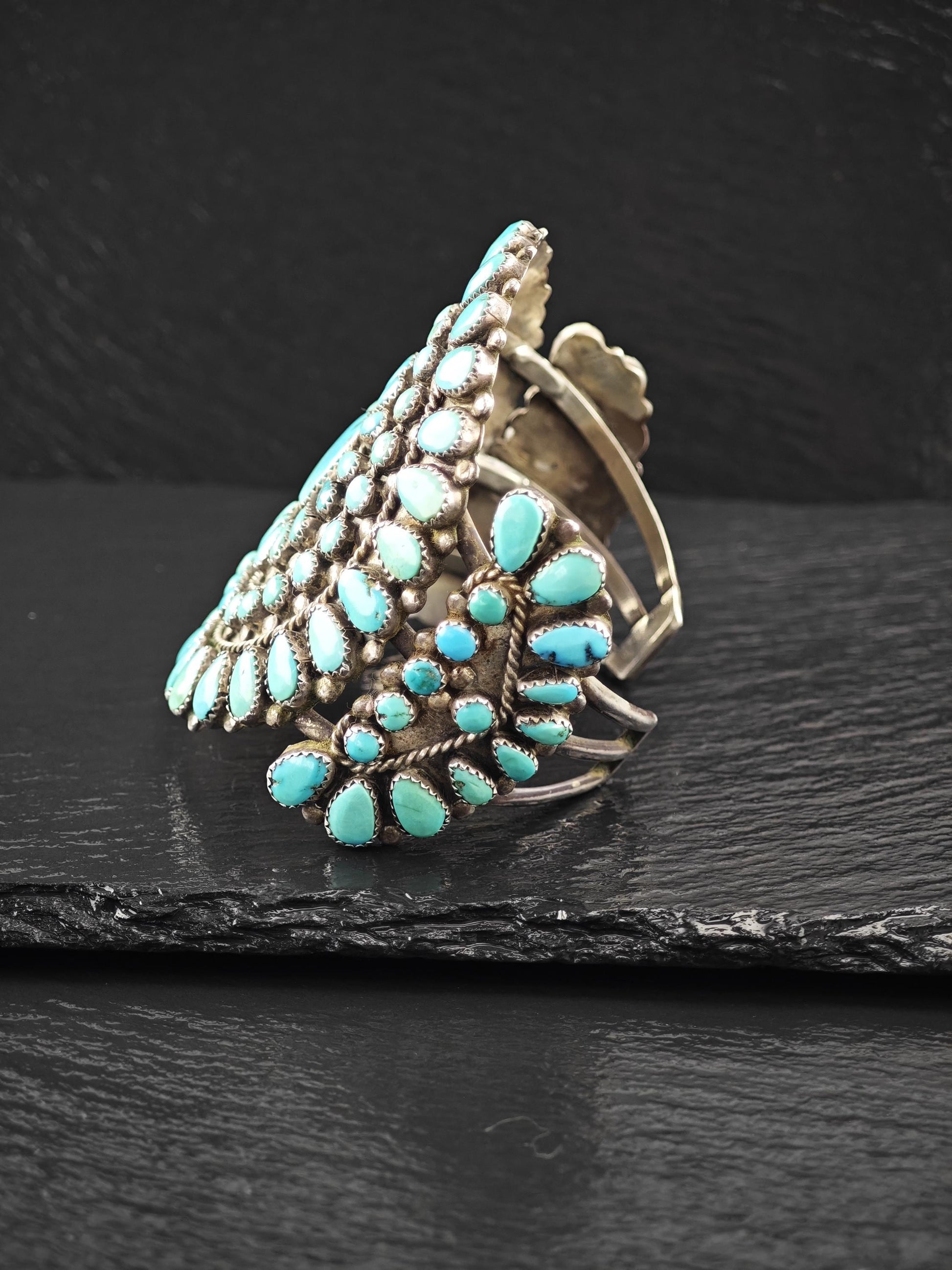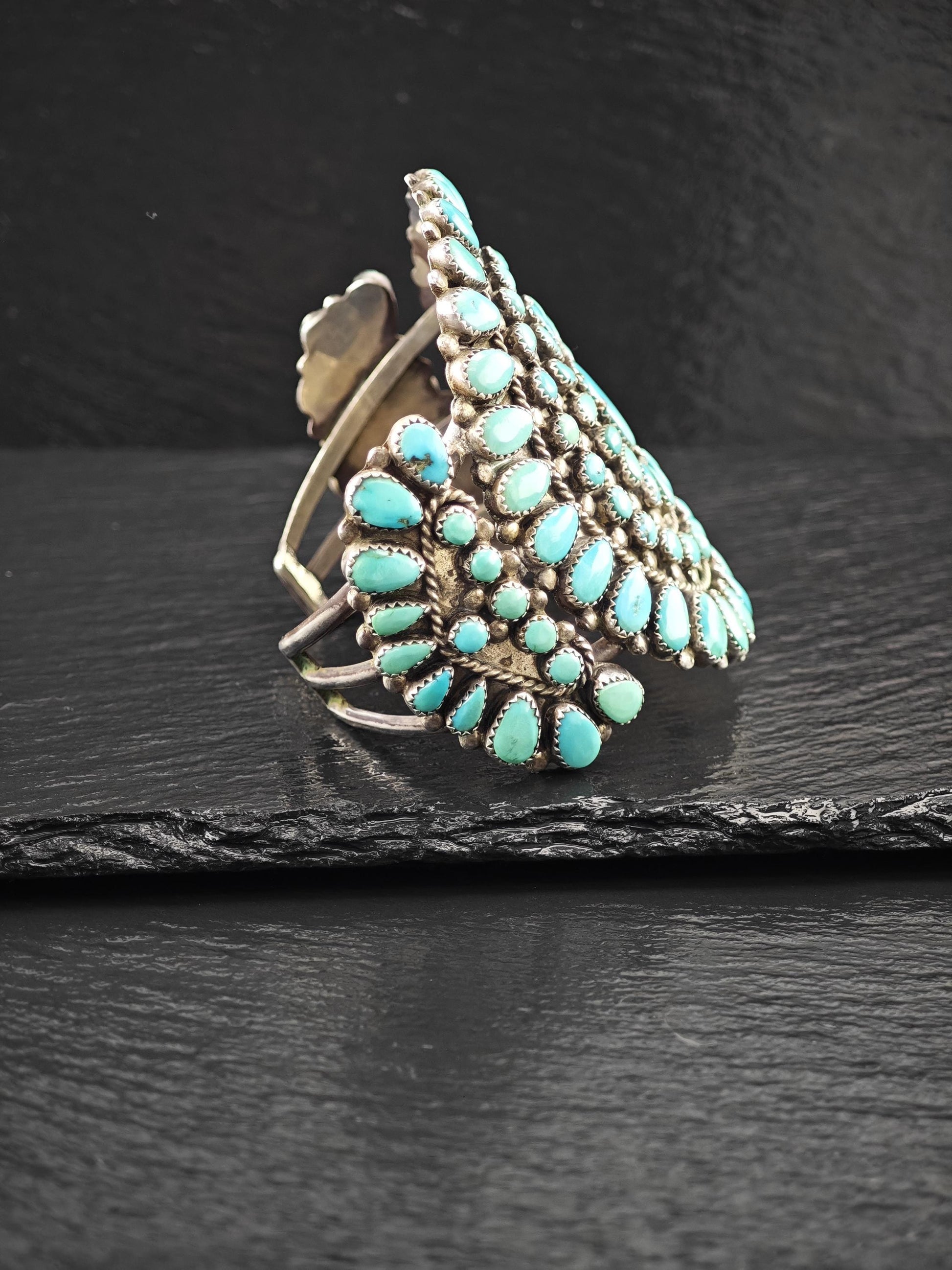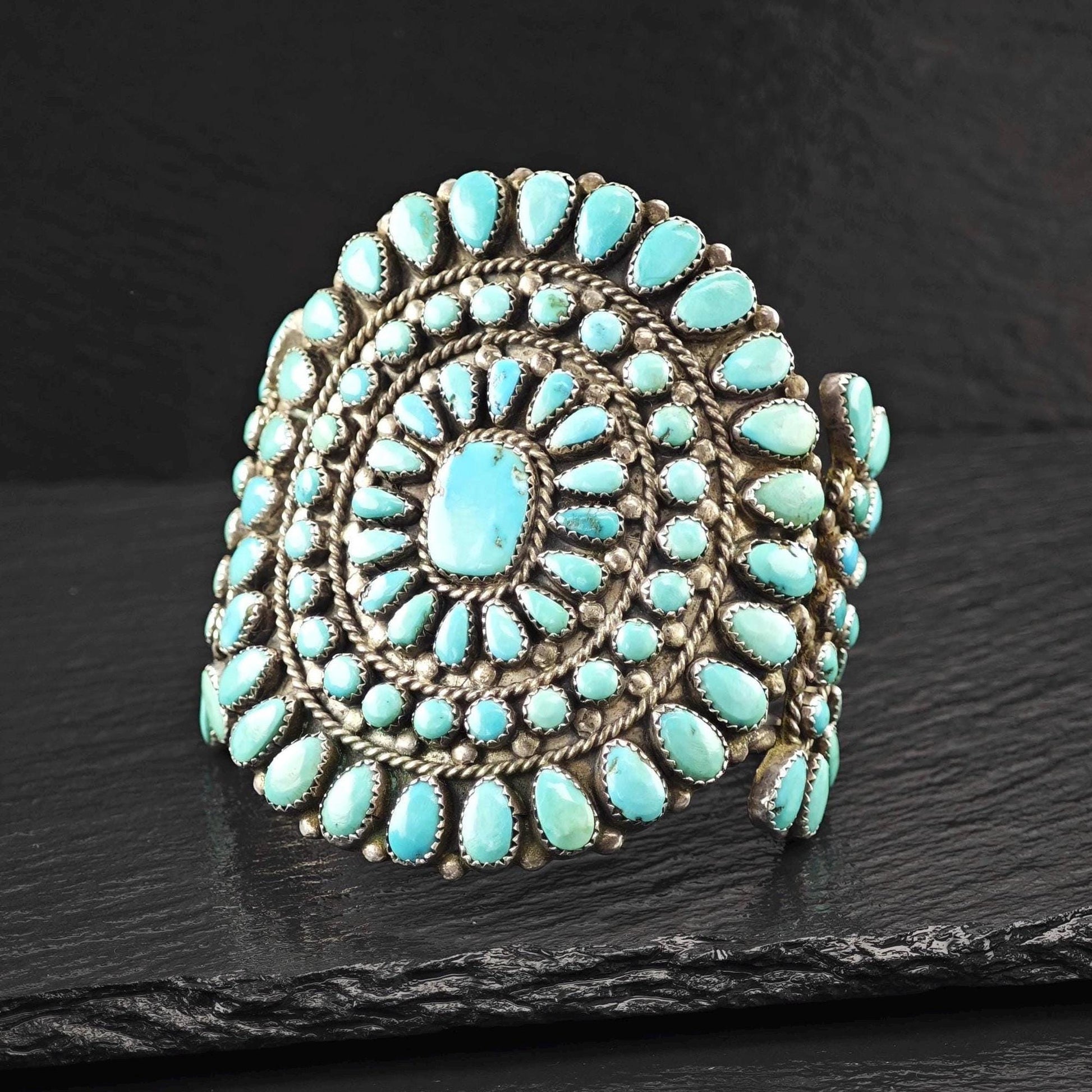 1950's Native American Large Cluster Turquoise Cuff Bracelet Sterling Silver