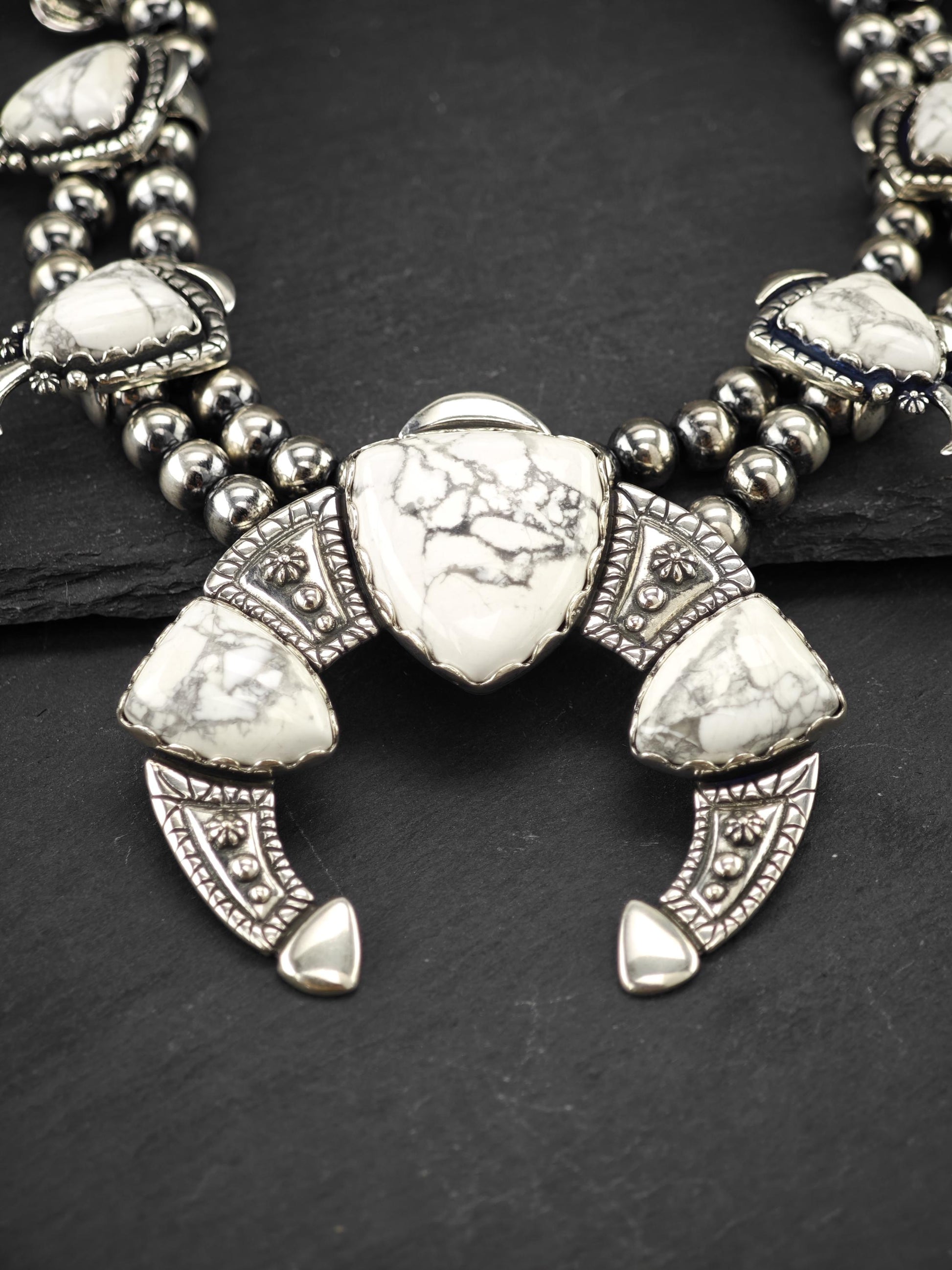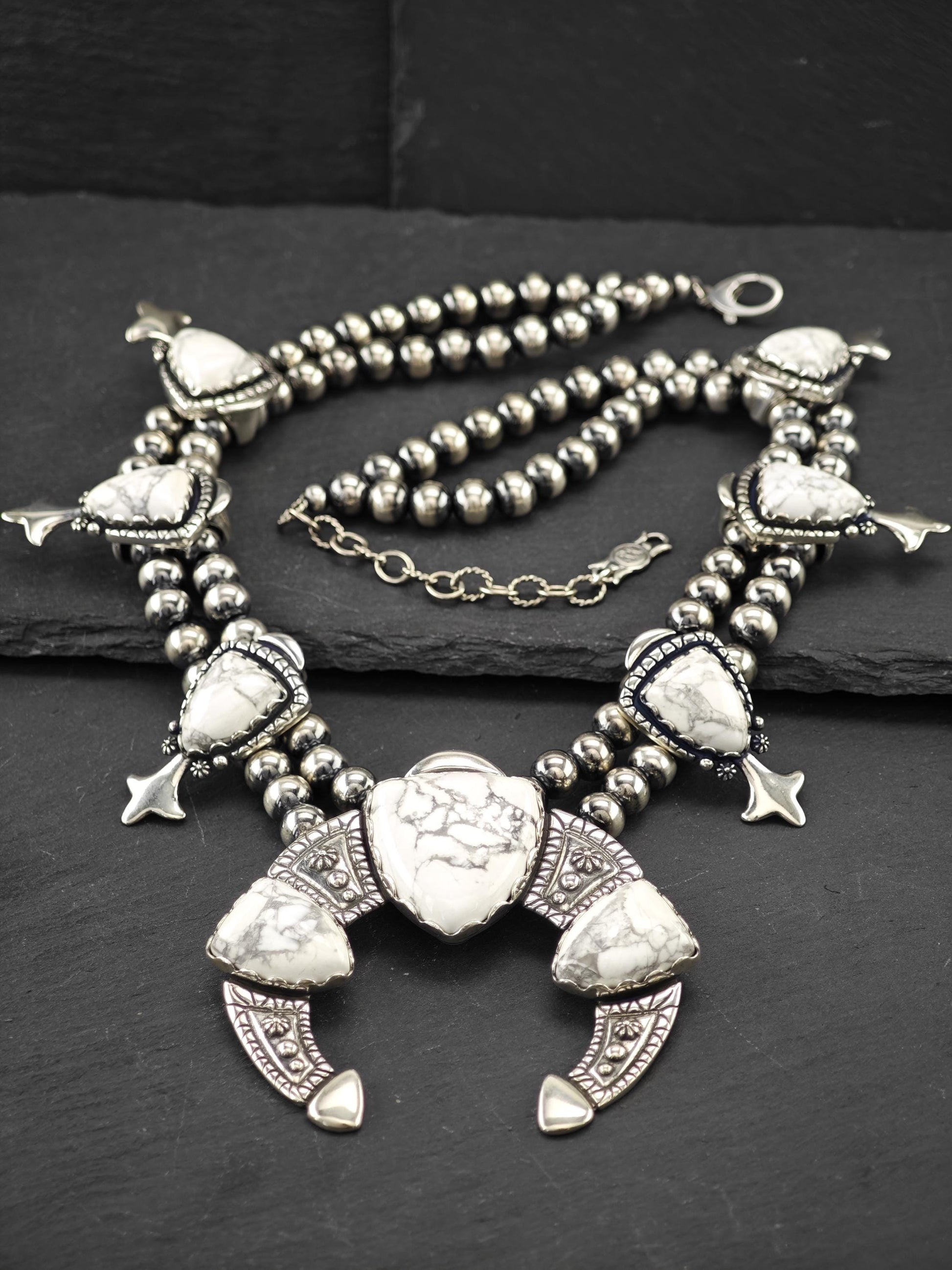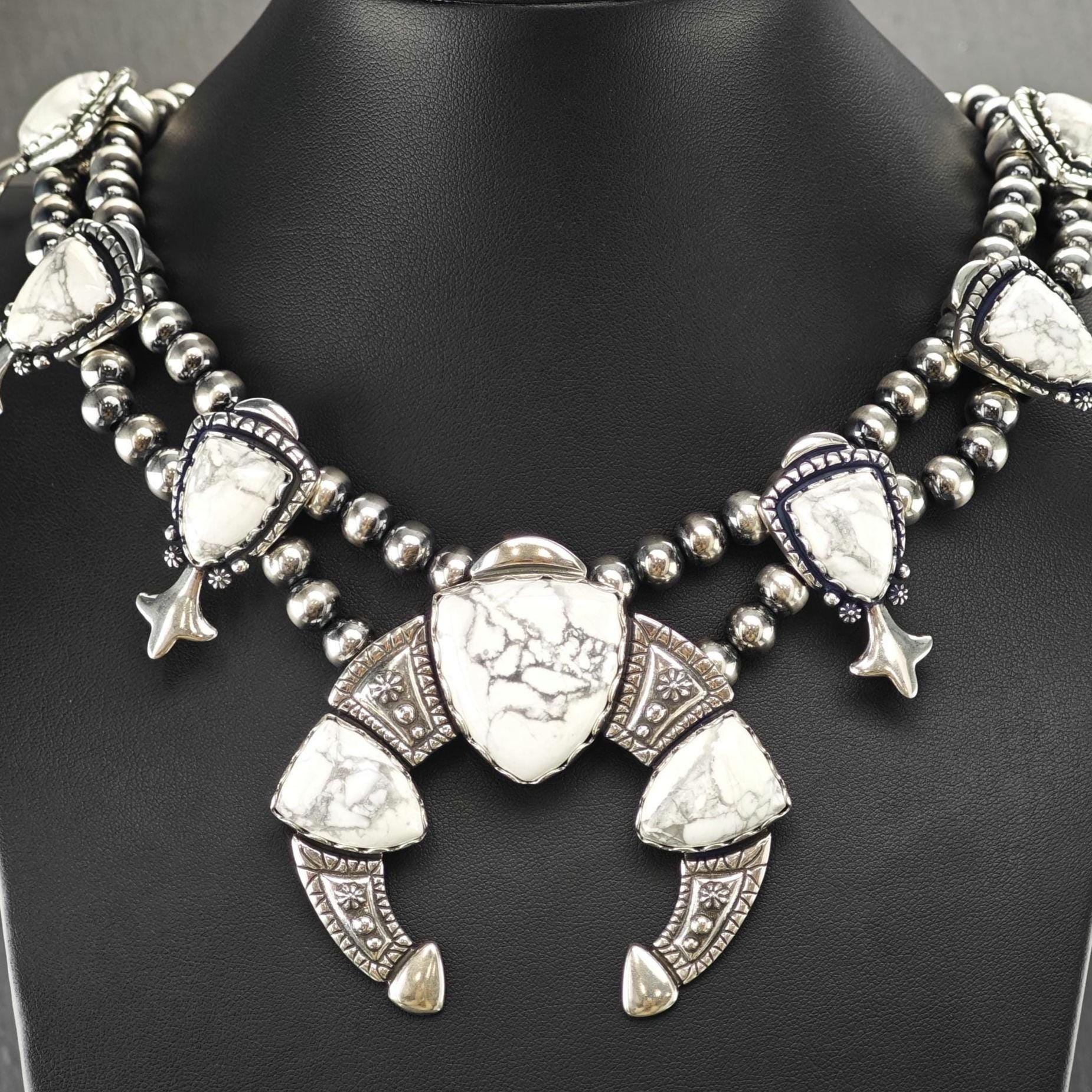 Vintage American West, Carolyn Pollack Sterling Silver White Howlite Arrowhead Squash Blossom Necklace