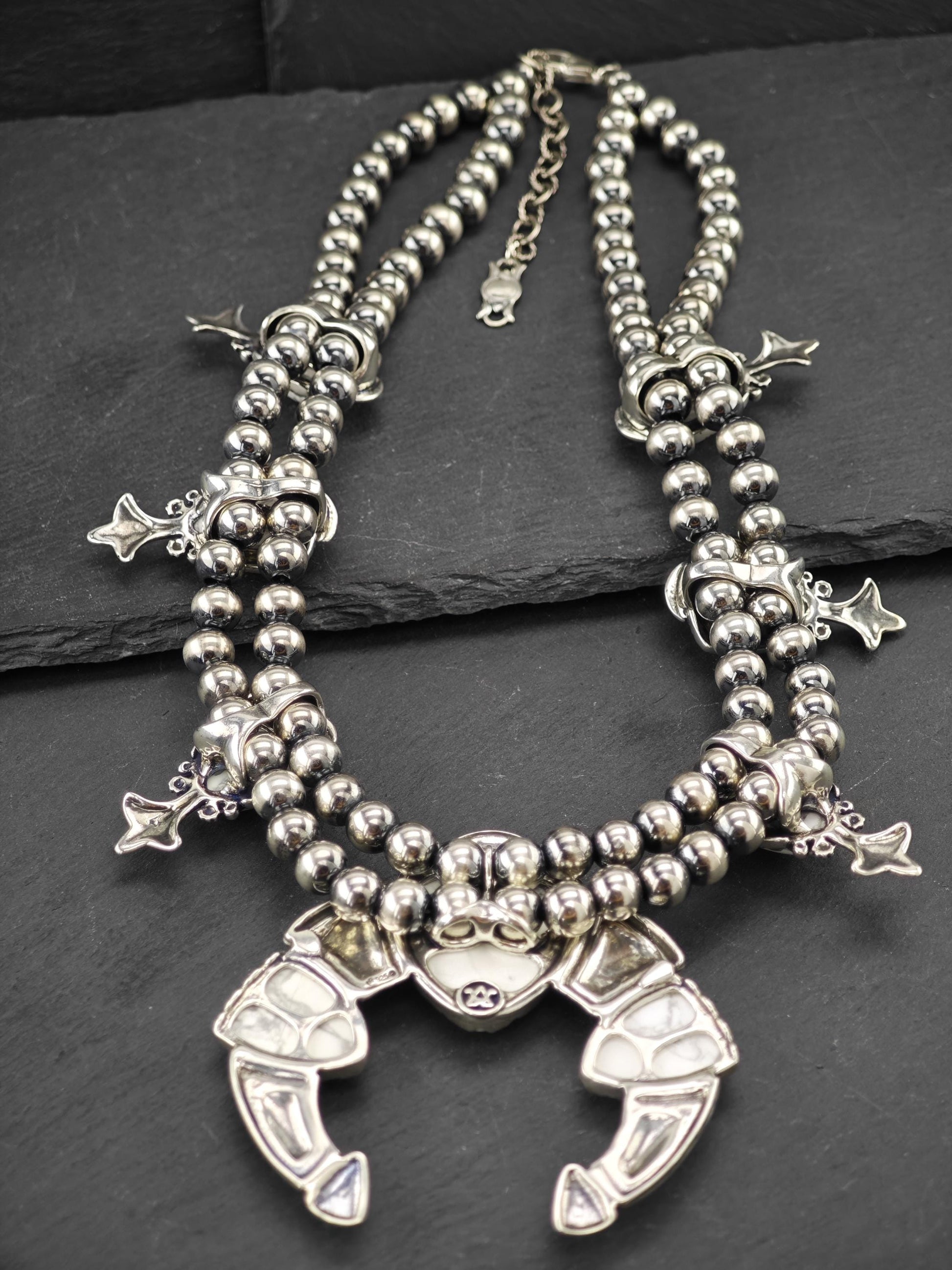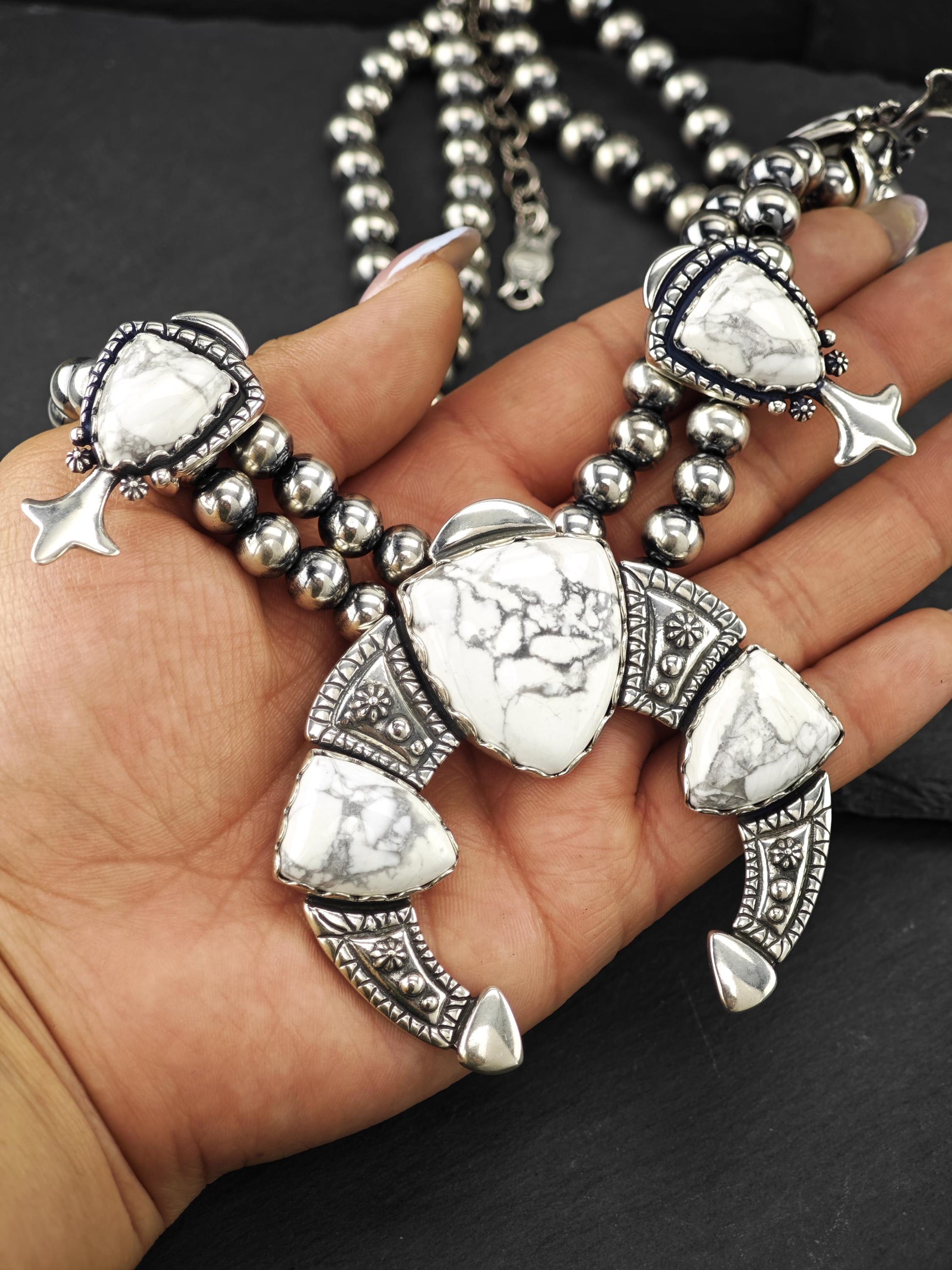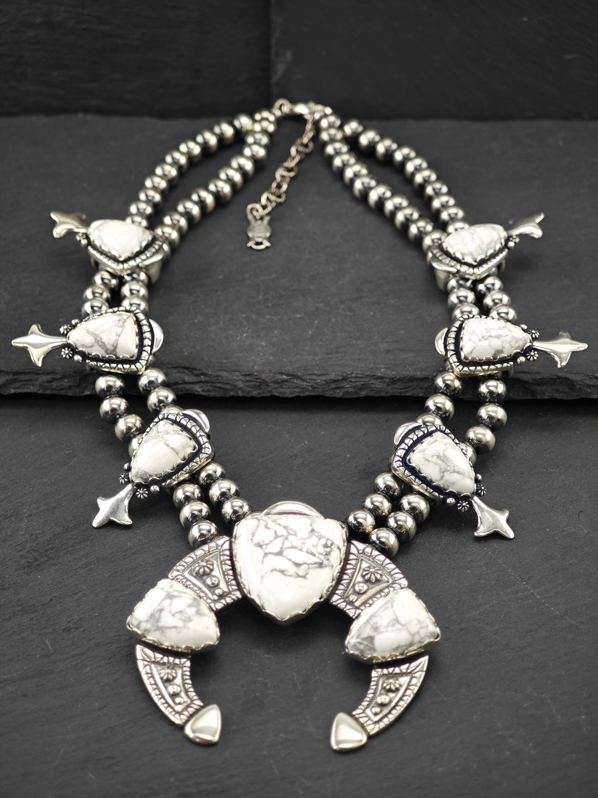 Vintage American West, Carolyn Pollack Sterling Silver White Howlite Arrowhead Squash Blossom Necklace