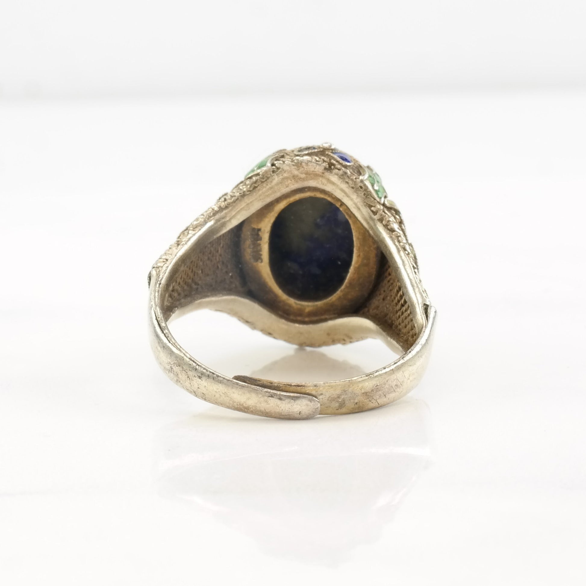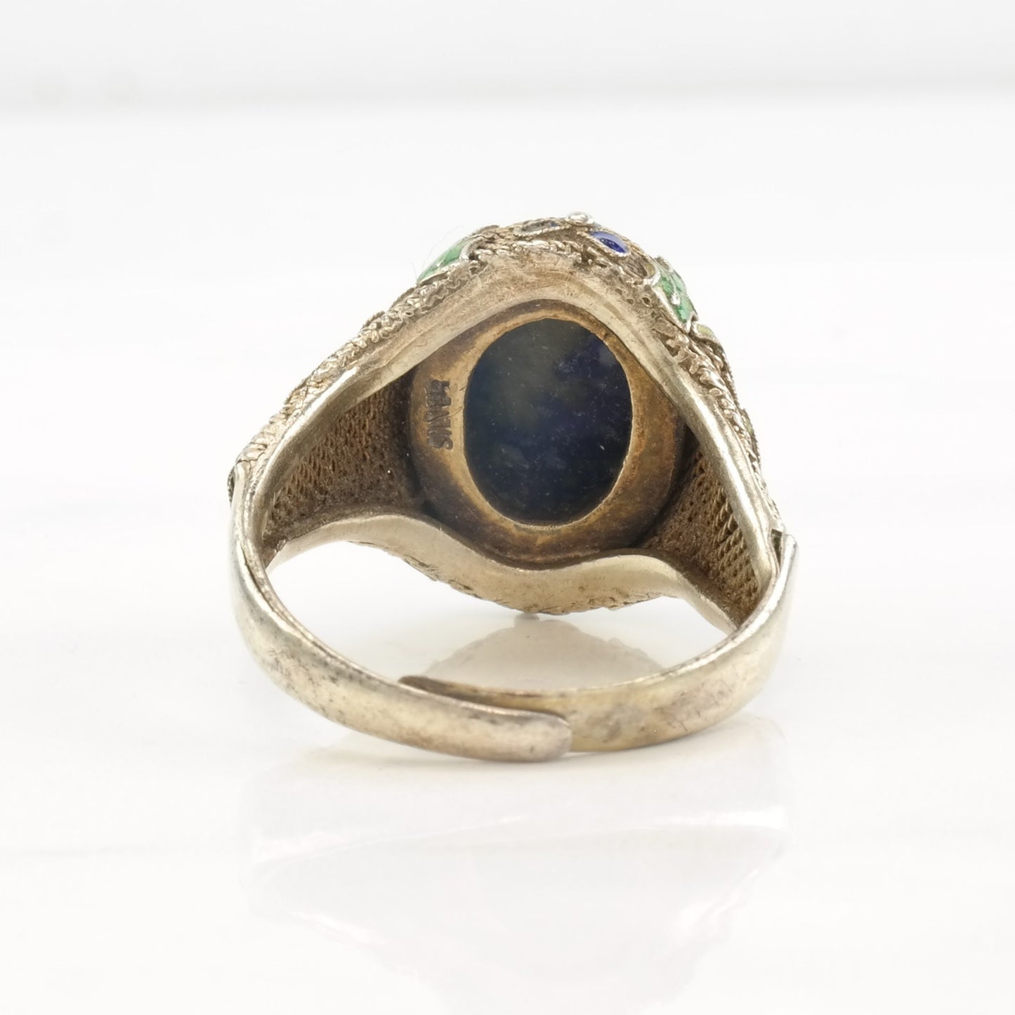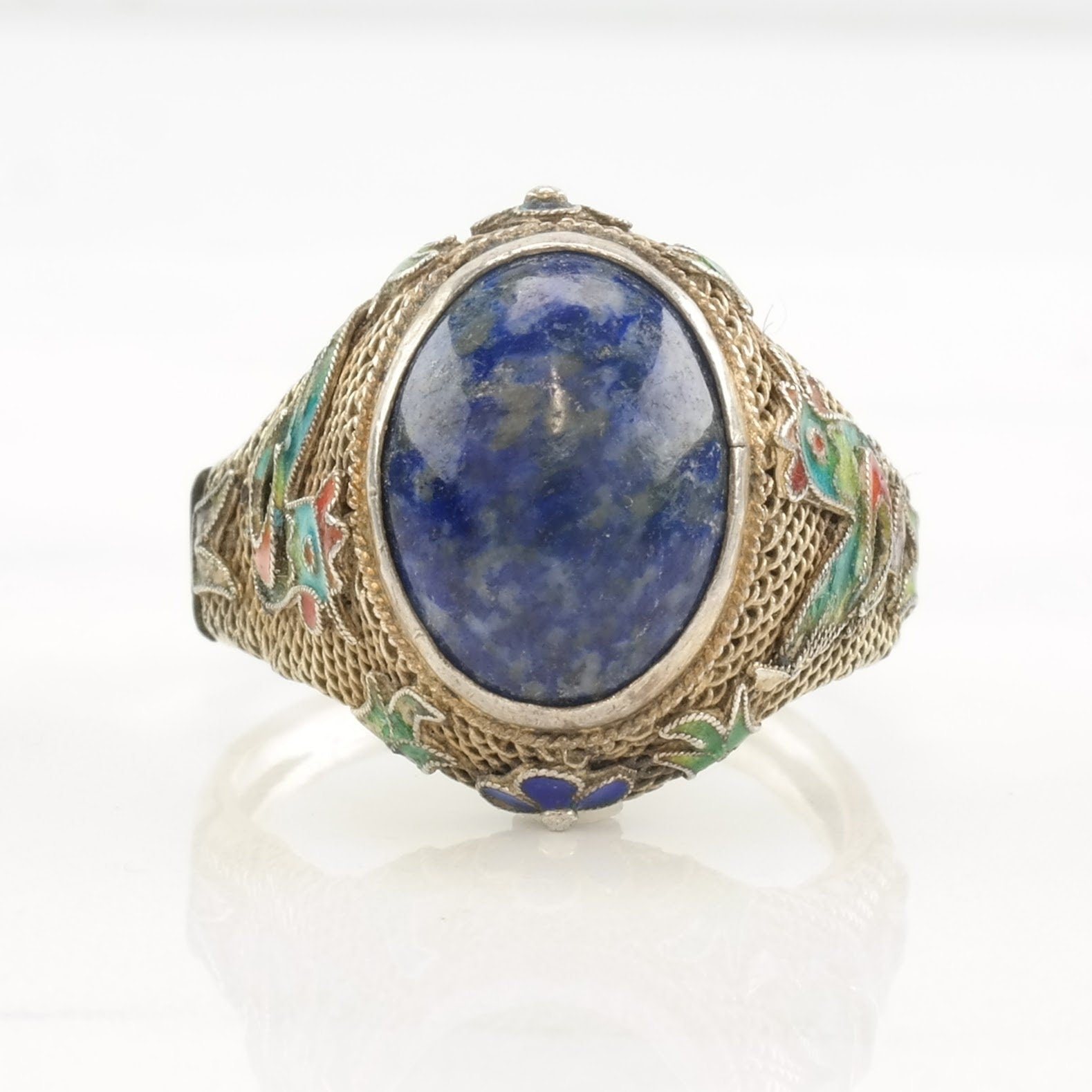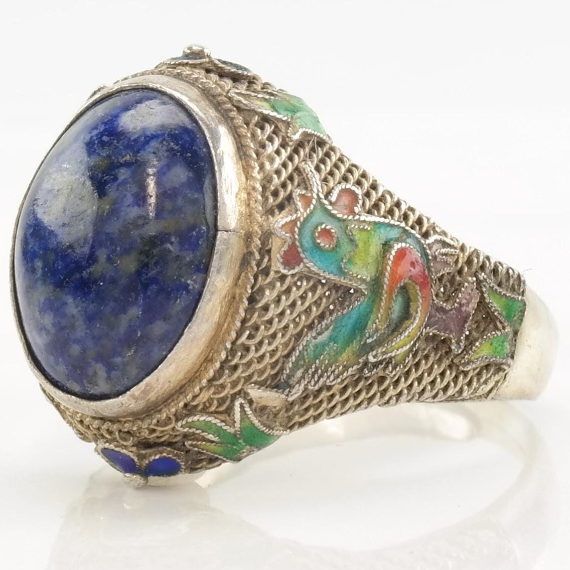 Antique Chinese Ring Lapis Lazuli Enamel, Chicken, Filigree Sterling Silver Size 9 - 9 1/2