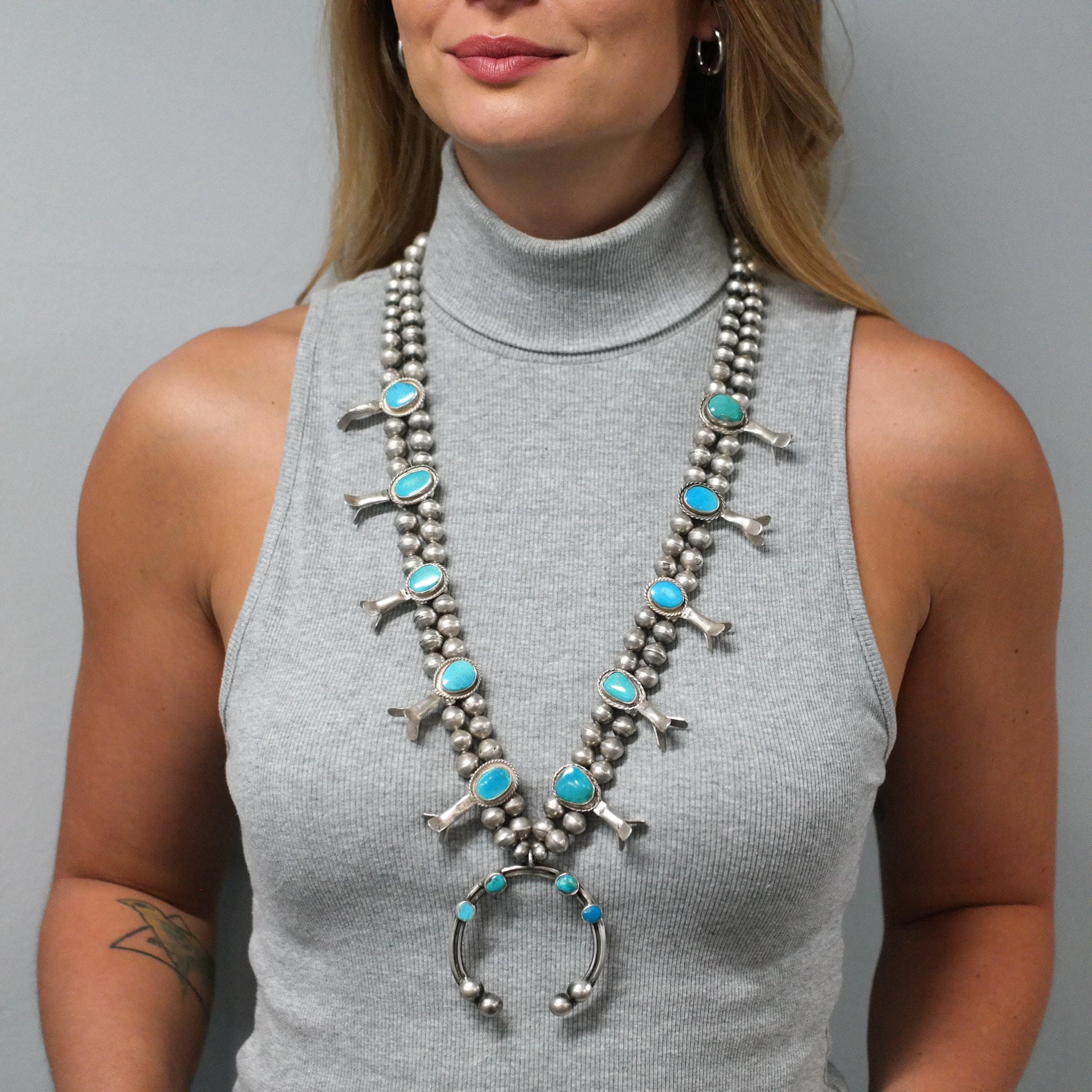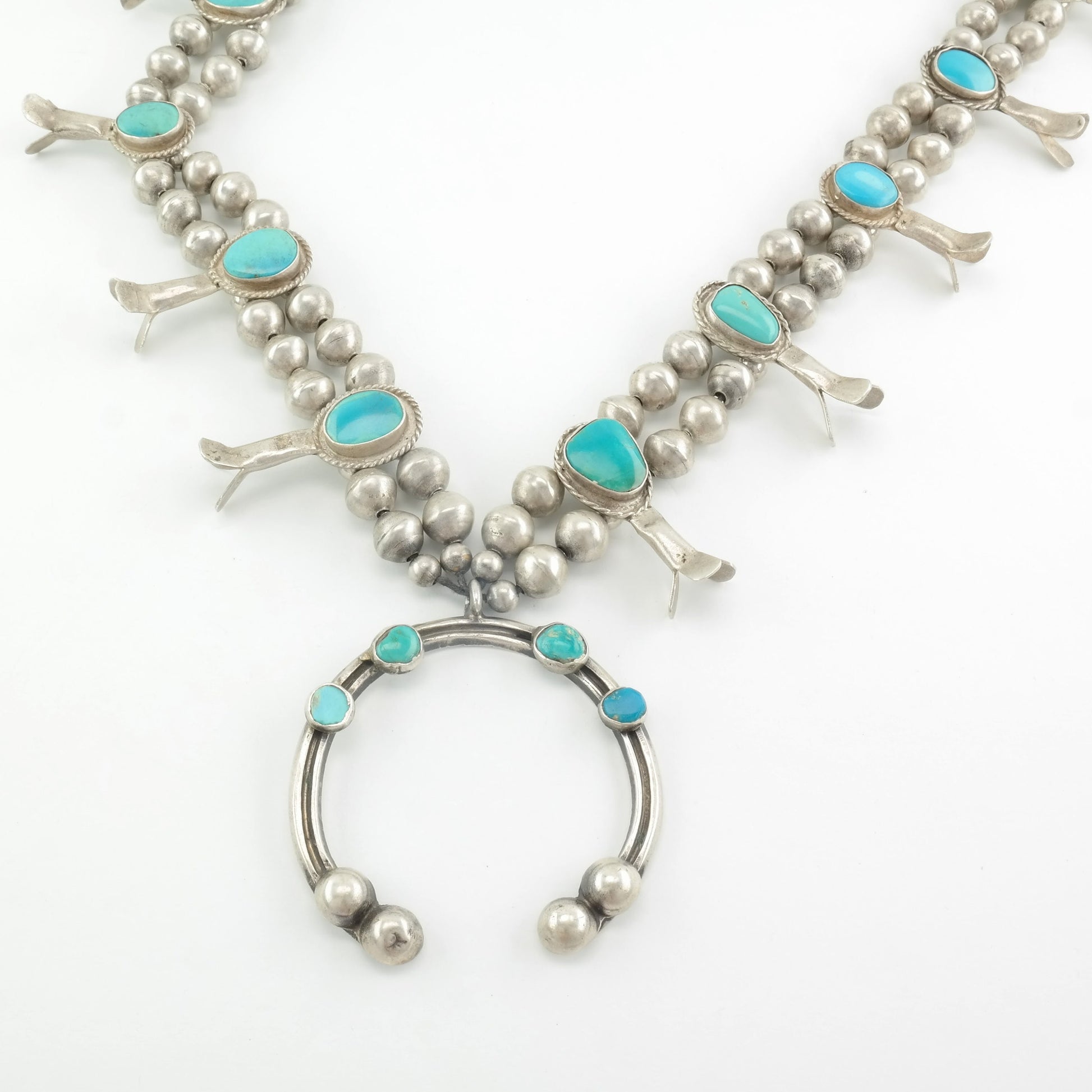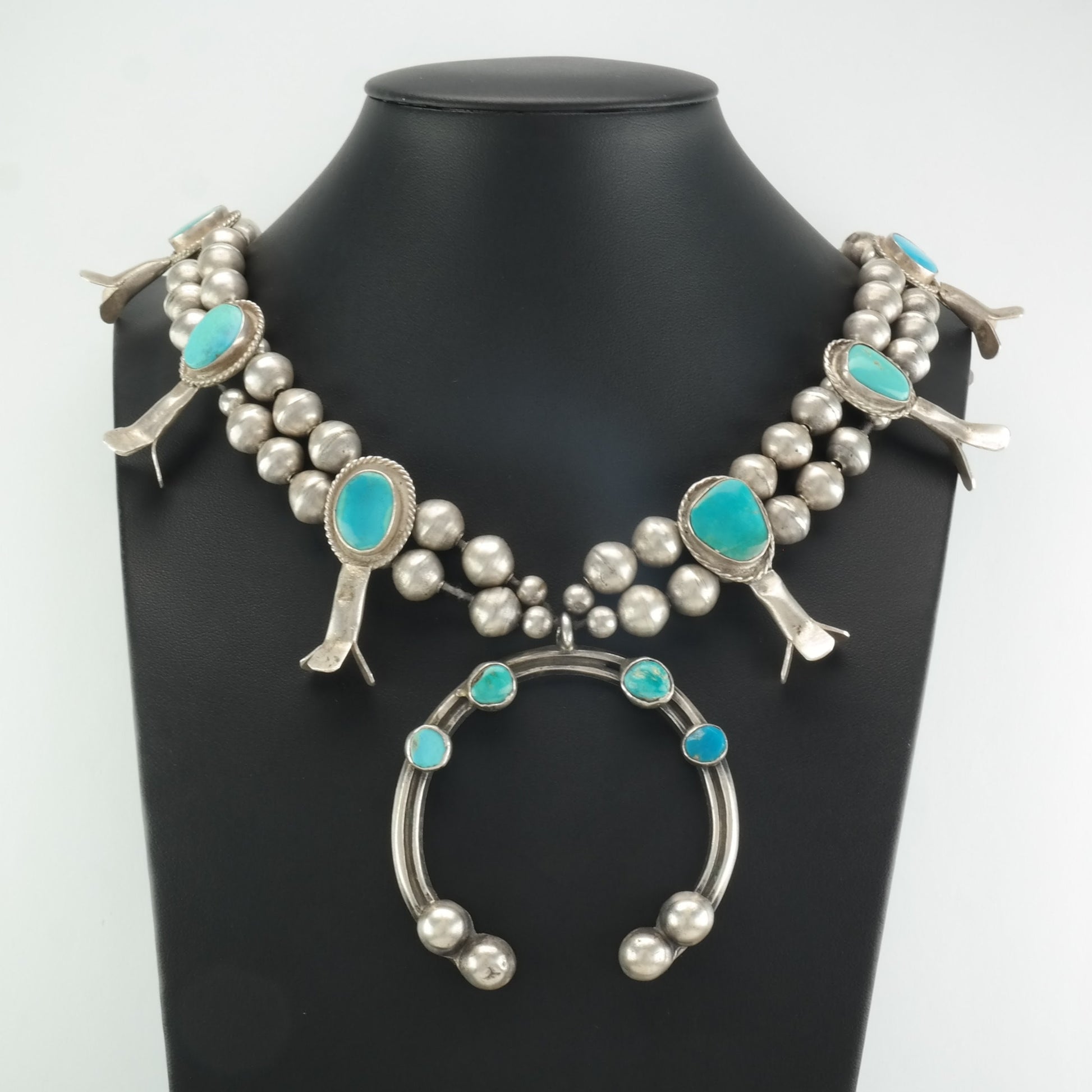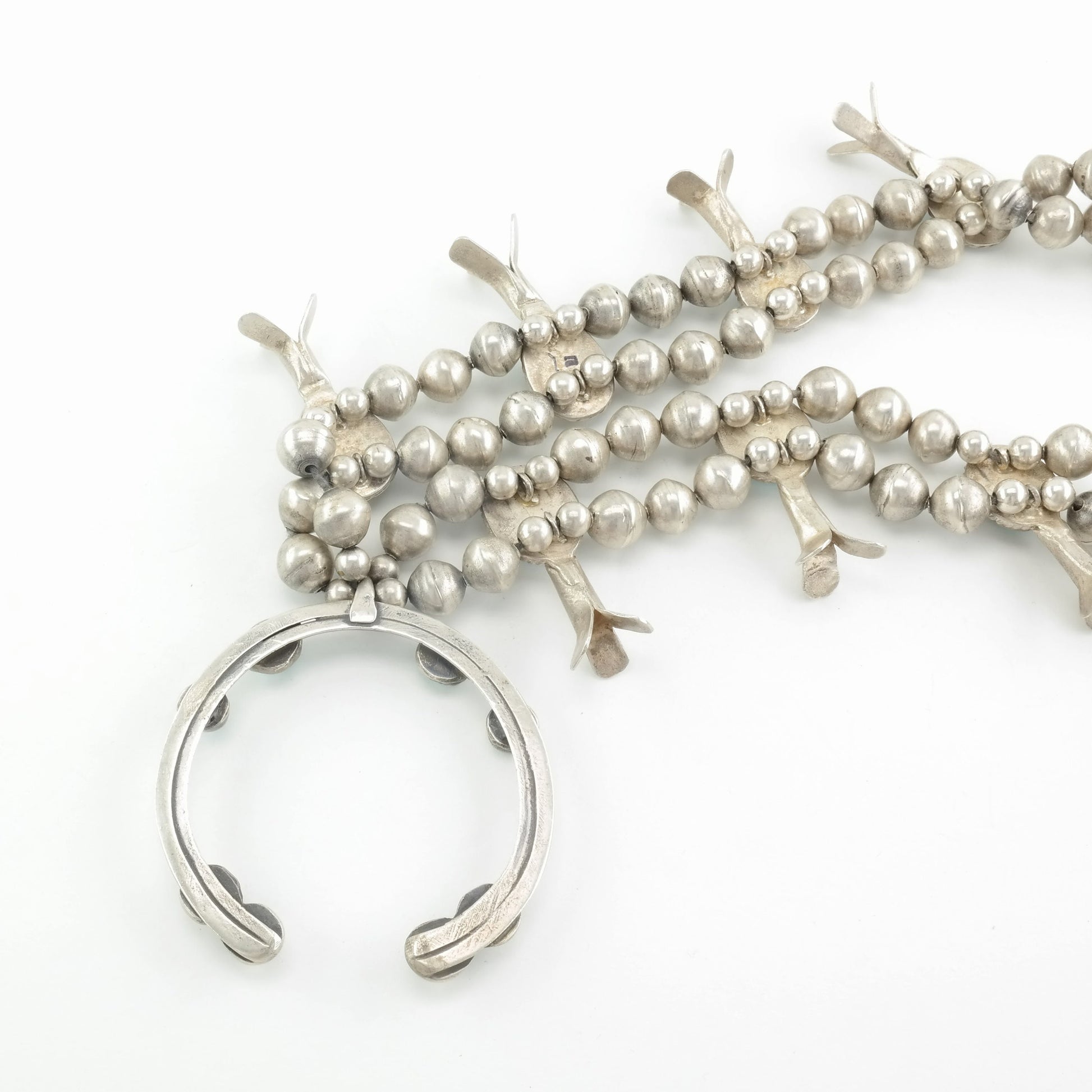 Antique Native American Sterling Silver Blue Turquoise Hand Made Beads Necklace Squash Blossom