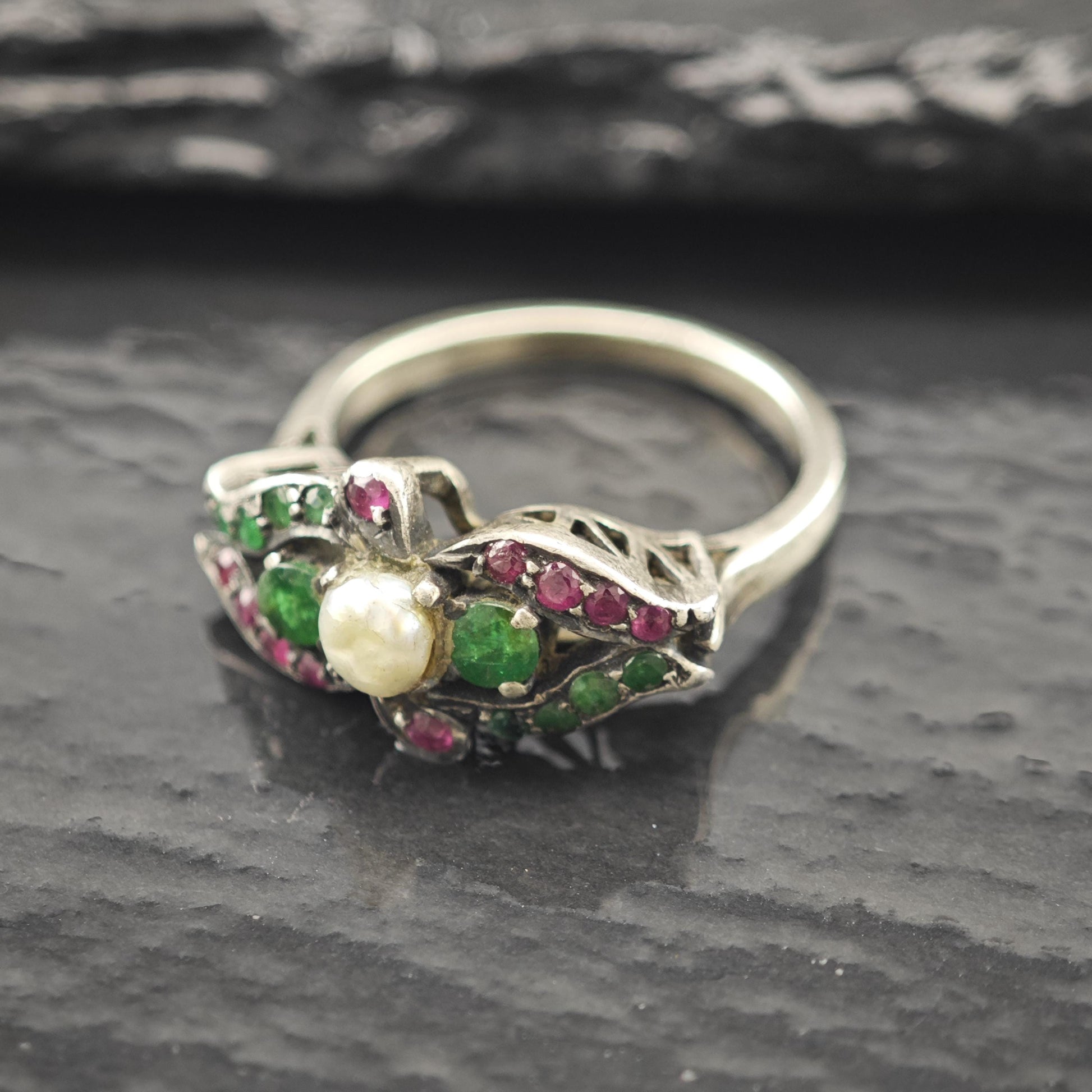 Discover the timeless charm of this antique Victorian ring, featuring a stunning emerald, ruby, and natural pearl set in sterling silver. This vintage ring captures the elegance and intricate craftsmanship of a bygone era, perfect for those who appreciate unique vintage jewelry. Whether you're searching for a special gift for her or a distinctive addition to your collection, this sterling silver ring offers both history and beauty.