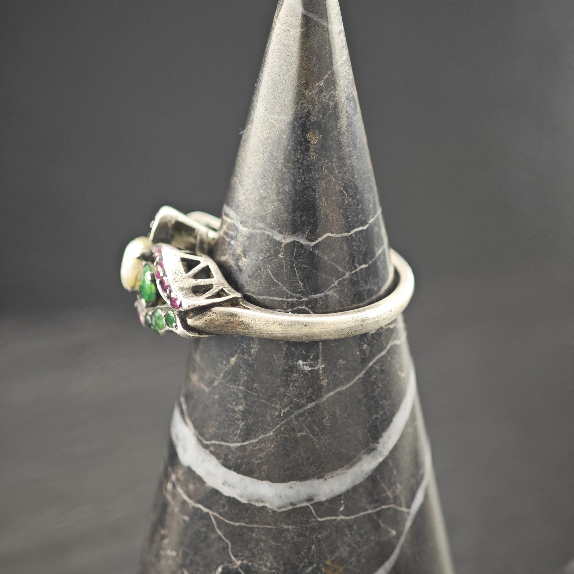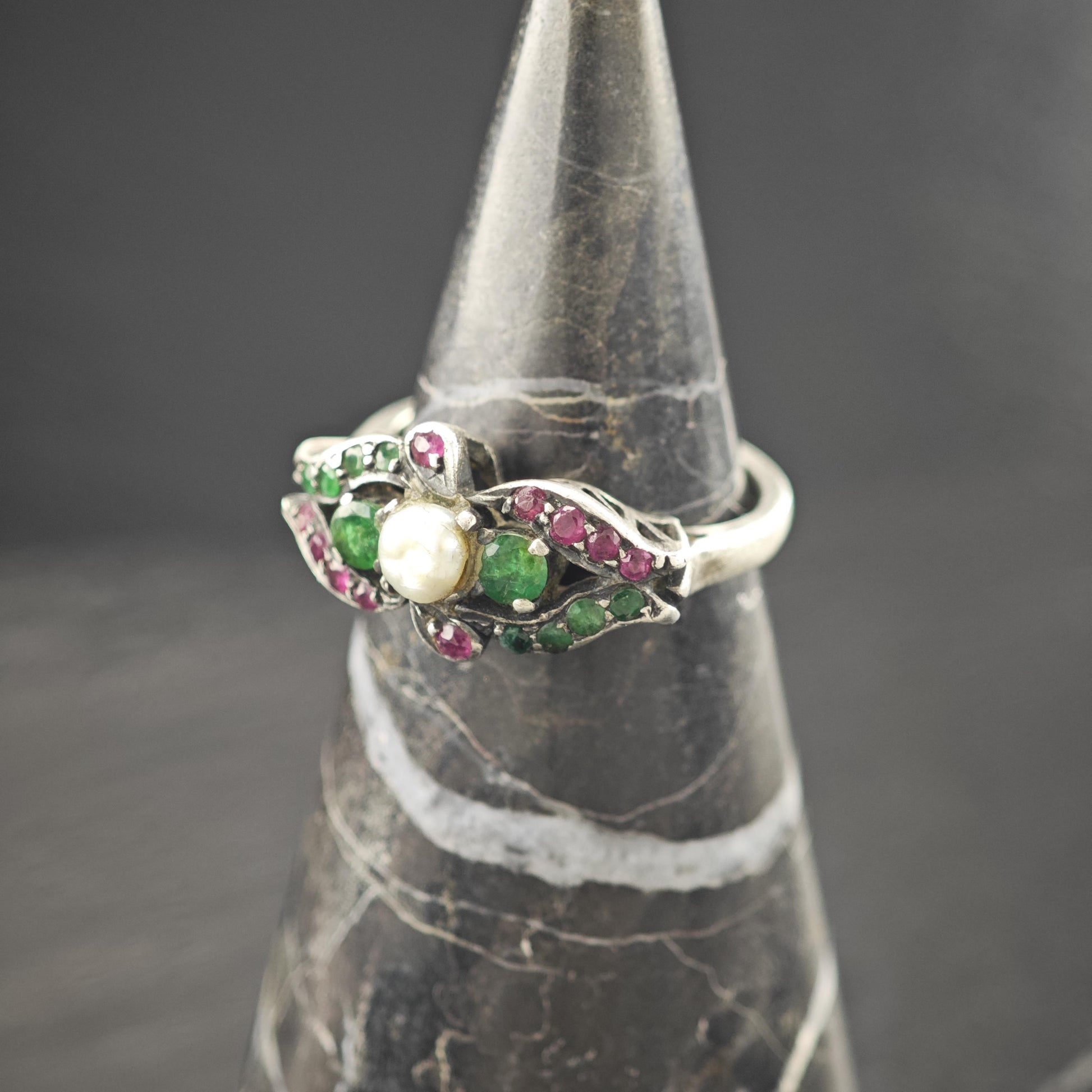 Antique Victorian Emerald Ruby Natural Pearl Ring Sterling Silver Size 6 3/4