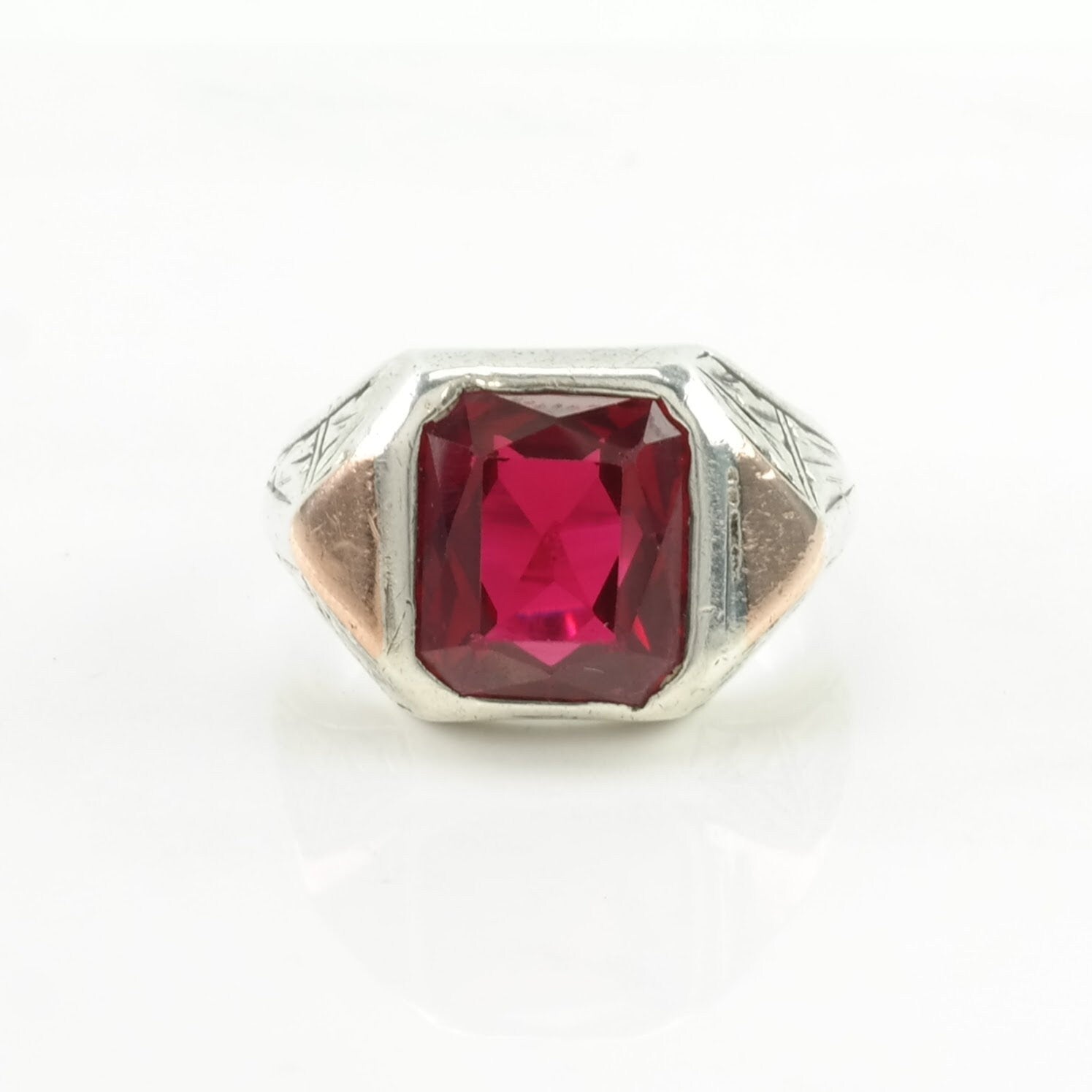 Art Deco Sterling Silver Ring Created Ruby Gold Accent Hand Engraved