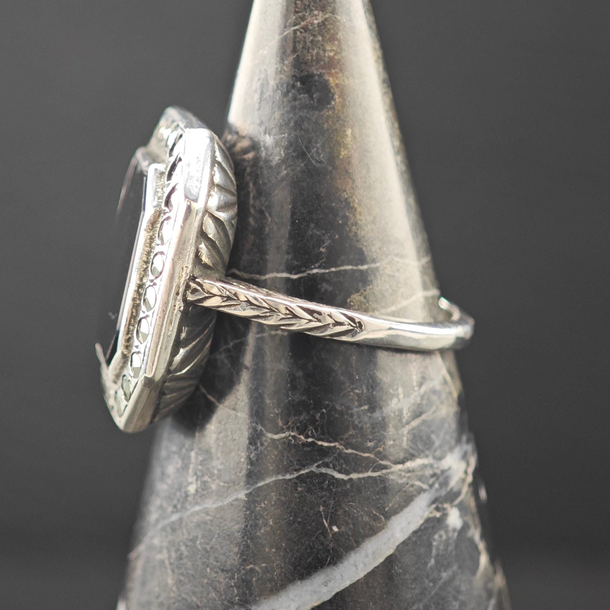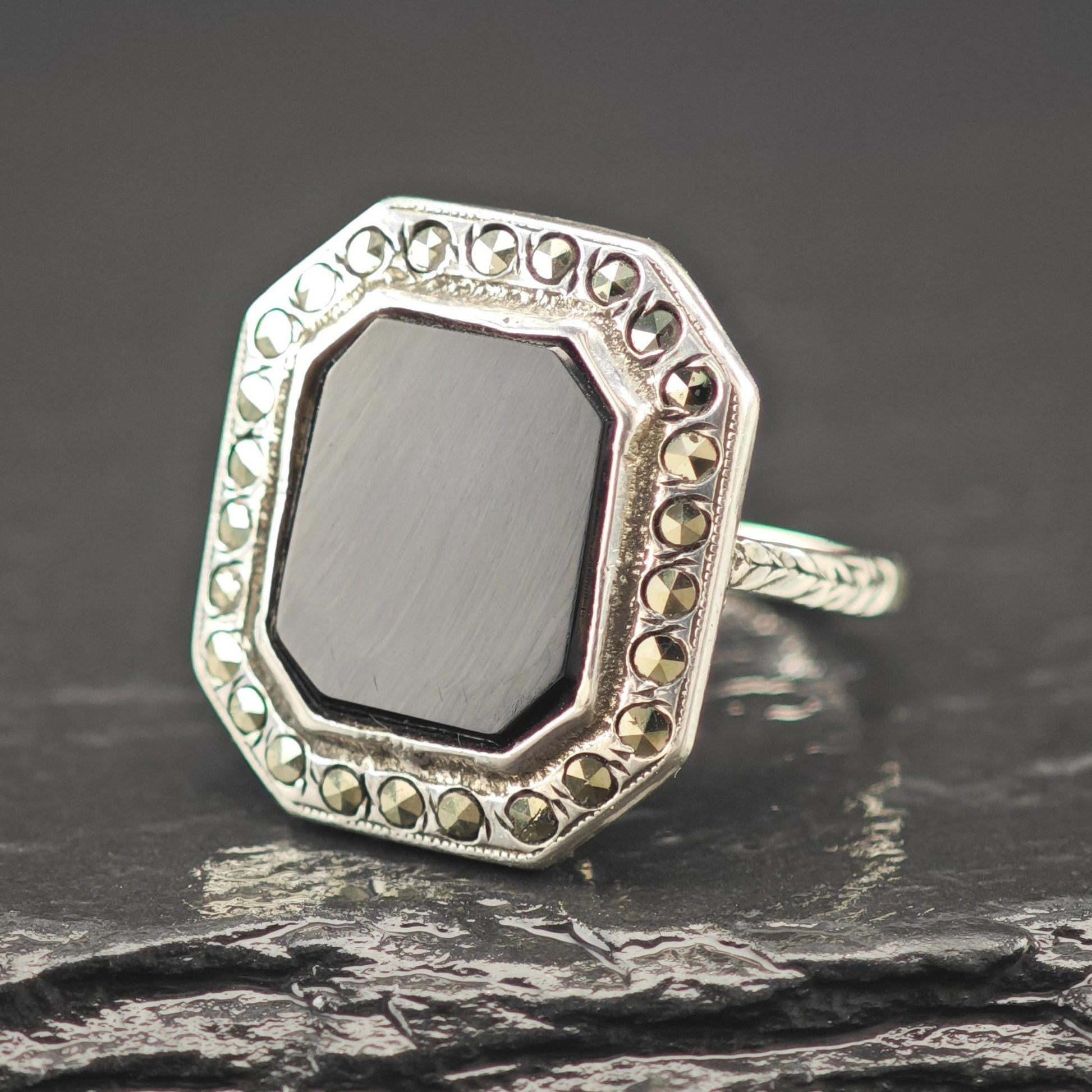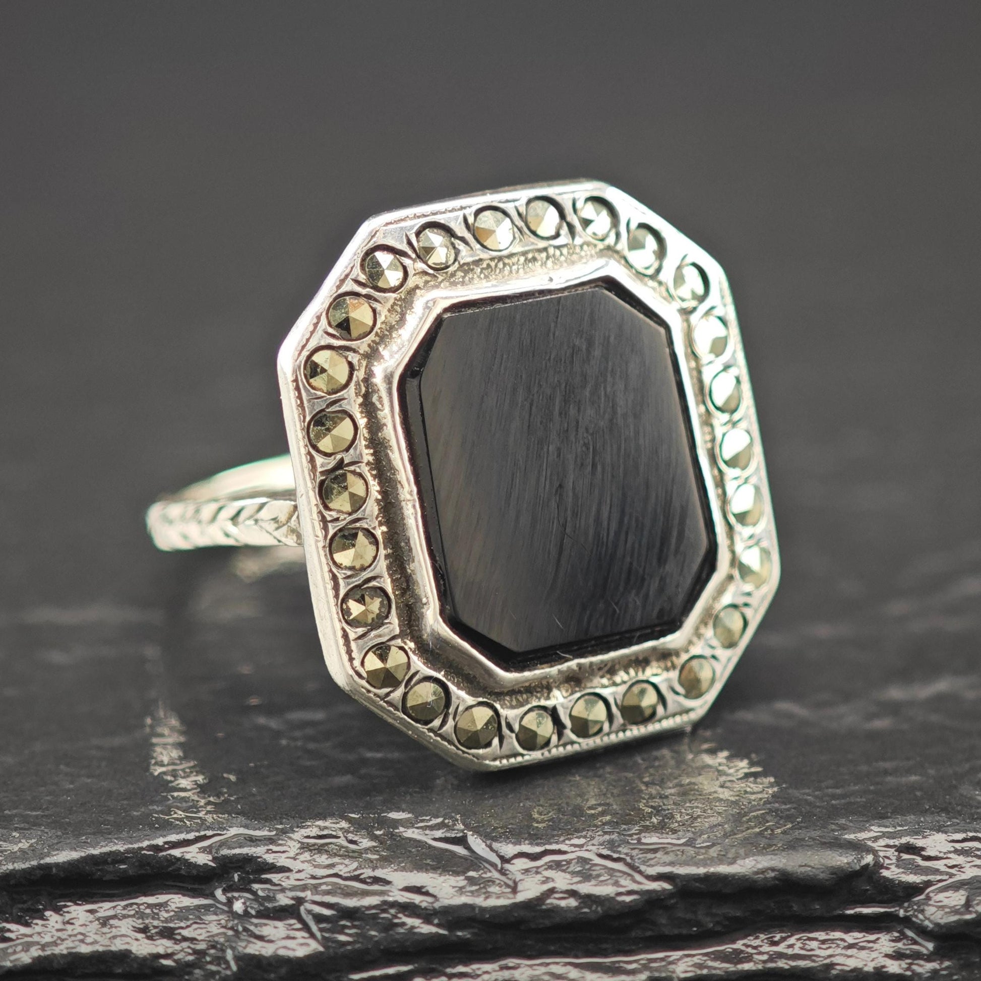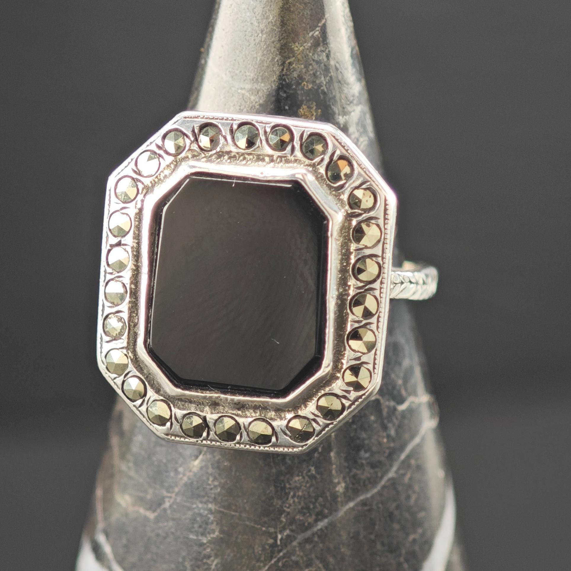 Art Deco Style, Squared Onyx Marcasite Ring Sterling Silver