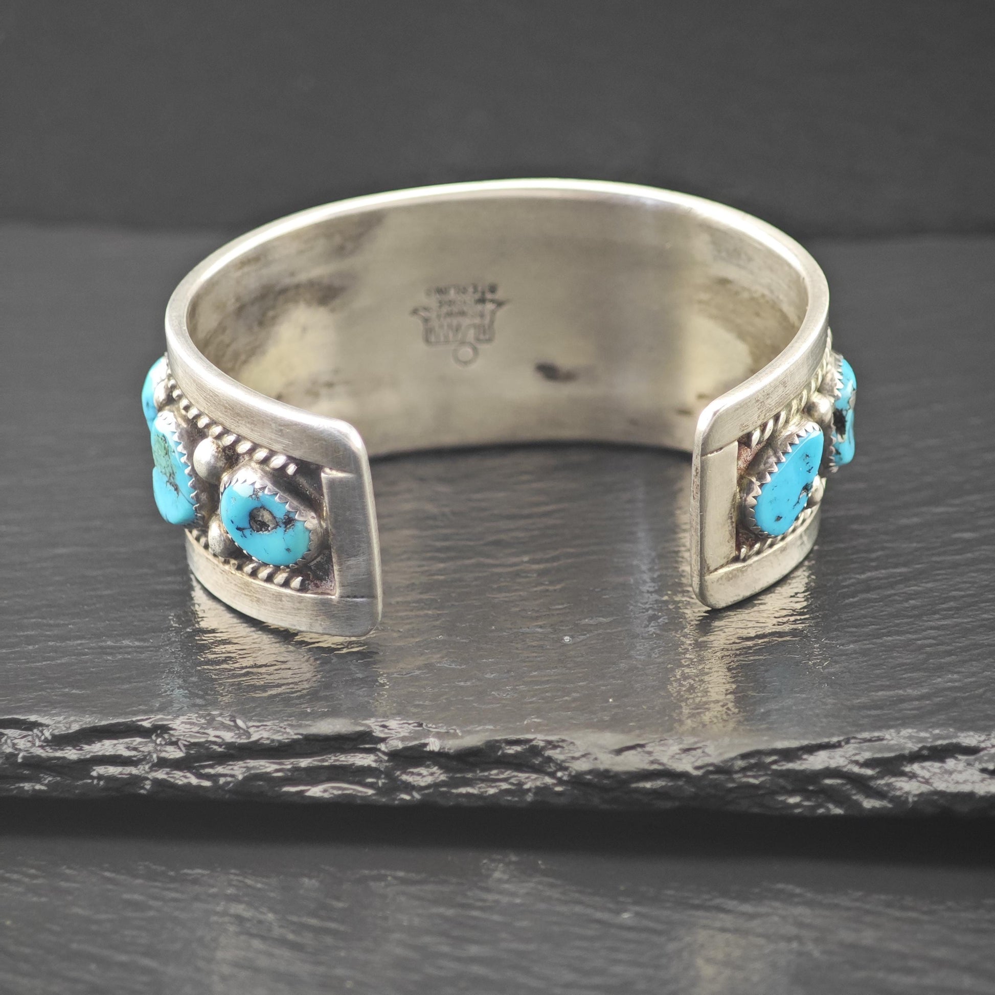 Discover this stunning turquoise watch cuff by renowned artisan Tommy Moore, expertly crafted from sterling silver. This unique piece features the Tommy Moore hallmark, ensuring its authenticity and quality. Designed to fit a wrist size of 6 3/4 inches, the cuff measures 5 5/8 inches from tip to tip and has a width of 1 1/4 inches. Weighing 81.6 grams, this cuff is both substantial and comfortable to wear.
