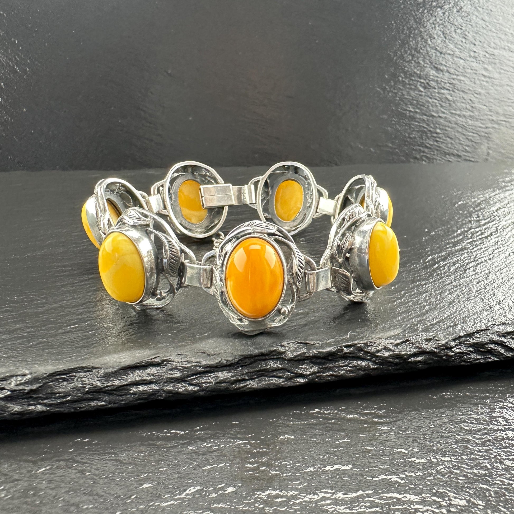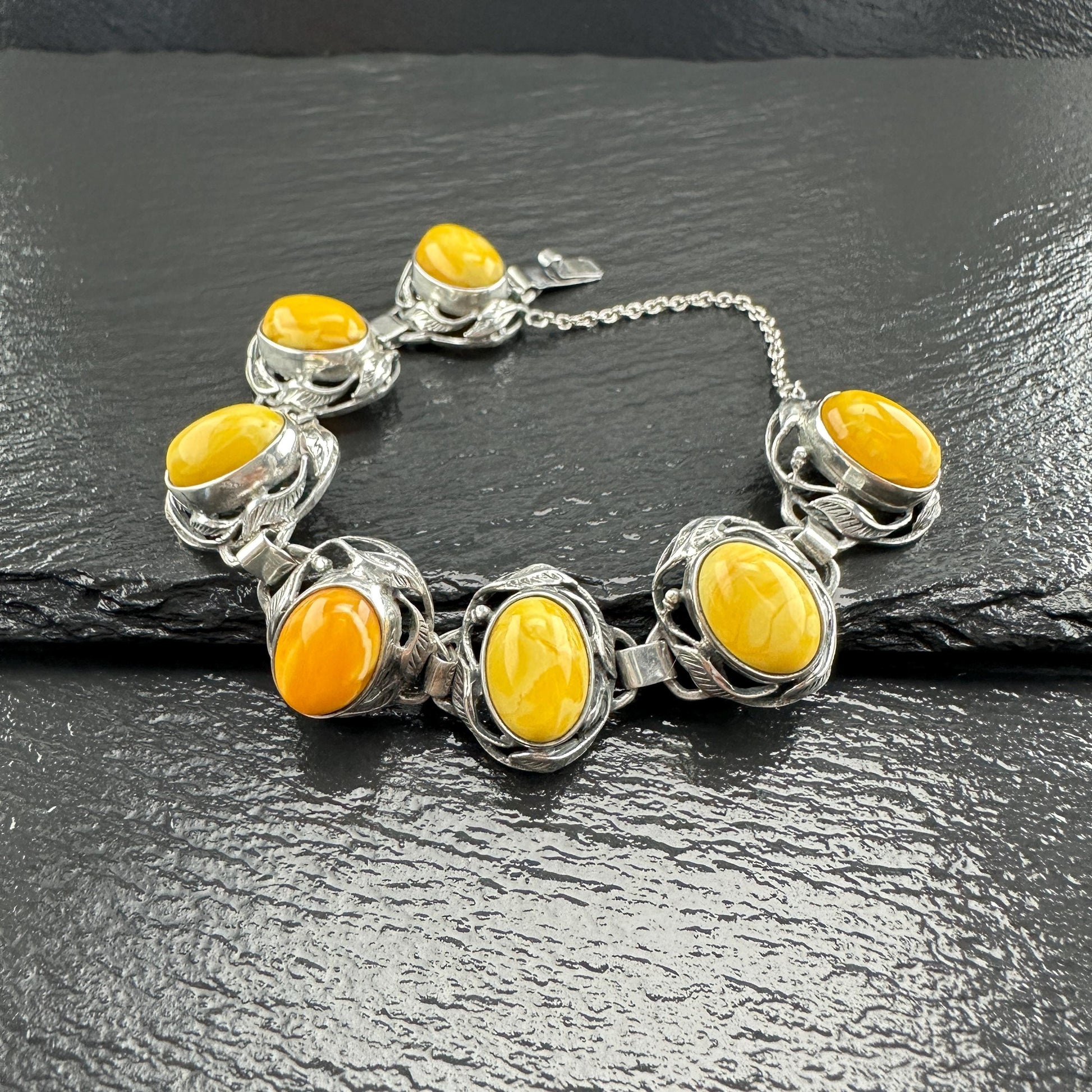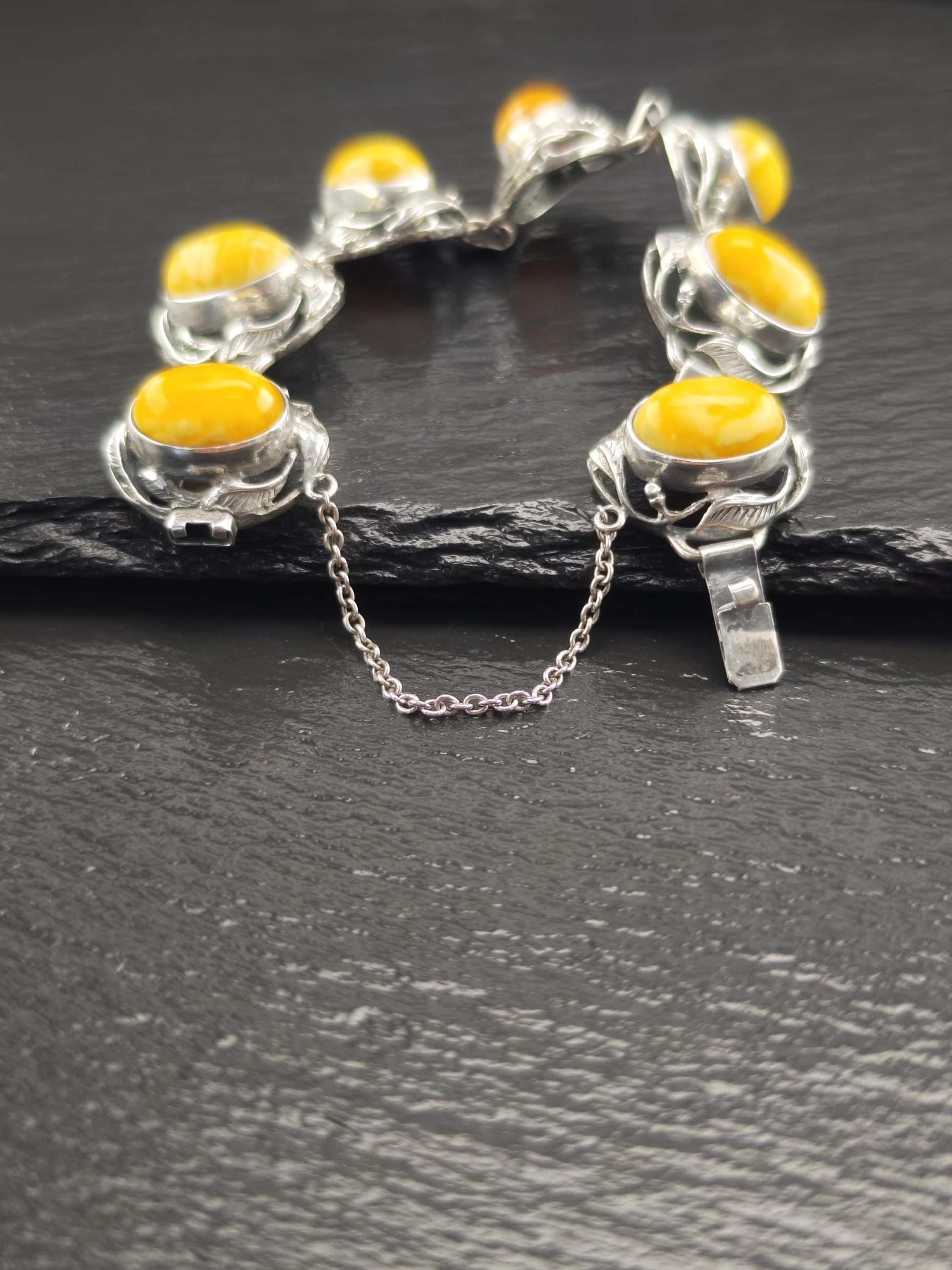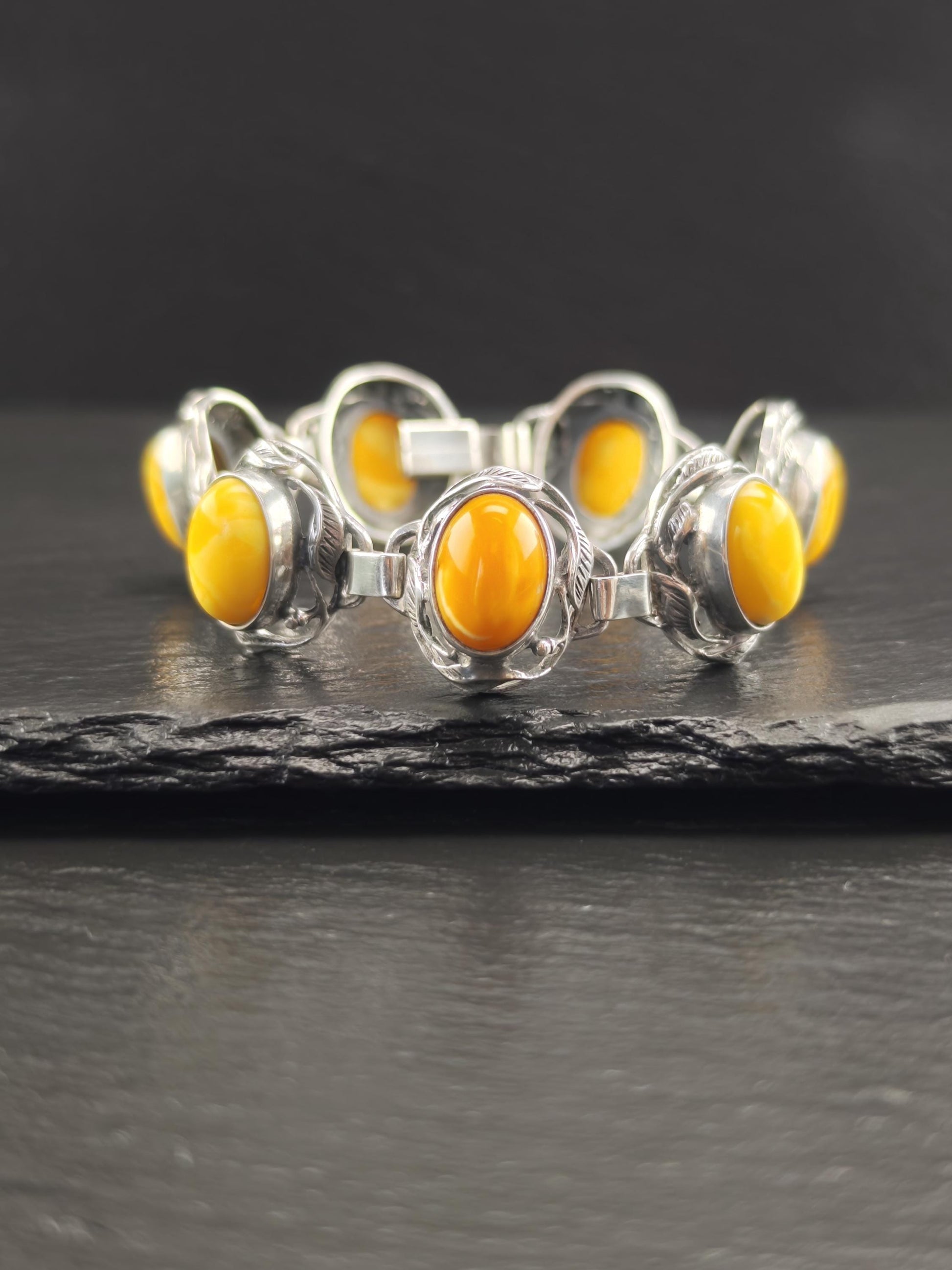 Baltic Amber Bracelet in Art Nouveau Style Yellow Opaque Sterling Silver