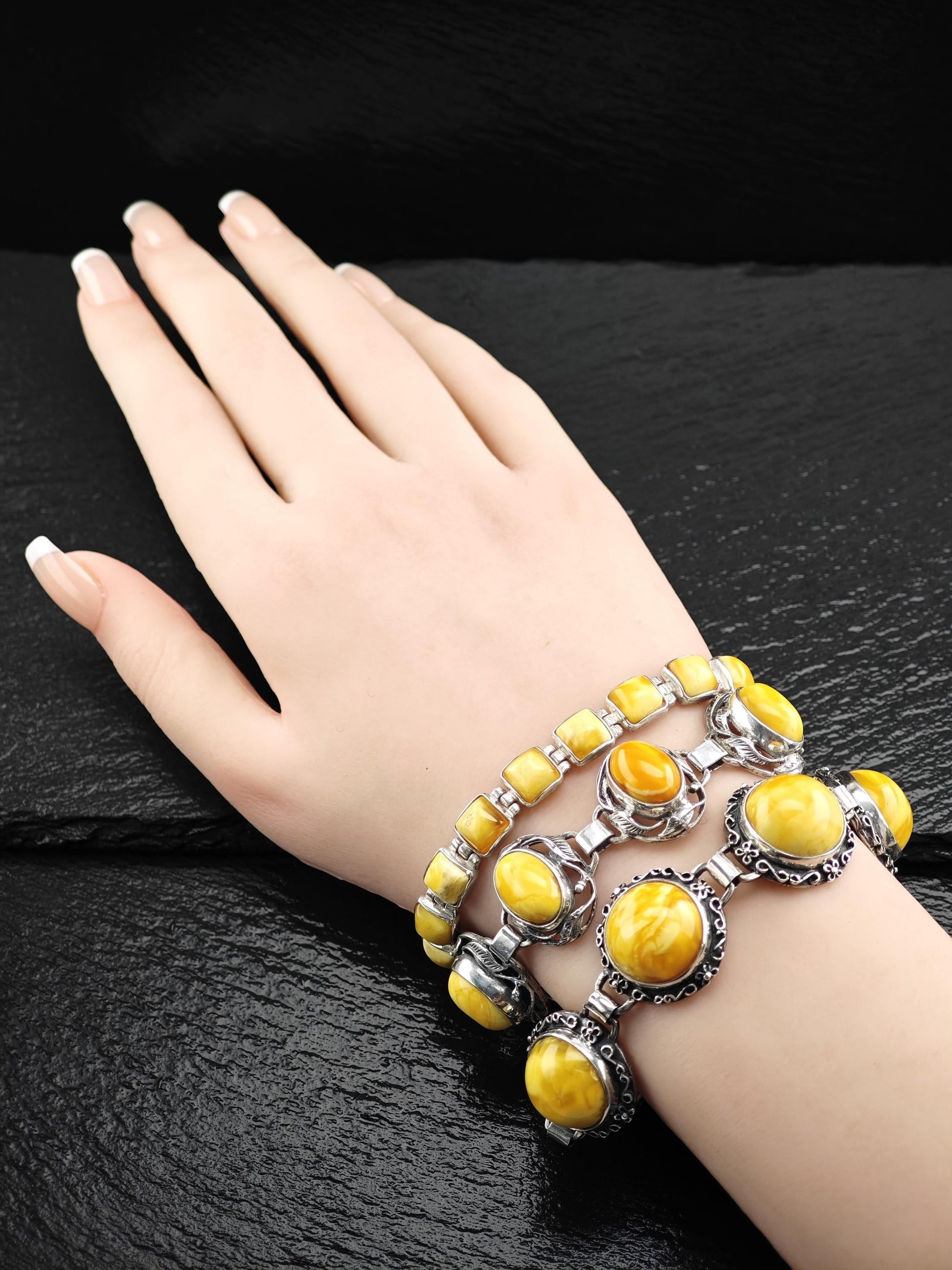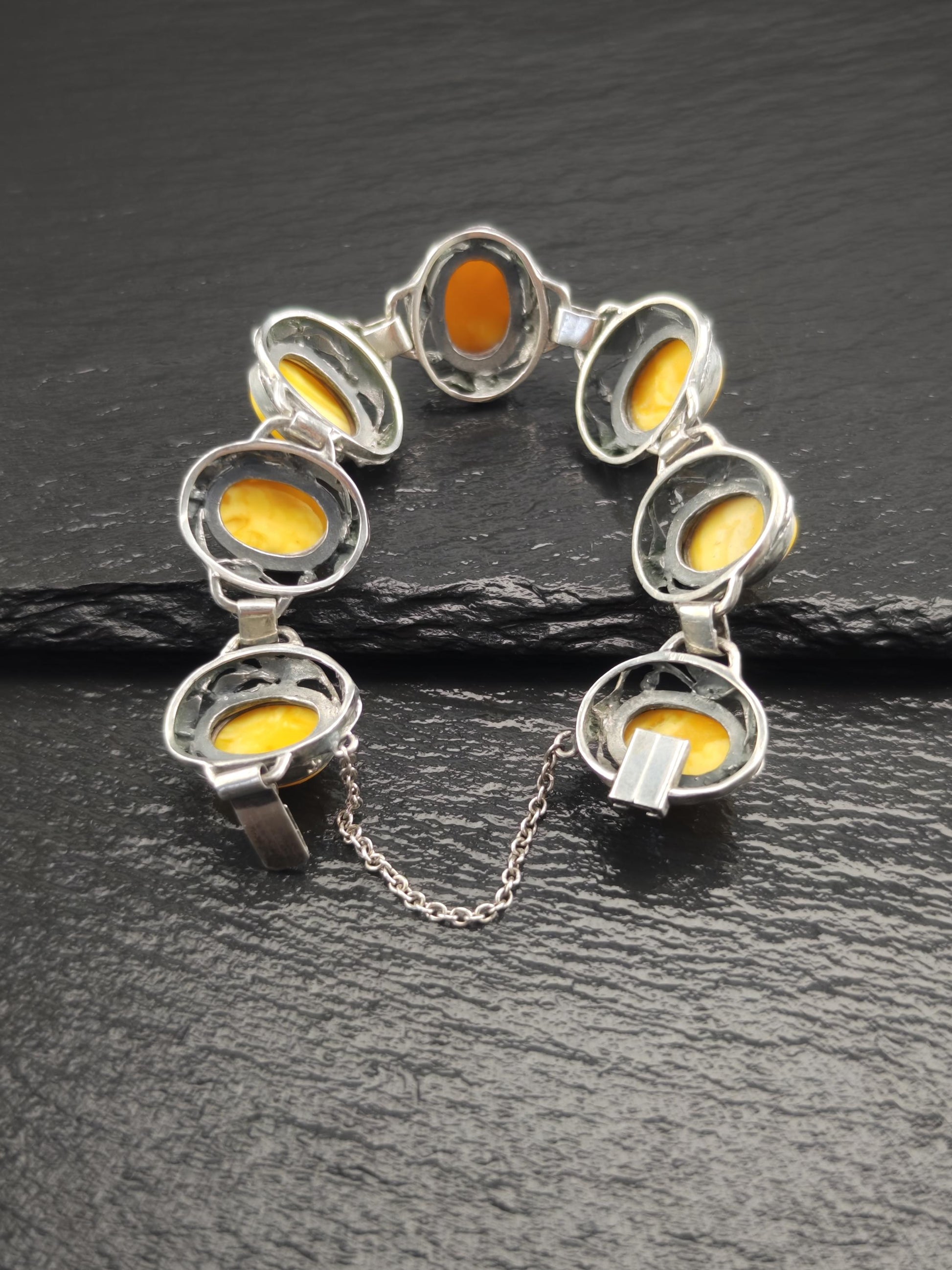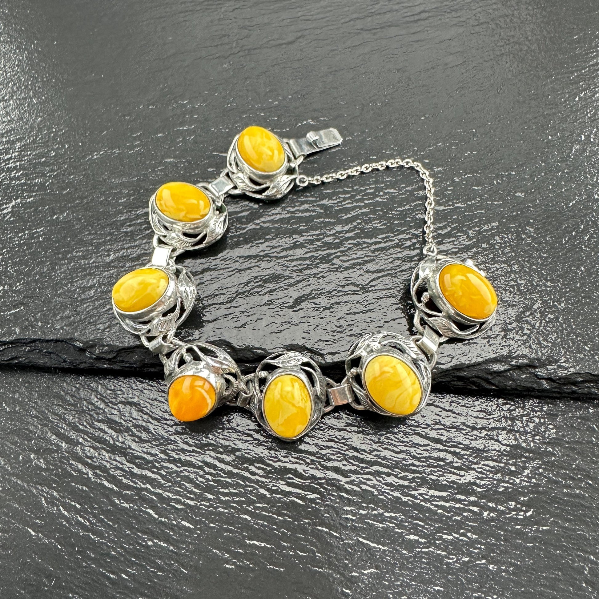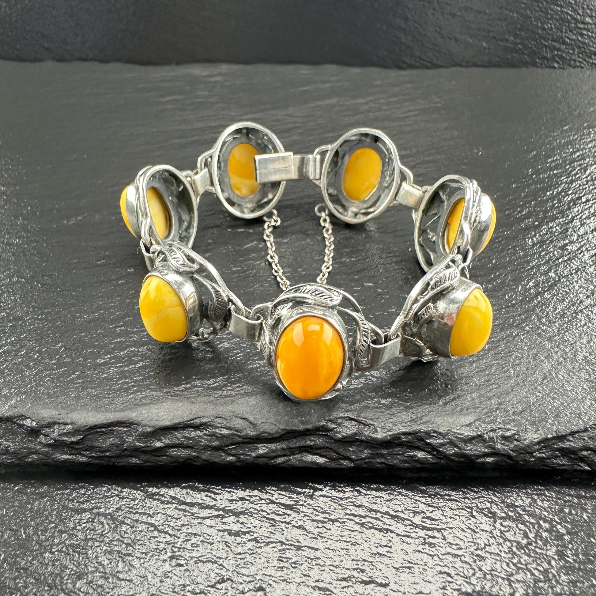 Baltic Amber Bracelet in Art Nouveau Style Yellow Opaque Sterling Silver