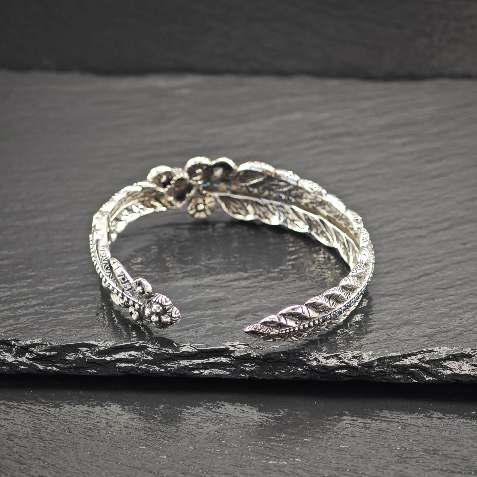 Designed to fit a wrist size of 7 inches, the bracelet boasts a tip to tip length of 6 3/8 inches and a width of 3/4 inch. Weighing in at 38.3 grams, it feels substantial yet comfortable on the wrist. The condition is very good, having been lightly cleaned while retaining a moderate patina that adds to its vintage appeal. Any signs of age-appropriate wear are minimal and contribute to its character.