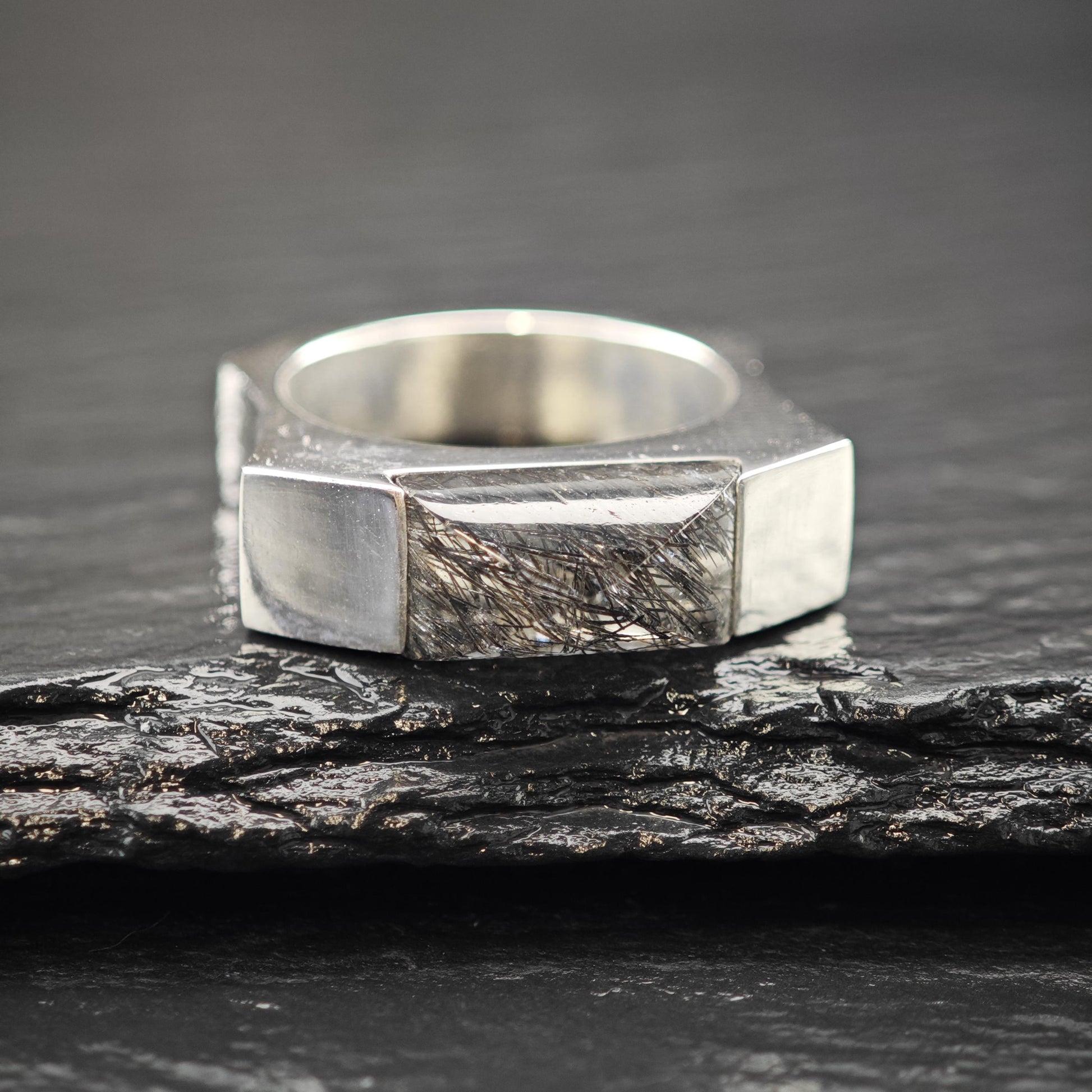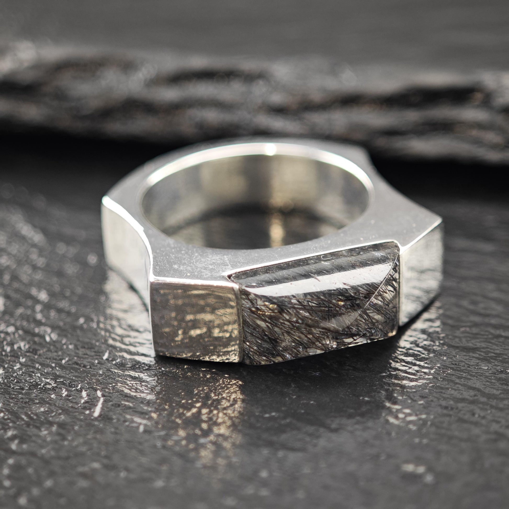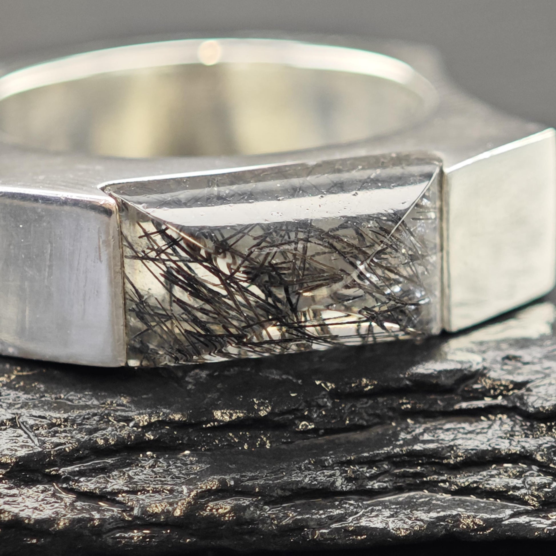 - Black rutilated quartz stone adds a distinctive abstract design element