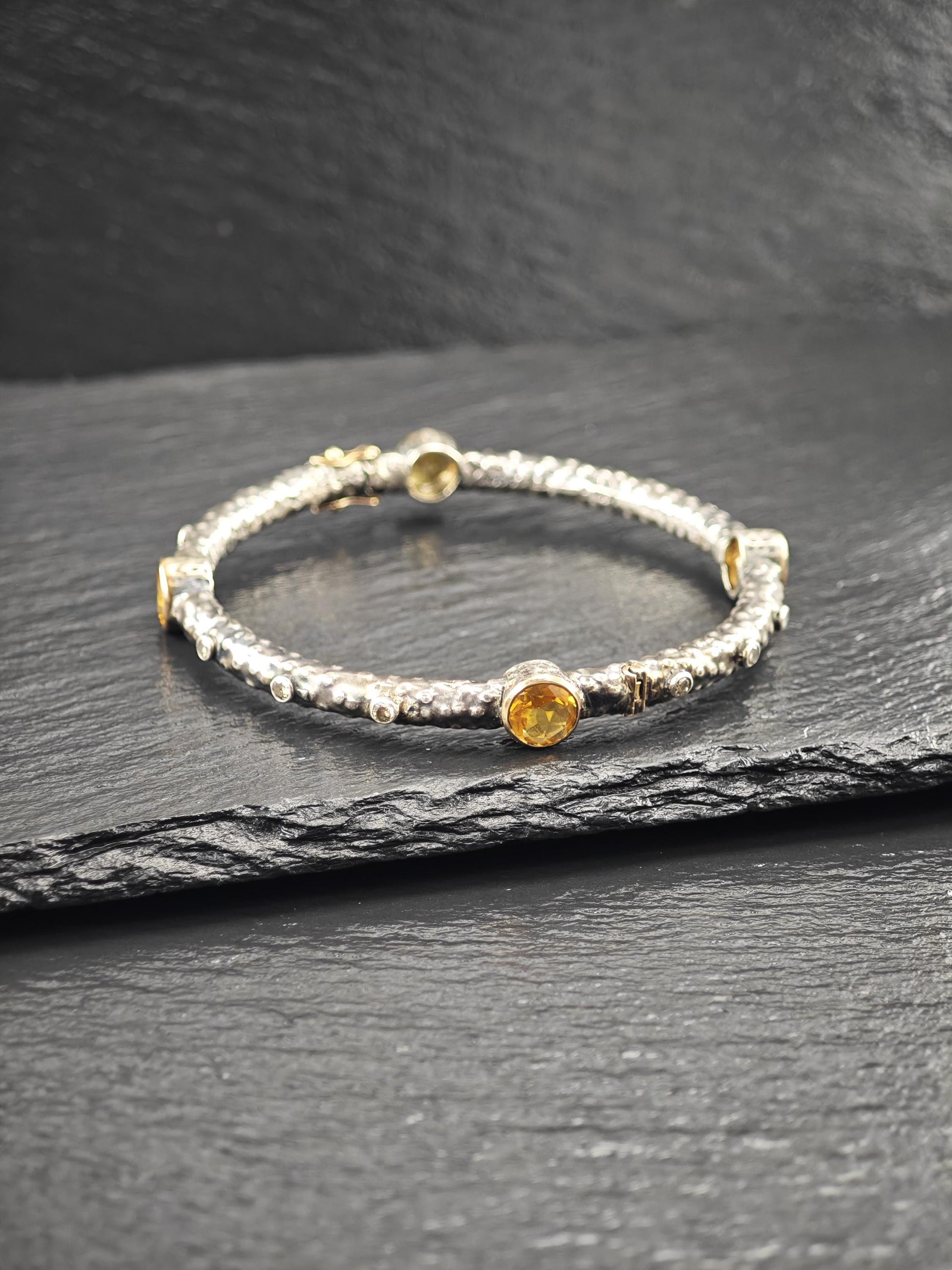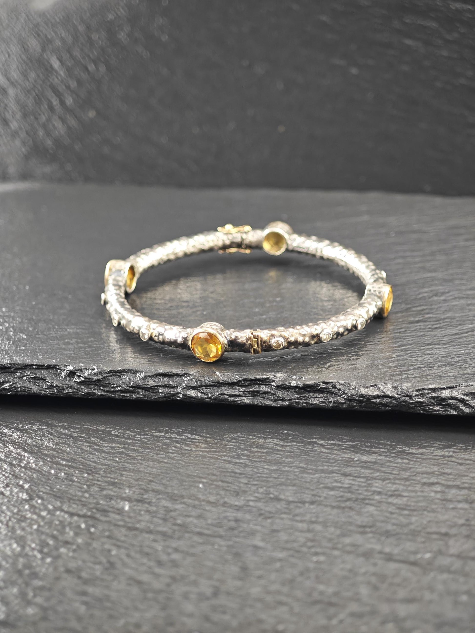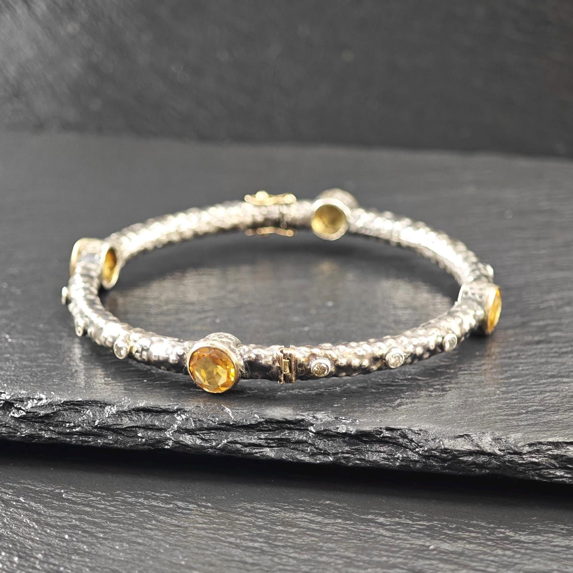 Vintage Brutalist Citrine, Diamond 18K Gold Clasp, Bangle Bracelet Sterling Silver