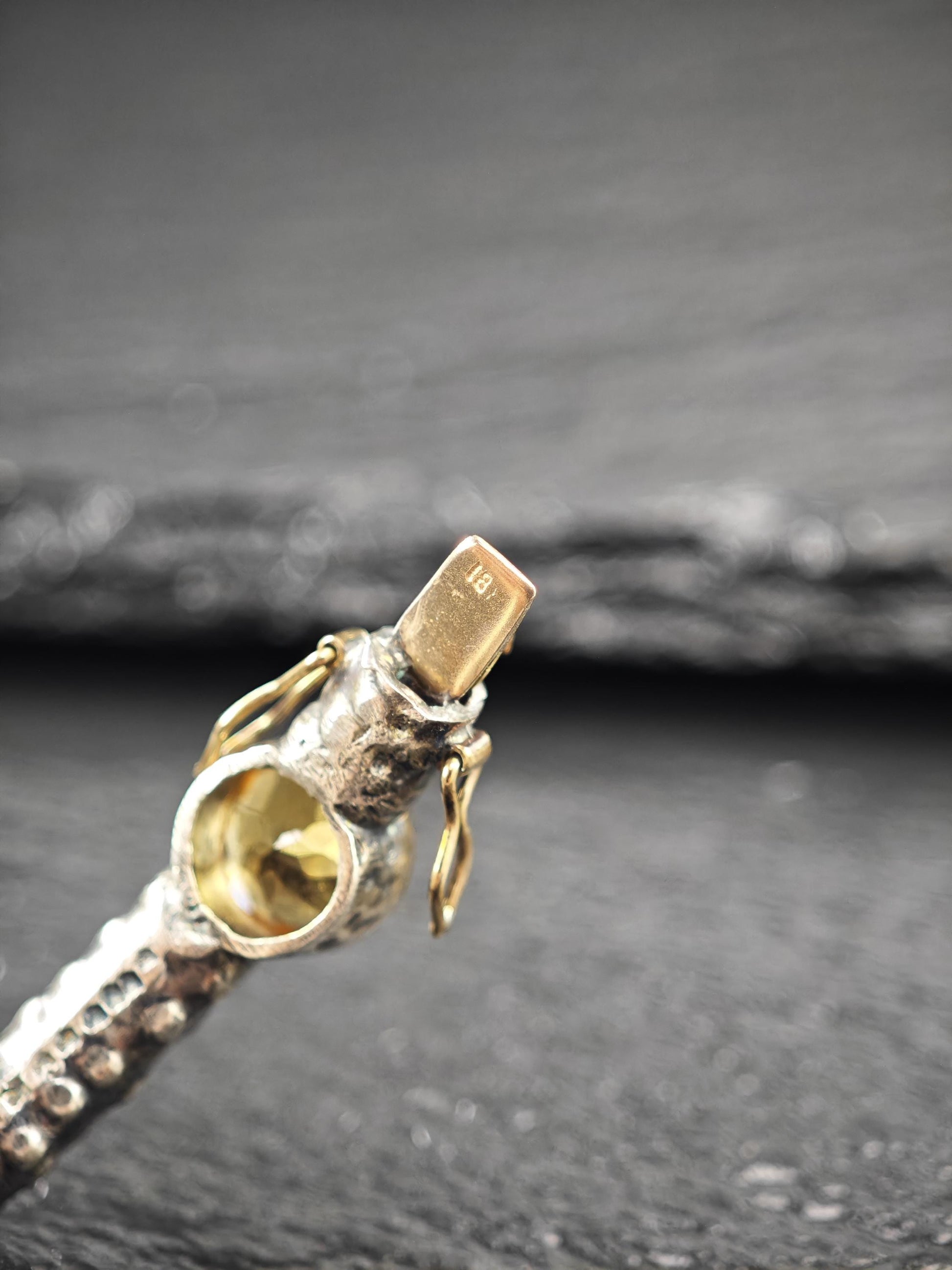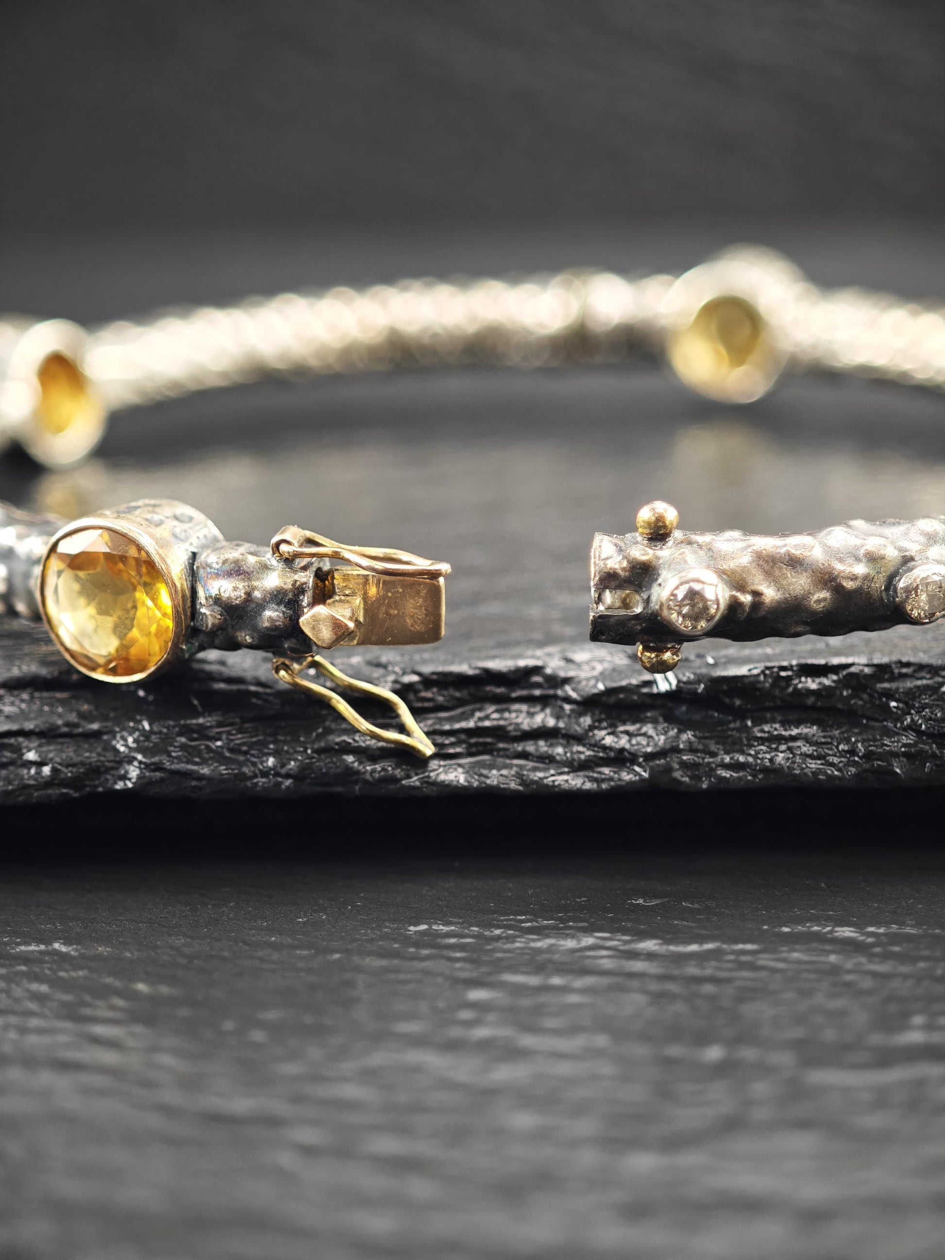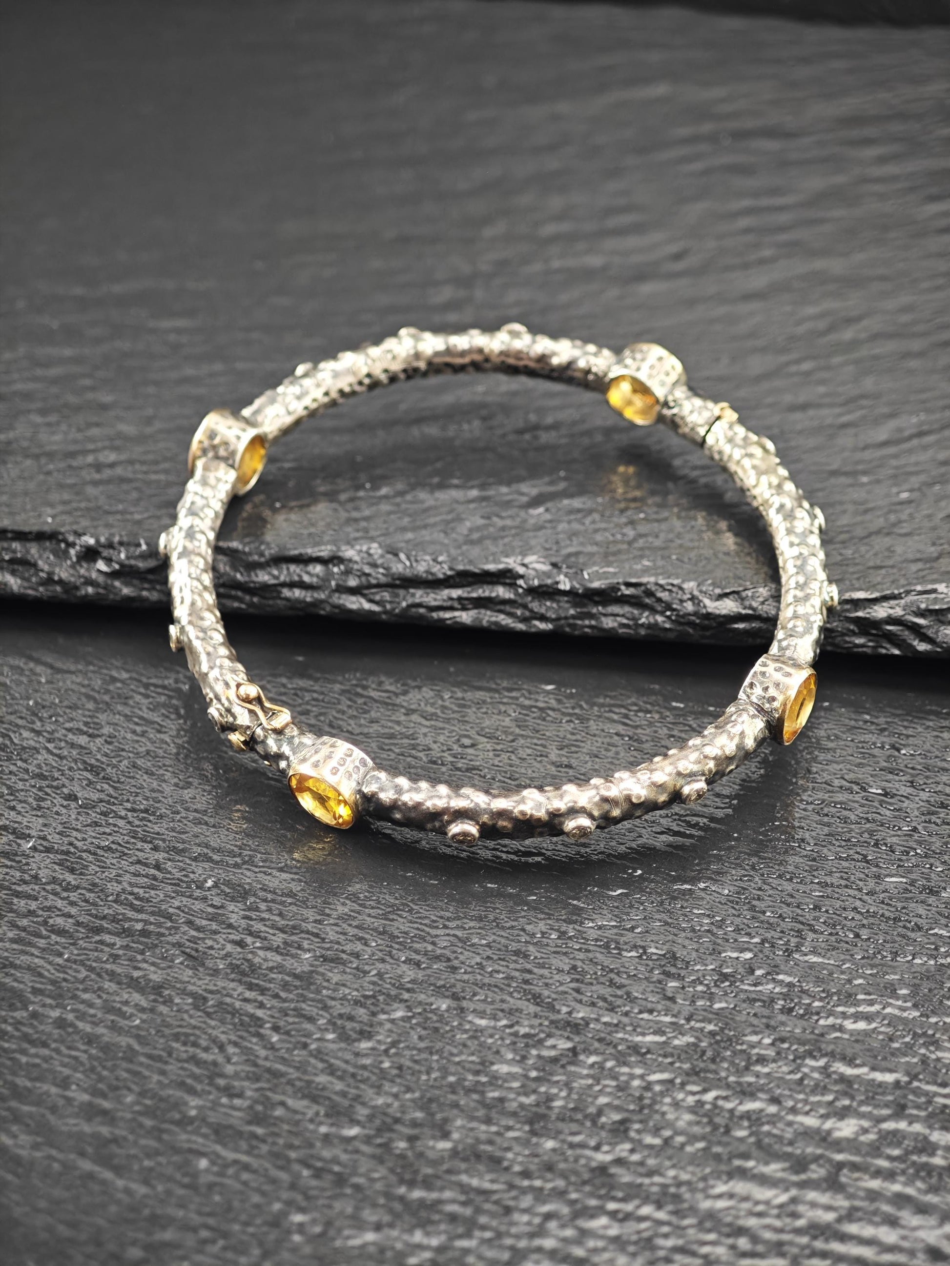 Vintage Brutalist Citrine, Diamond 18K Gold Clasp, Bangle Bracelet Sterling Silver
