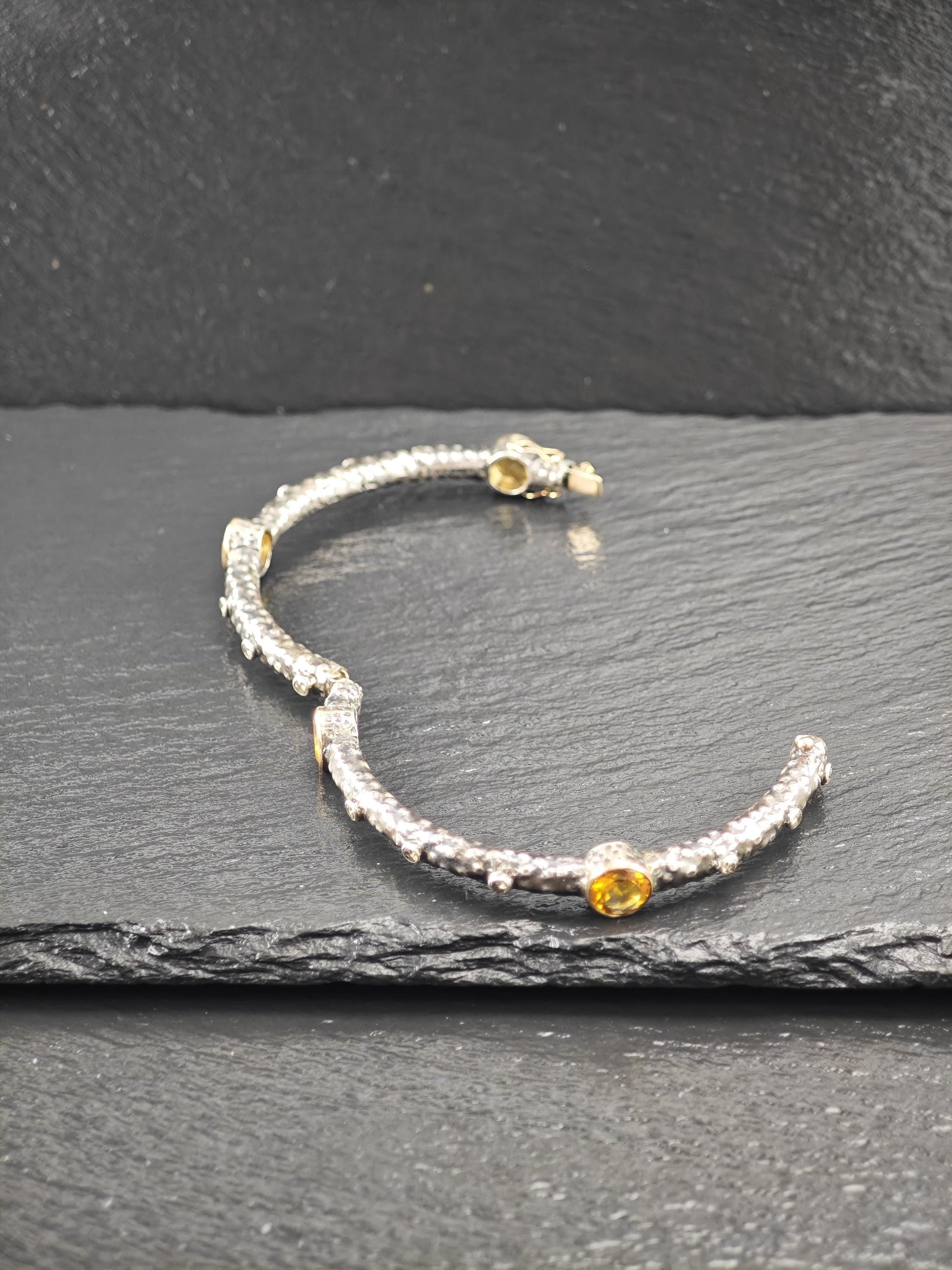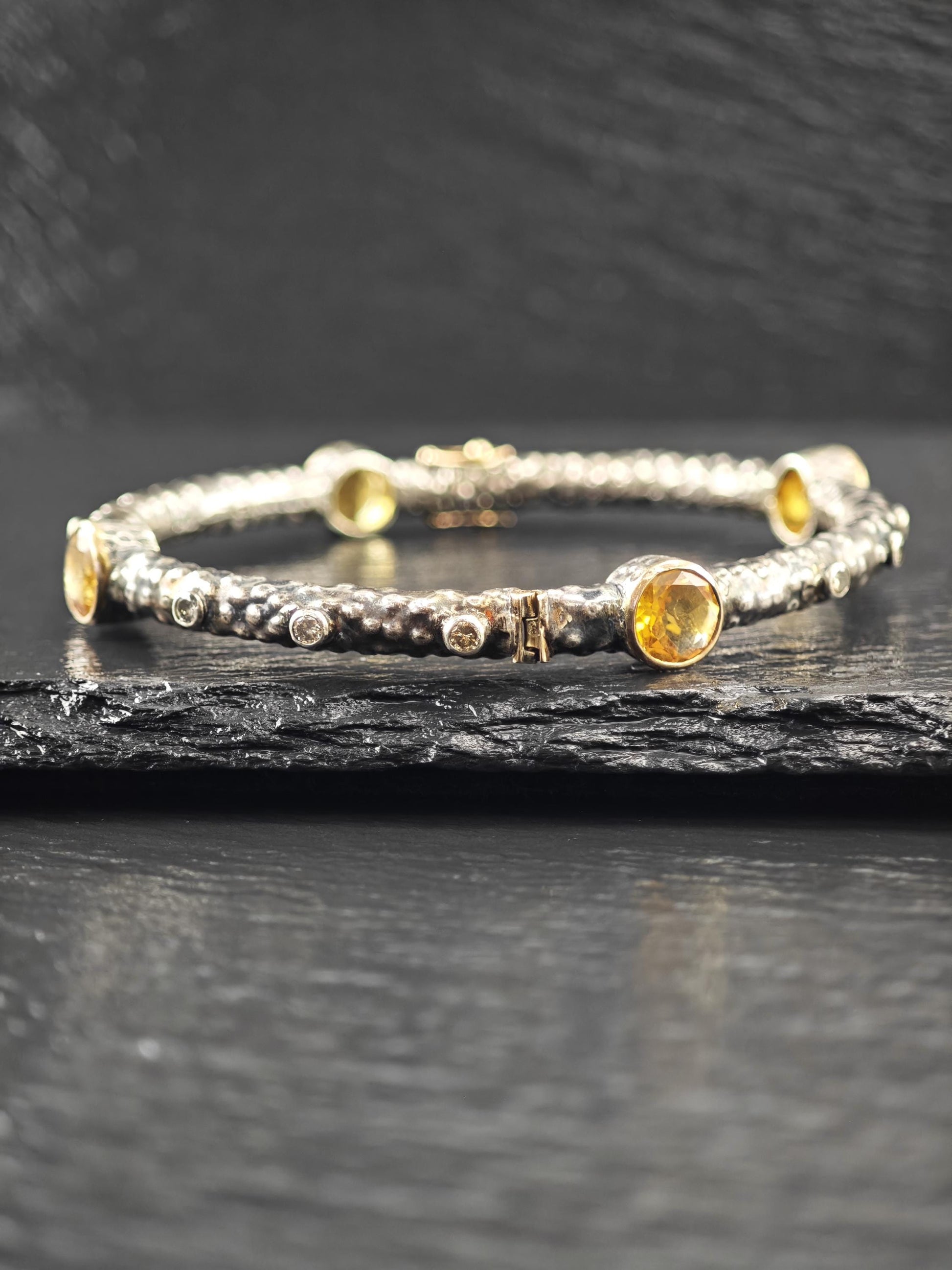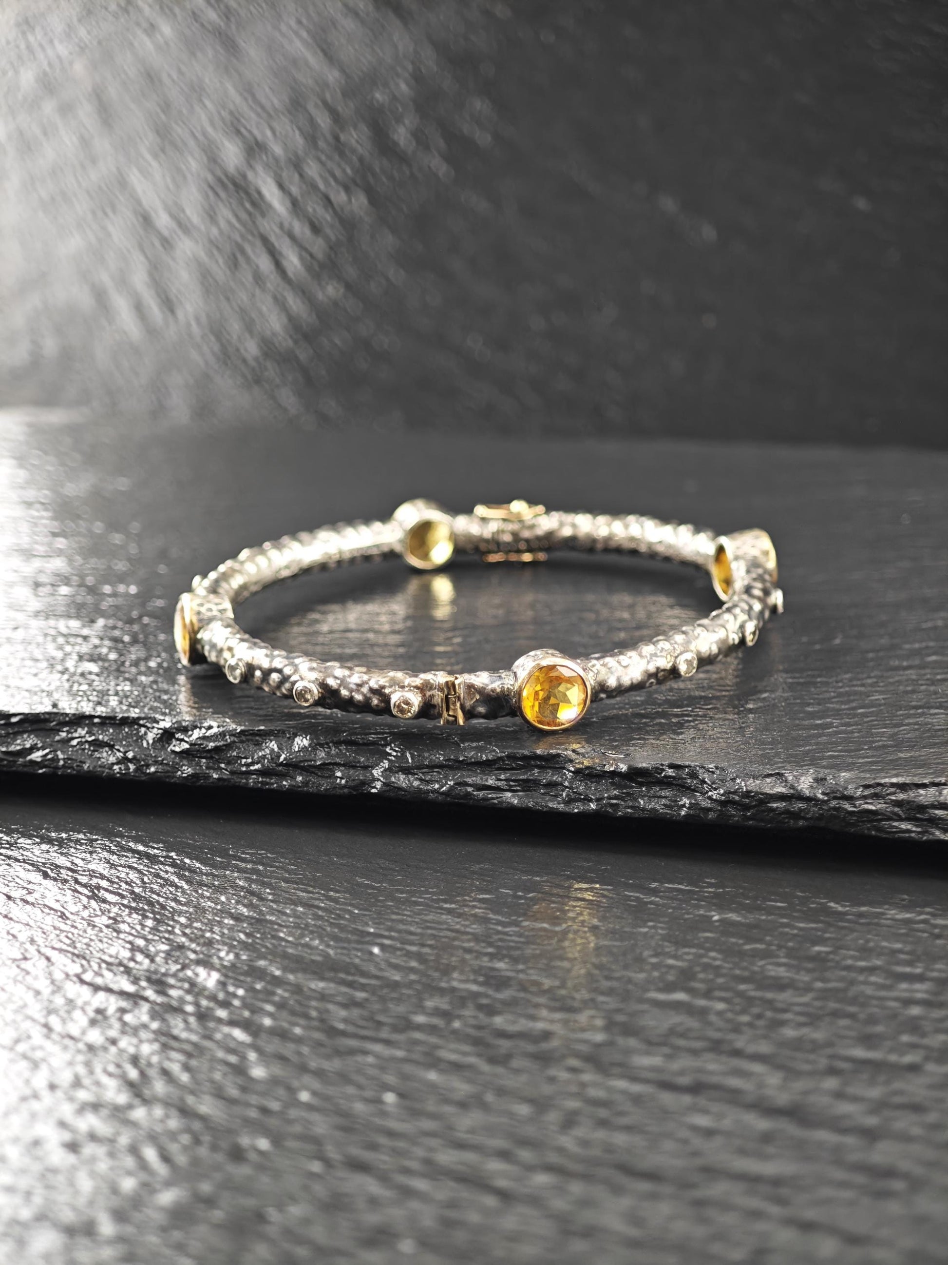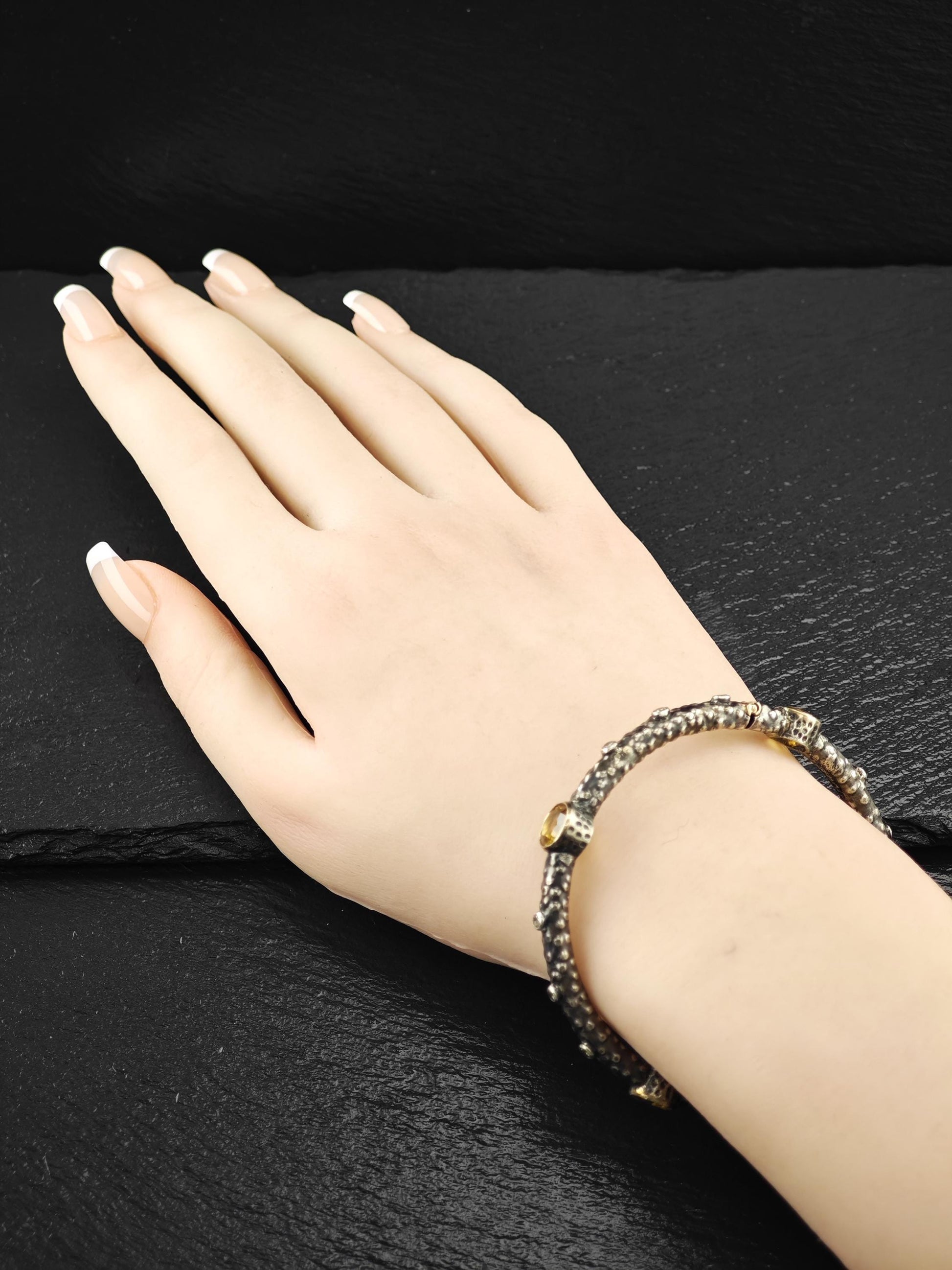 Brutalist 18K Gold Accent Citrine, Diamond Bangle Bracelet Sterling Silver