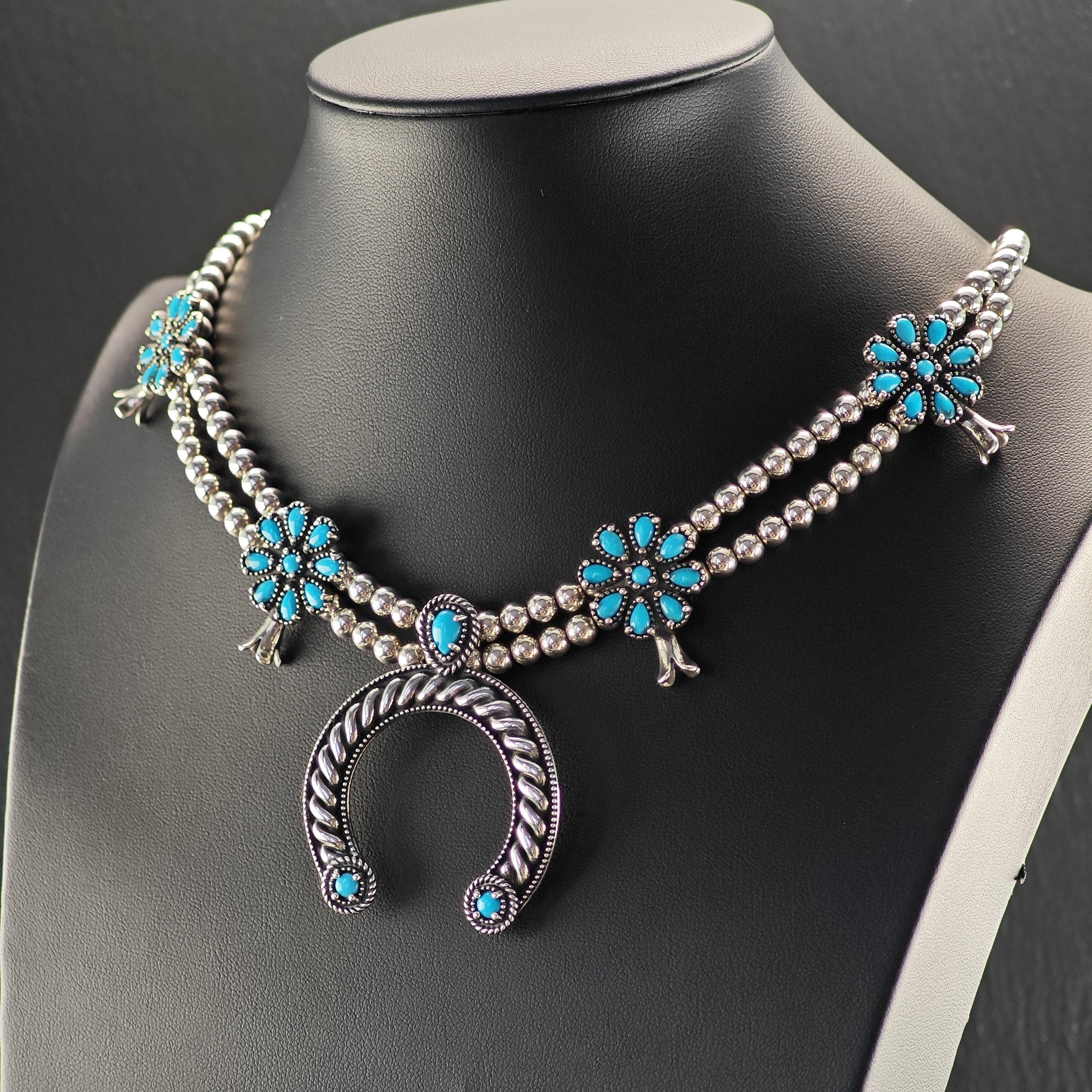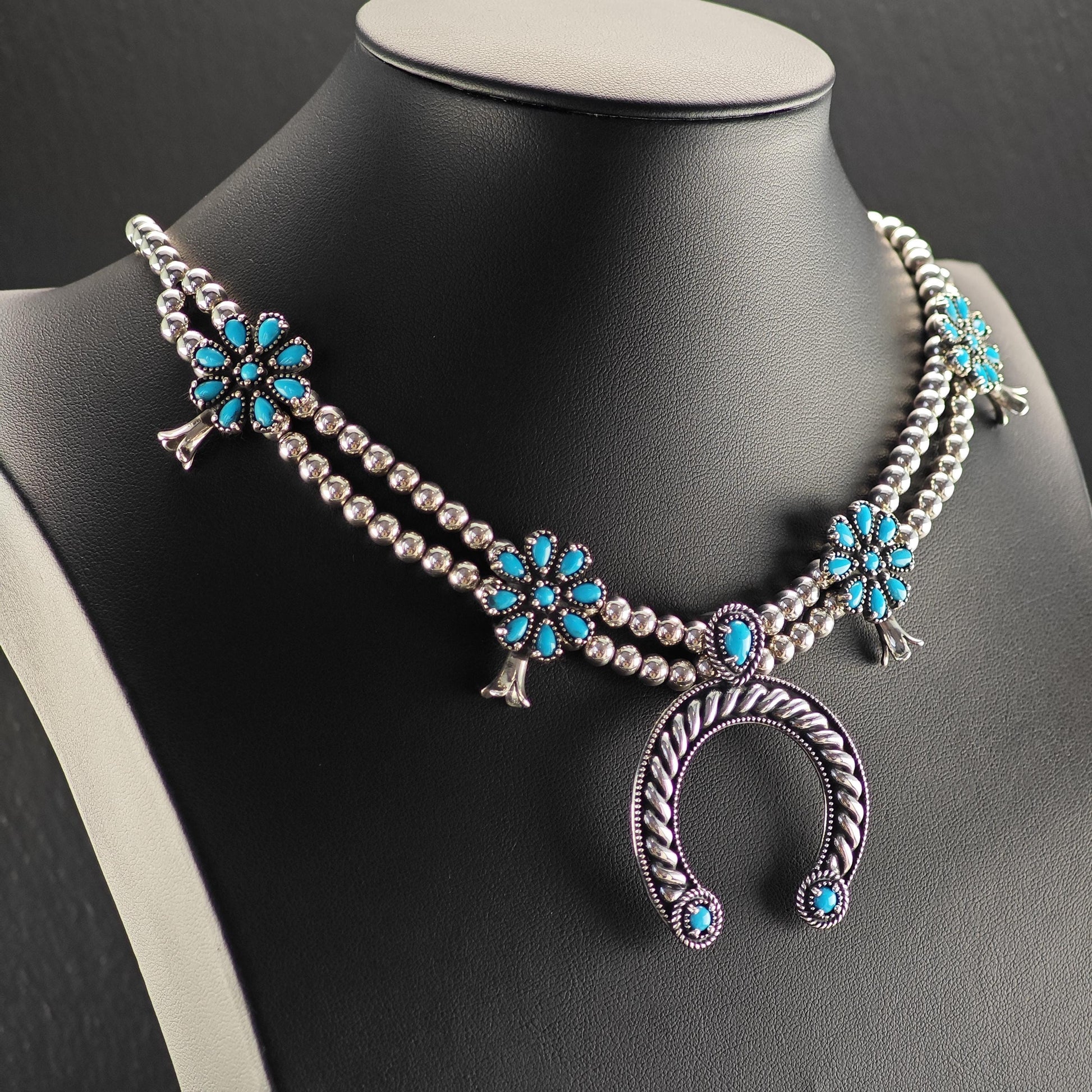 Discover a stunning vintage piece with this Carolyn Pollack Sterling Silver Squash Blossom Necklace, featuring a striking removable blue turquoise pendant. Weighing 52.5 grams, this exquisite necklace showcases a natural, treated turquoise stone that adds a vibrant touch to your jewelry collection.