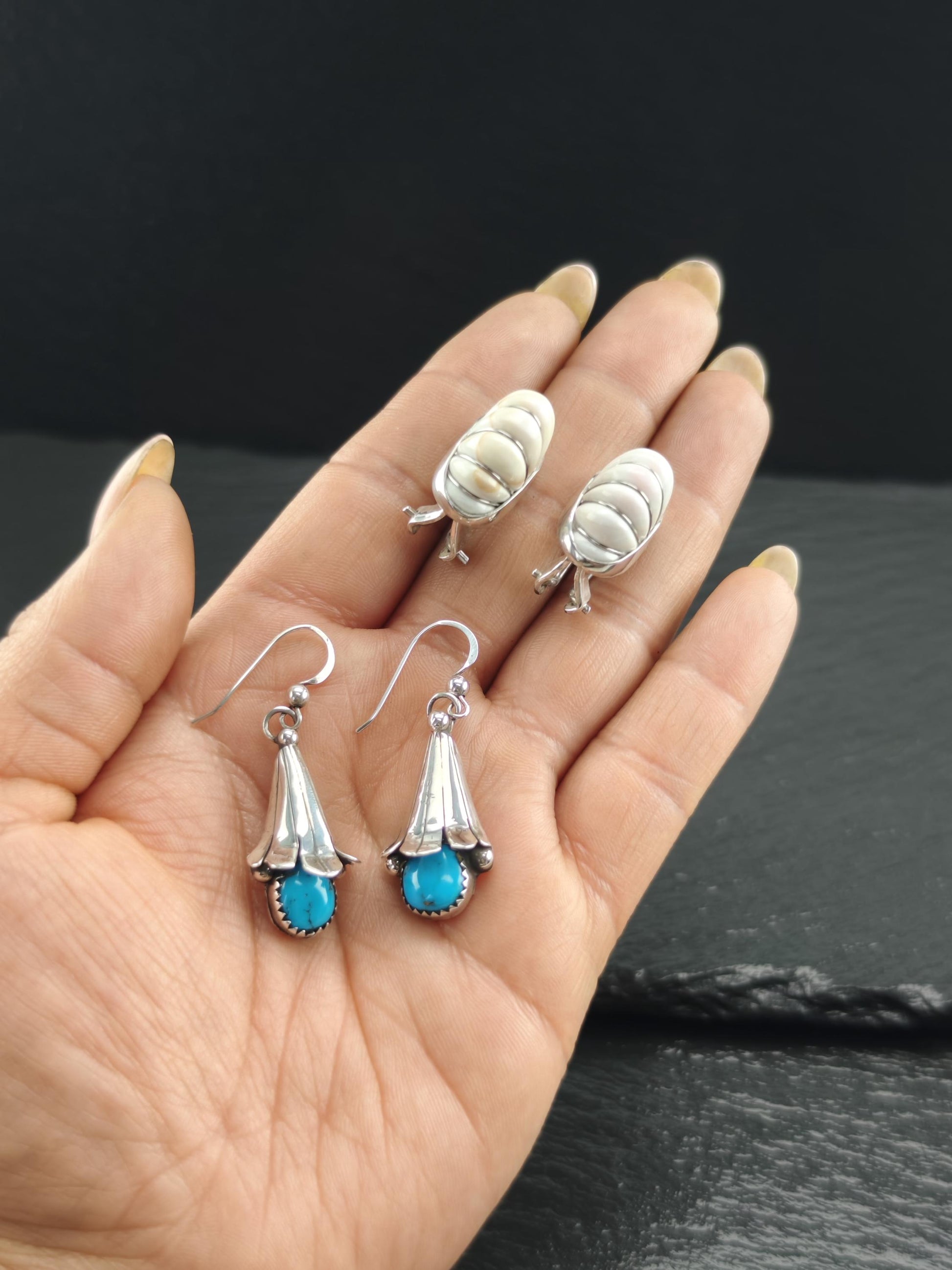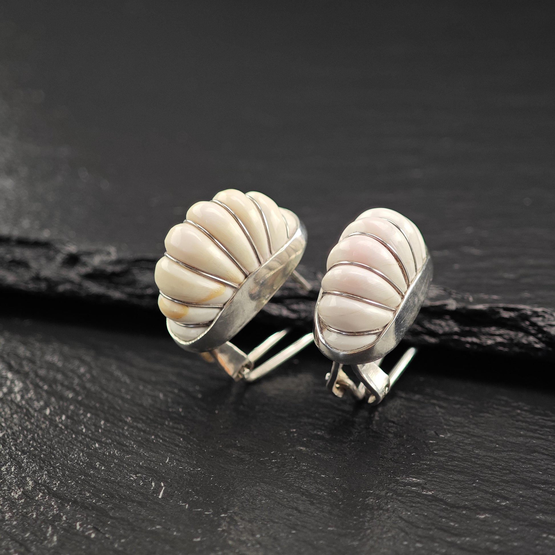Discover the elegance of these vintage Cerro Blanco White Shell Scallop Earrings, crafted in sterling silver with a sophisticated omega back design. Measuring 7/8 inches in length and 1/2 inch in width, these stunning earrings weigh 12.9 grams and feature a beautiful white shell scallop motif. The stone dimensions are approximately 9.9 x 20.5 mm, showcasing the intricate craftsmanship of these unique pieces.