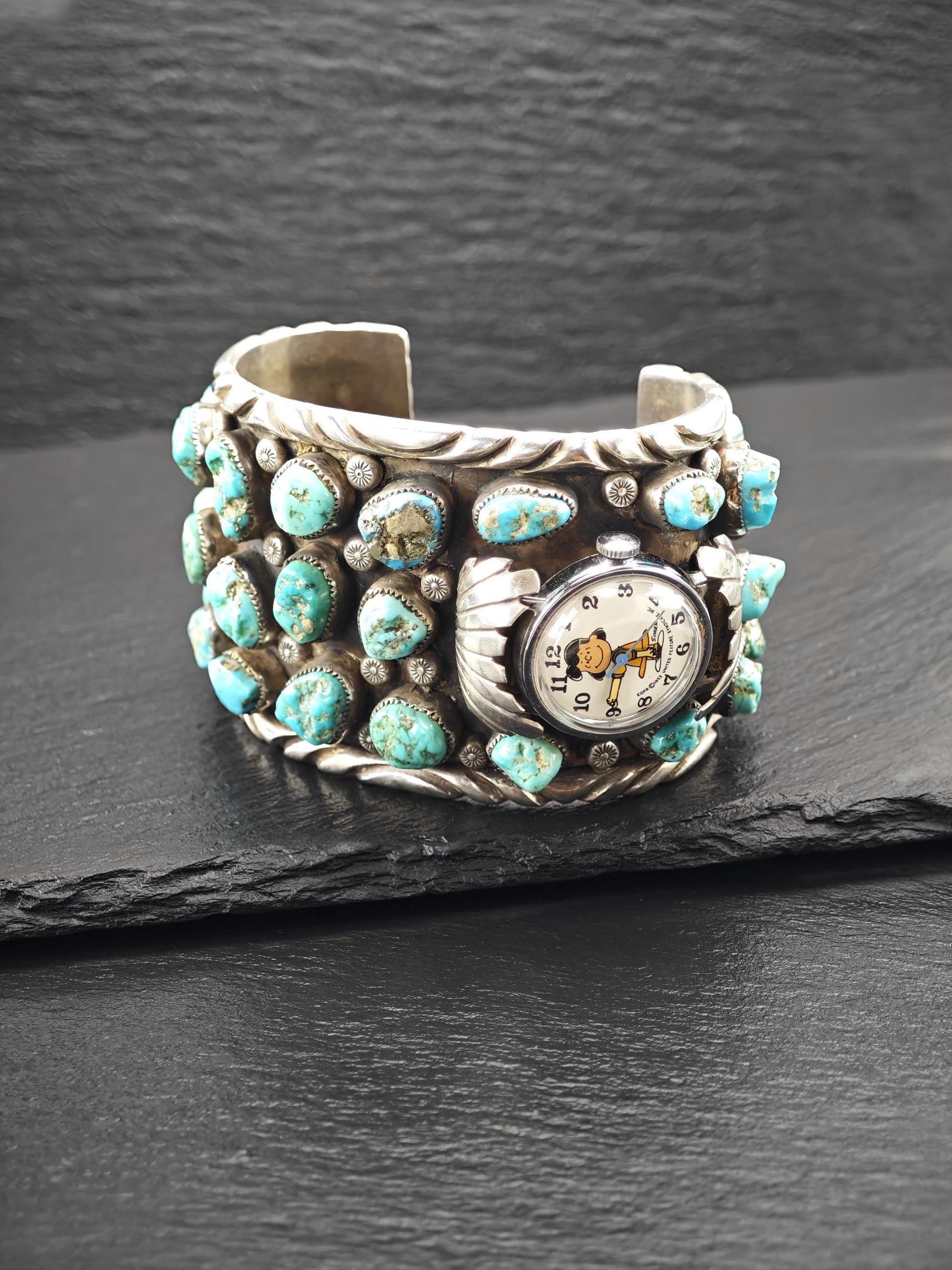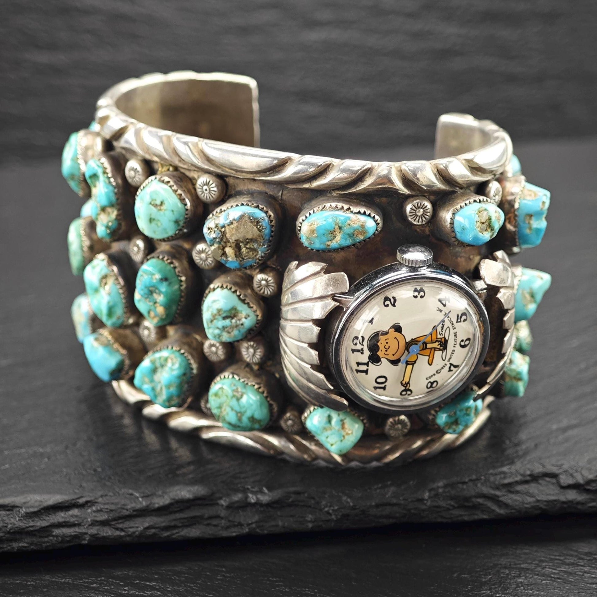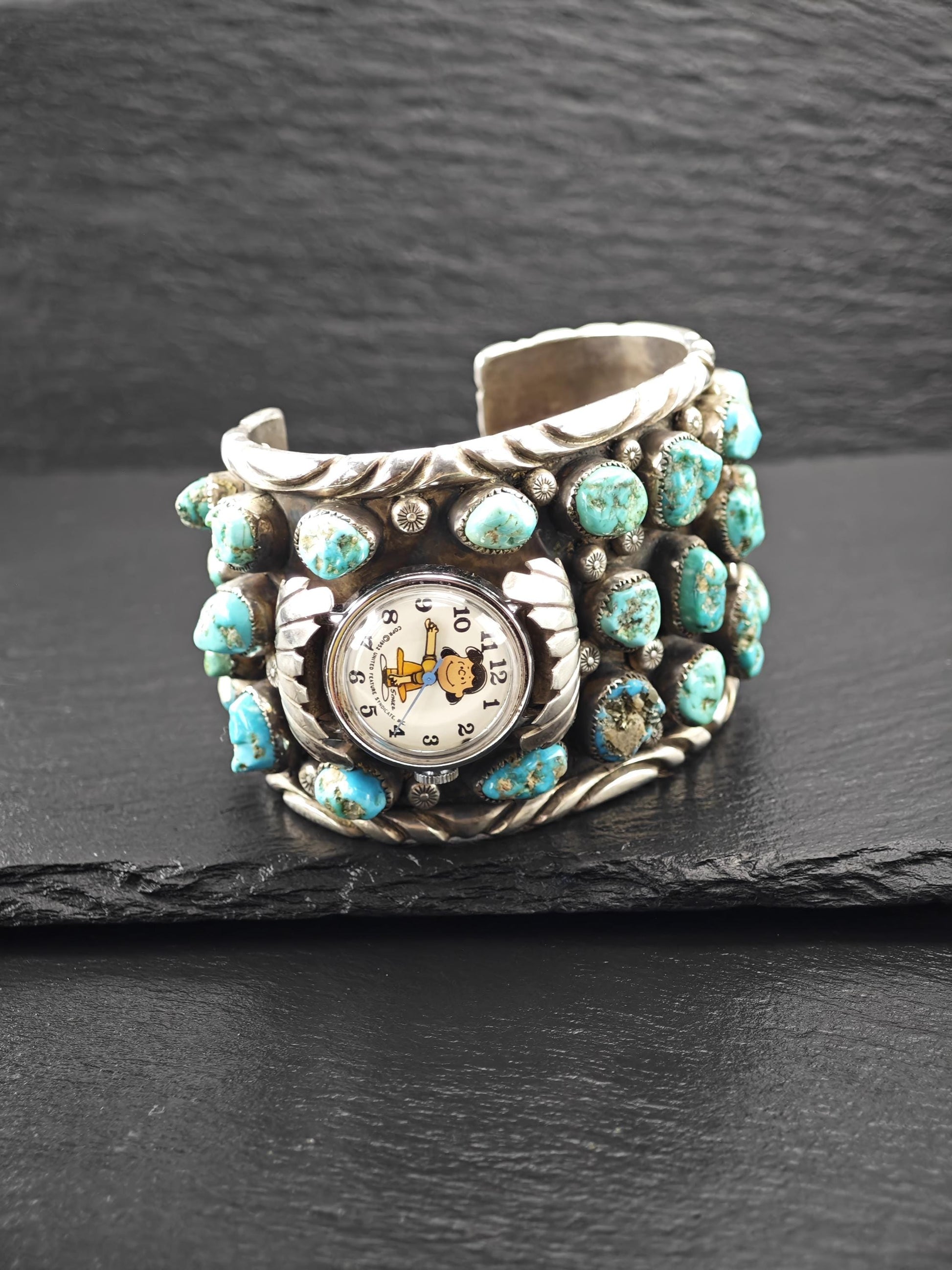 As IS Vintage Charly Brown Native American Blue Turquoise, Watch Cuff Bracelet Sterling Silver