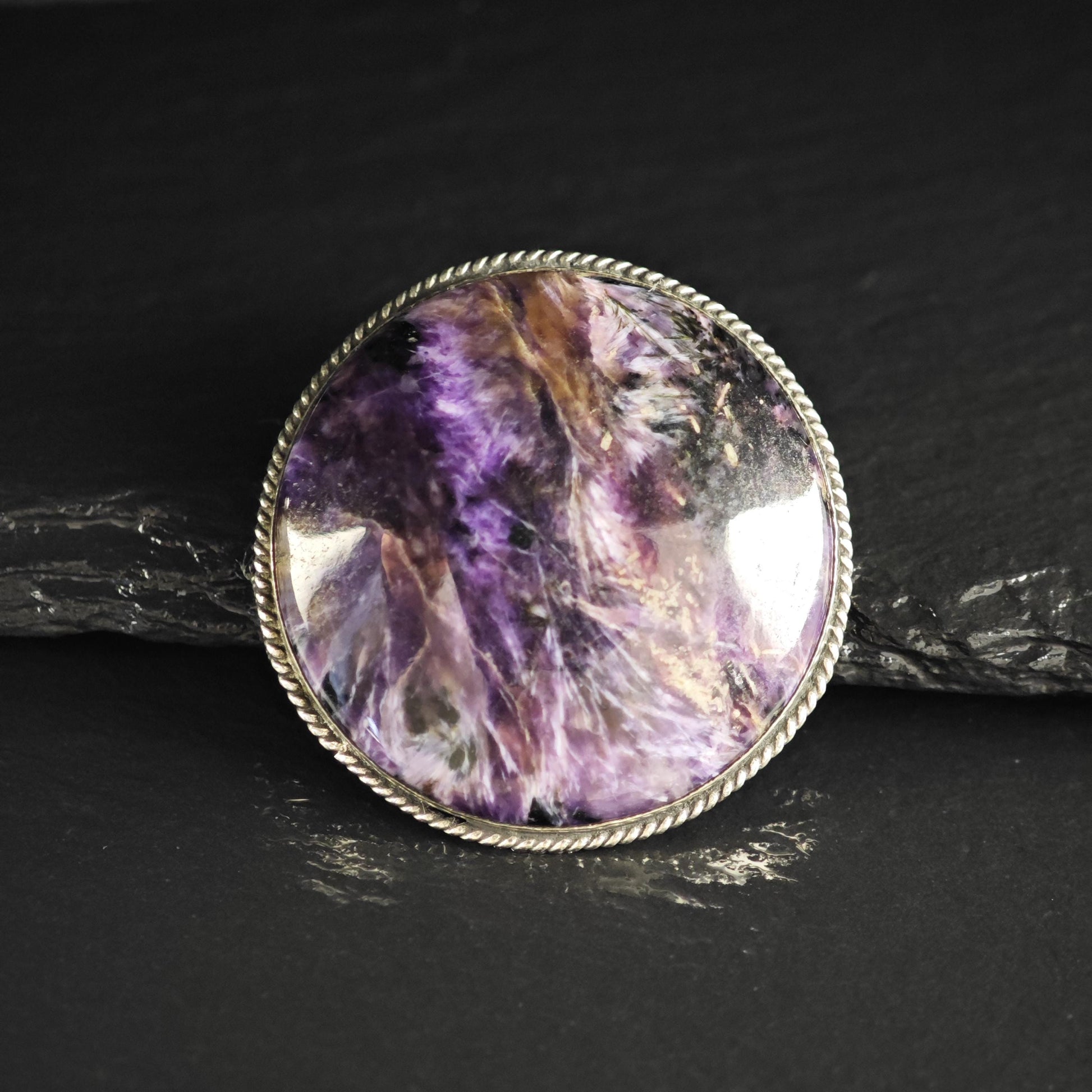The brooch features a captivating round Charoite stone, showcasing a rich purple hue that adds a touch of sophistication to its design. While the piece is unmarked, it has been tested and is guaranteed to be genuine sterling silver. Its condition is very good, having been cleaned and polished, with some patina that reflects its age and history.