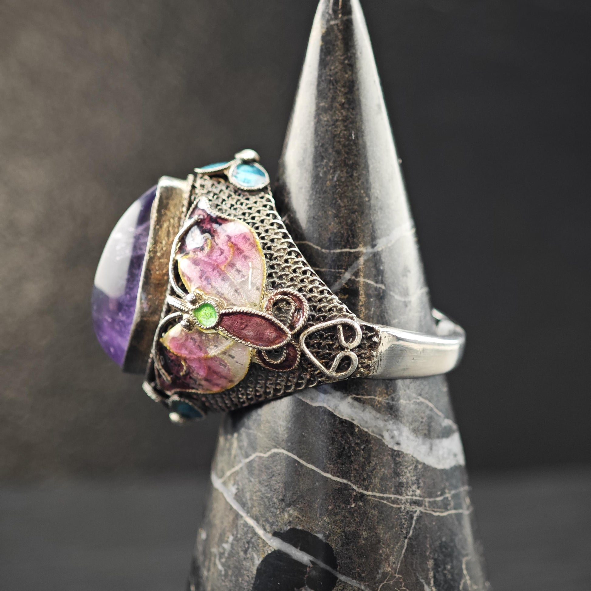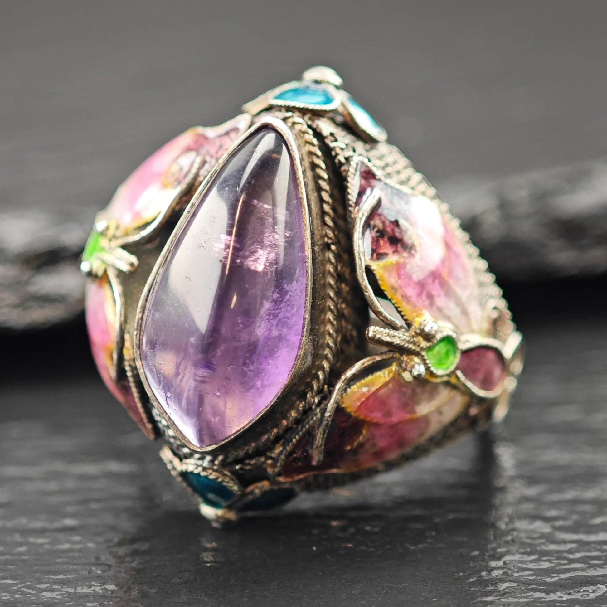 Chinese Export Amethyst, Enamel, Ring Flower Sterling Silver Sz 9