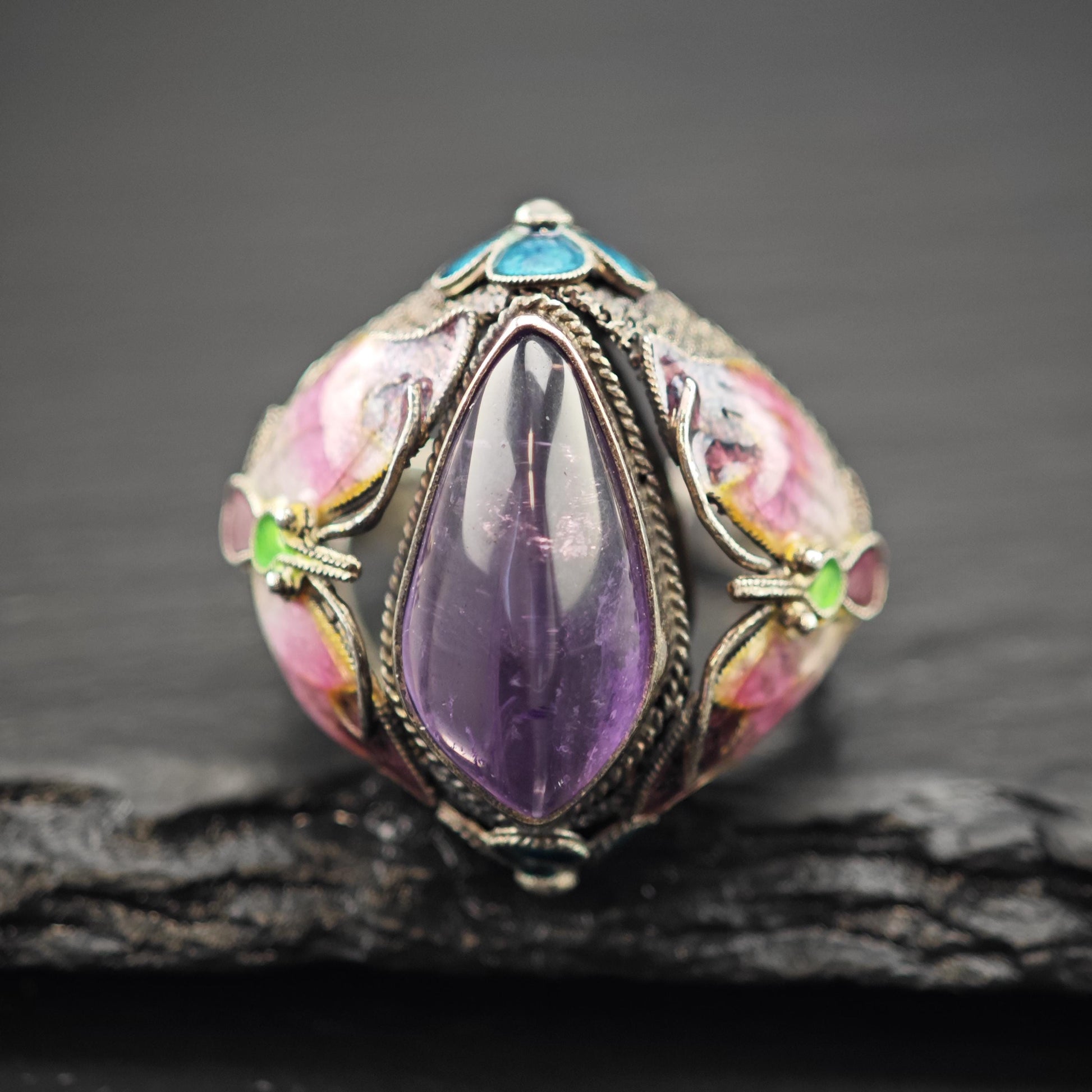 Discover the timeless elegance of this vintage sterling silver ring, featuring a delicate flower design accented with amethyst and enamel. Crafted as a Chinese export piece, this silver ring carries a rich history and unique charm that makes it a standout addition to any jewelry collection. Whether you're searching for a special holiday gift or a distinctive vintage jewelry treasure, this size 9 ring offers both beauty and character.