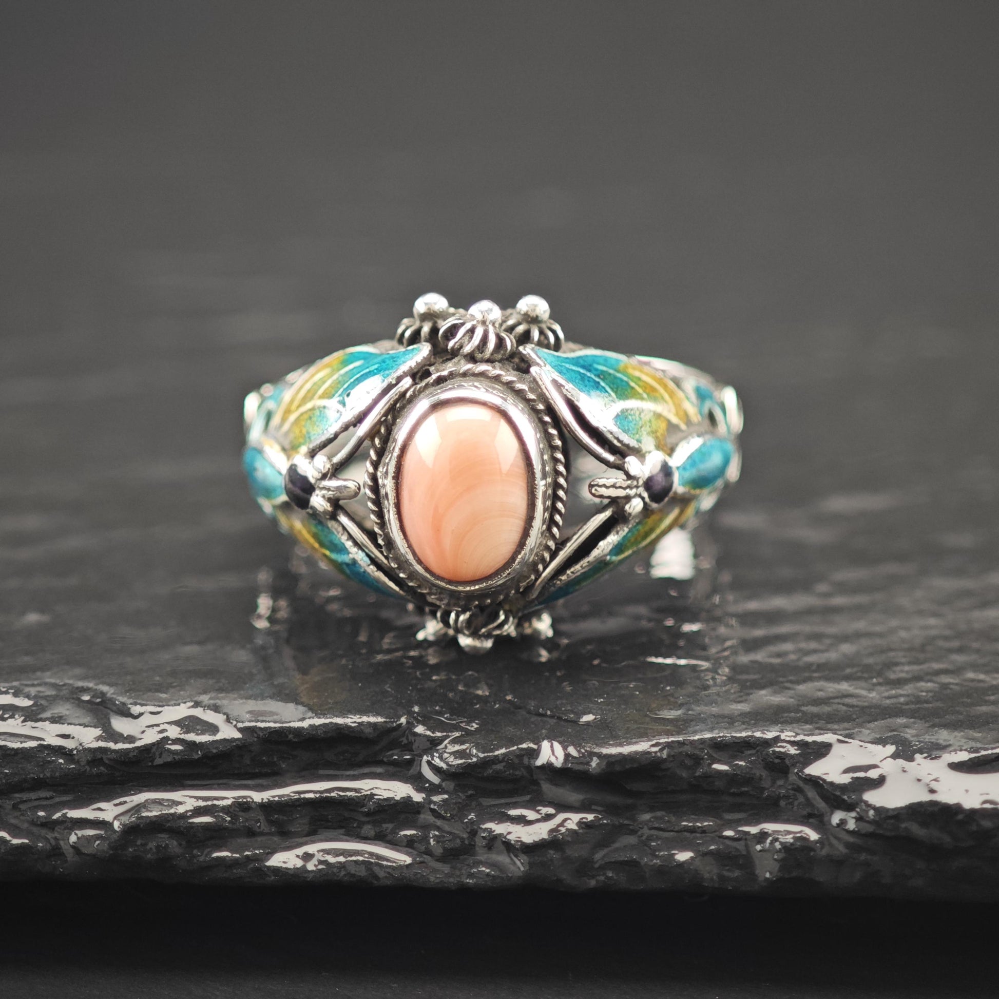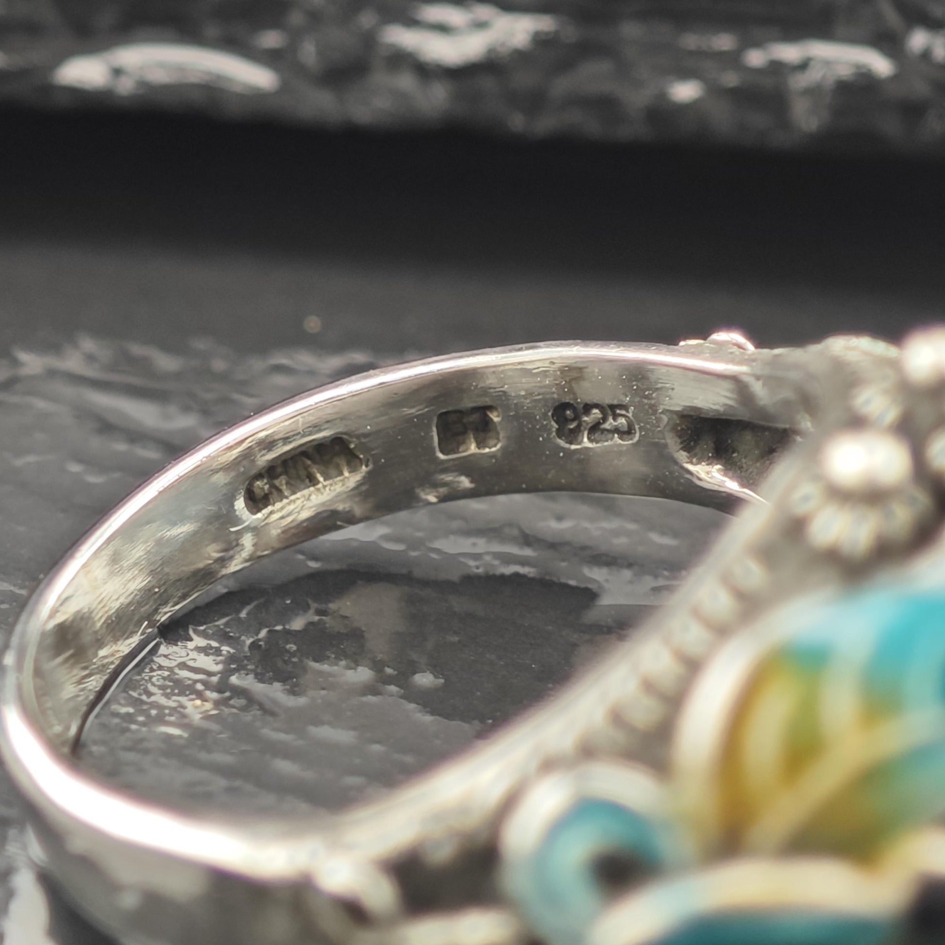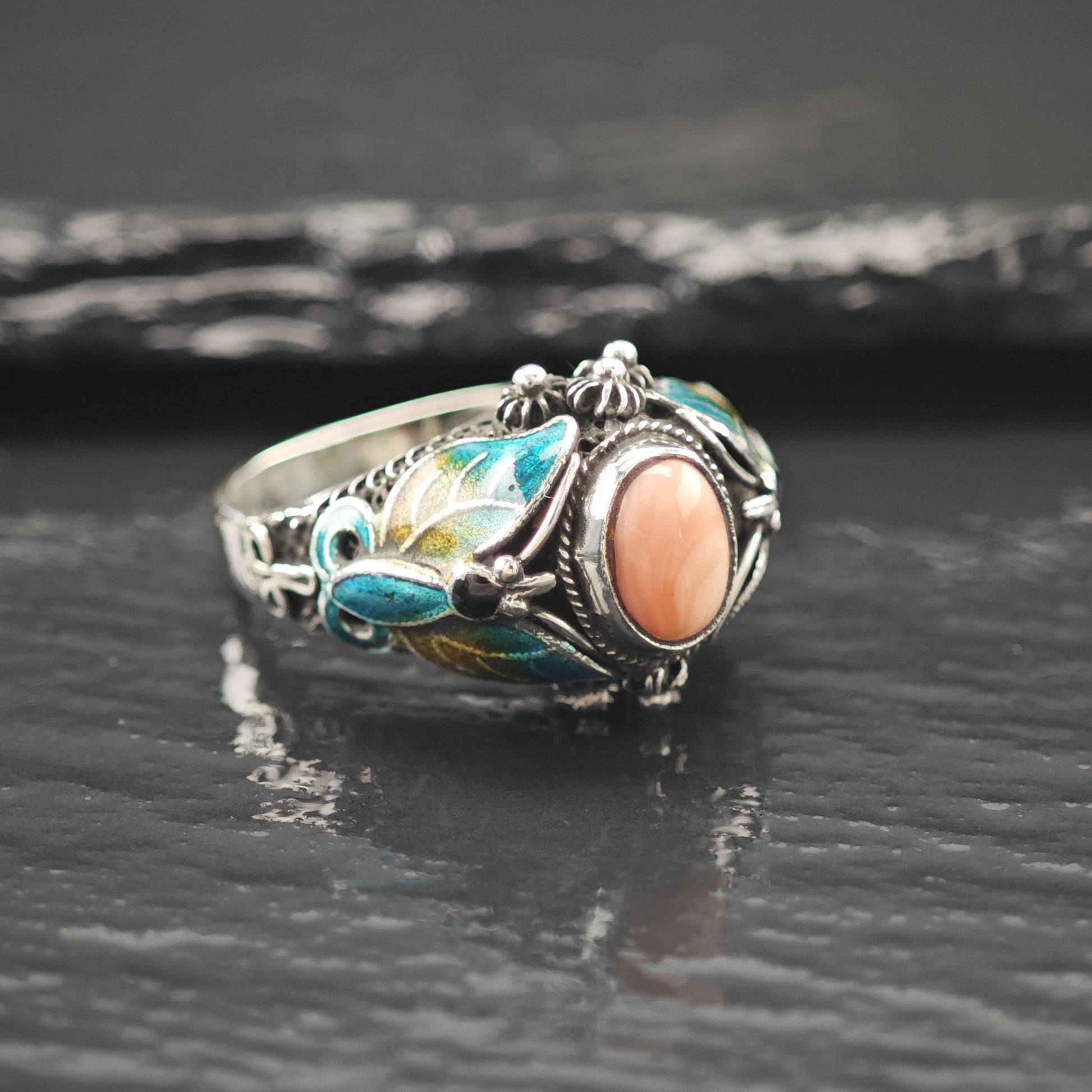 Discover the exquisite beauty of this Chinese Export Enamel Conch Butterfly Ring, crafted in sterling silver. This stunning piece is stamped with "China," "EJ," and "925," ensuring its authenticity (tested and guaranteed to match the stamped markings).