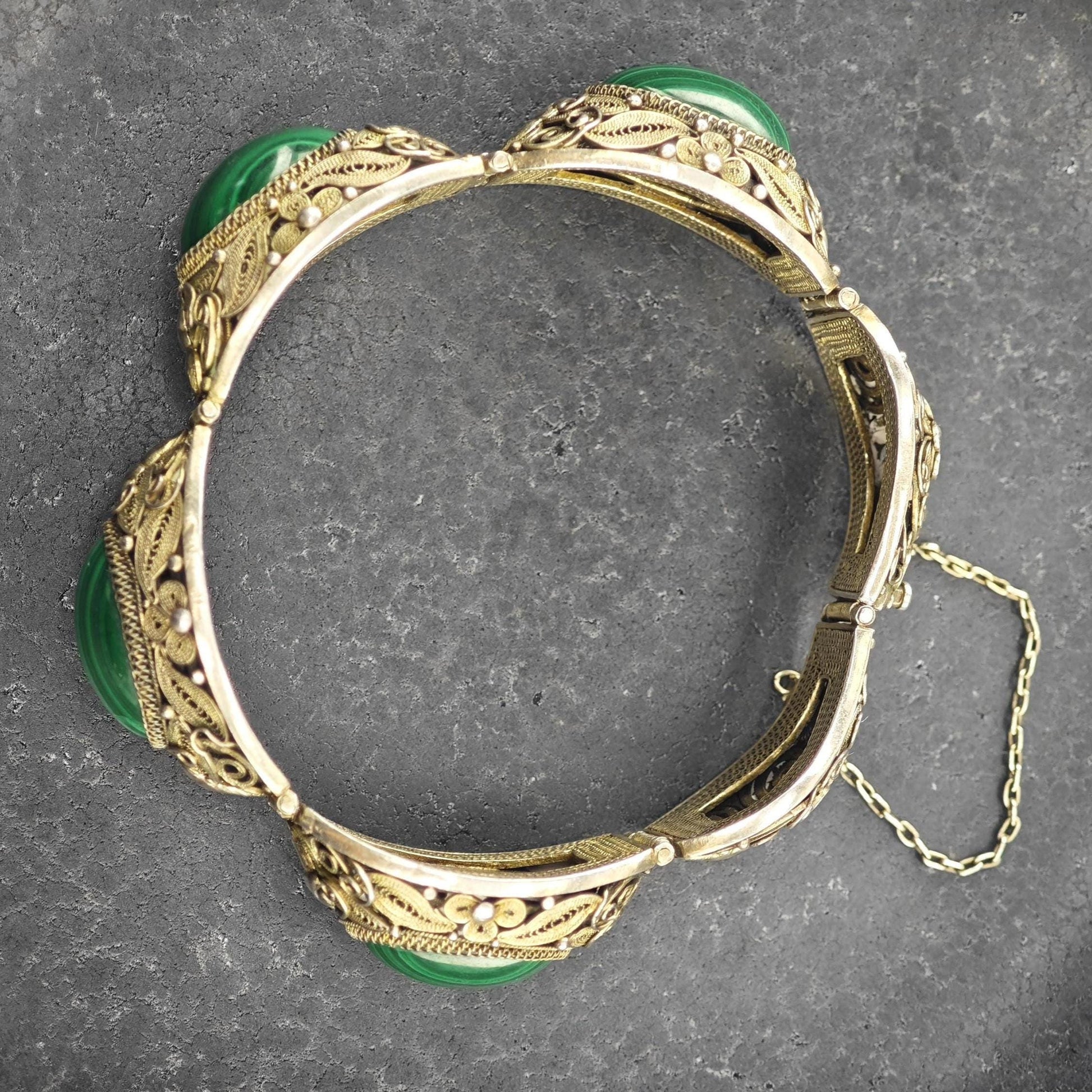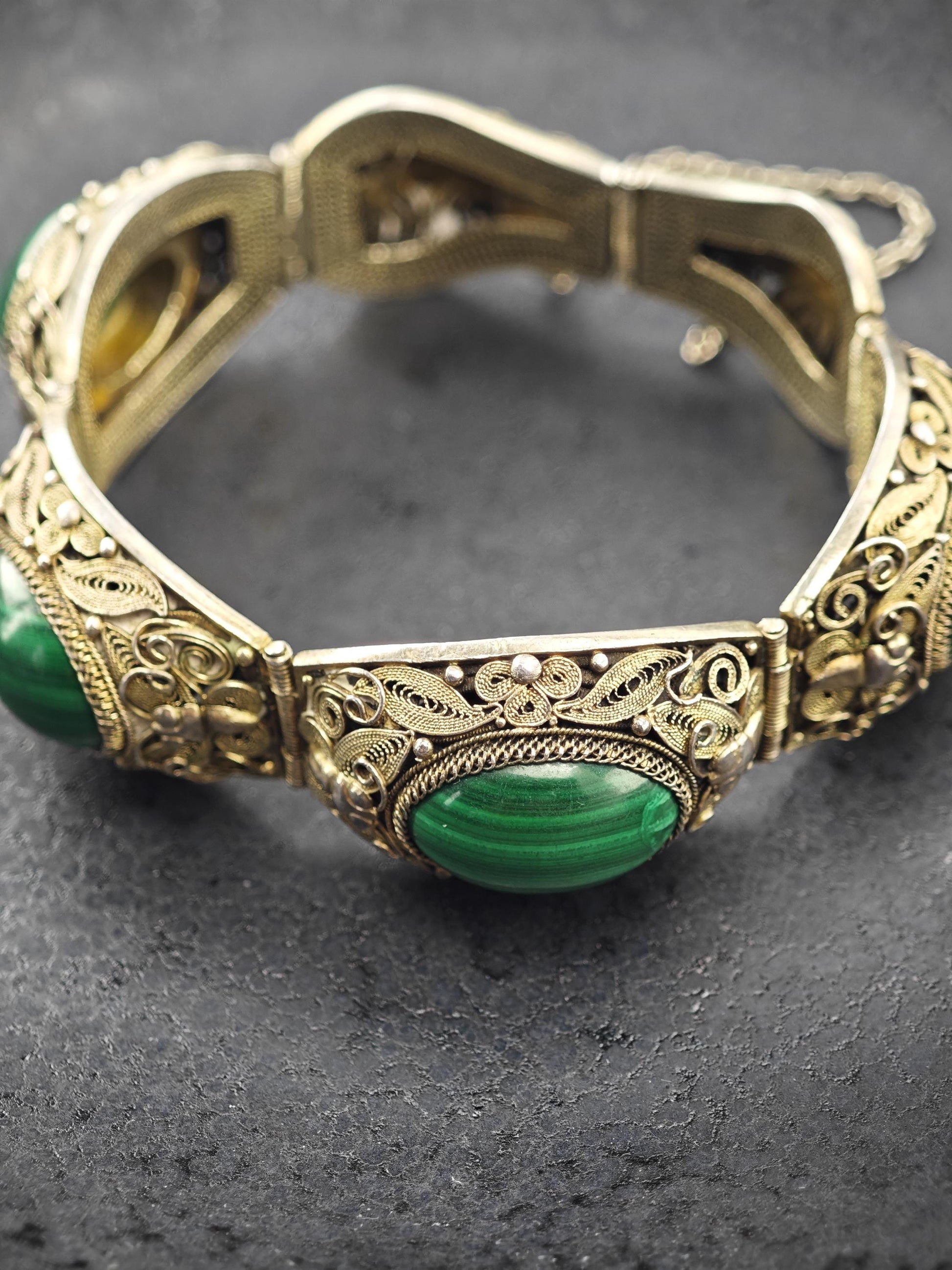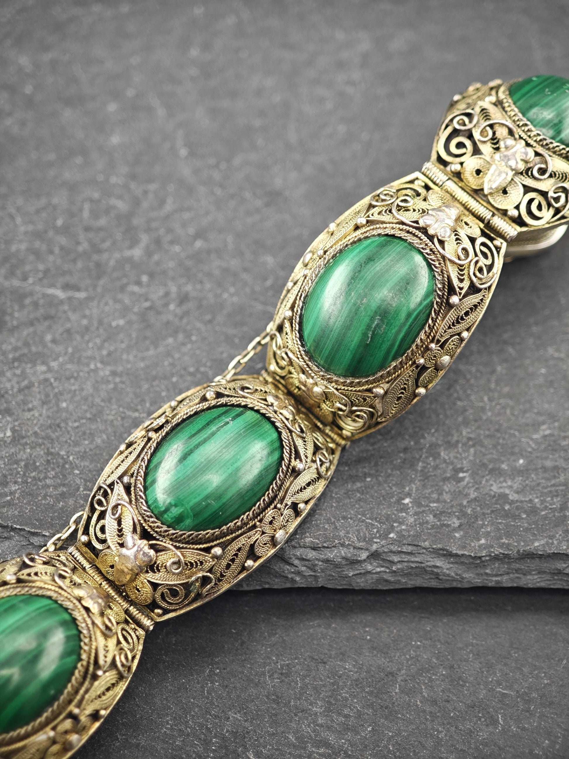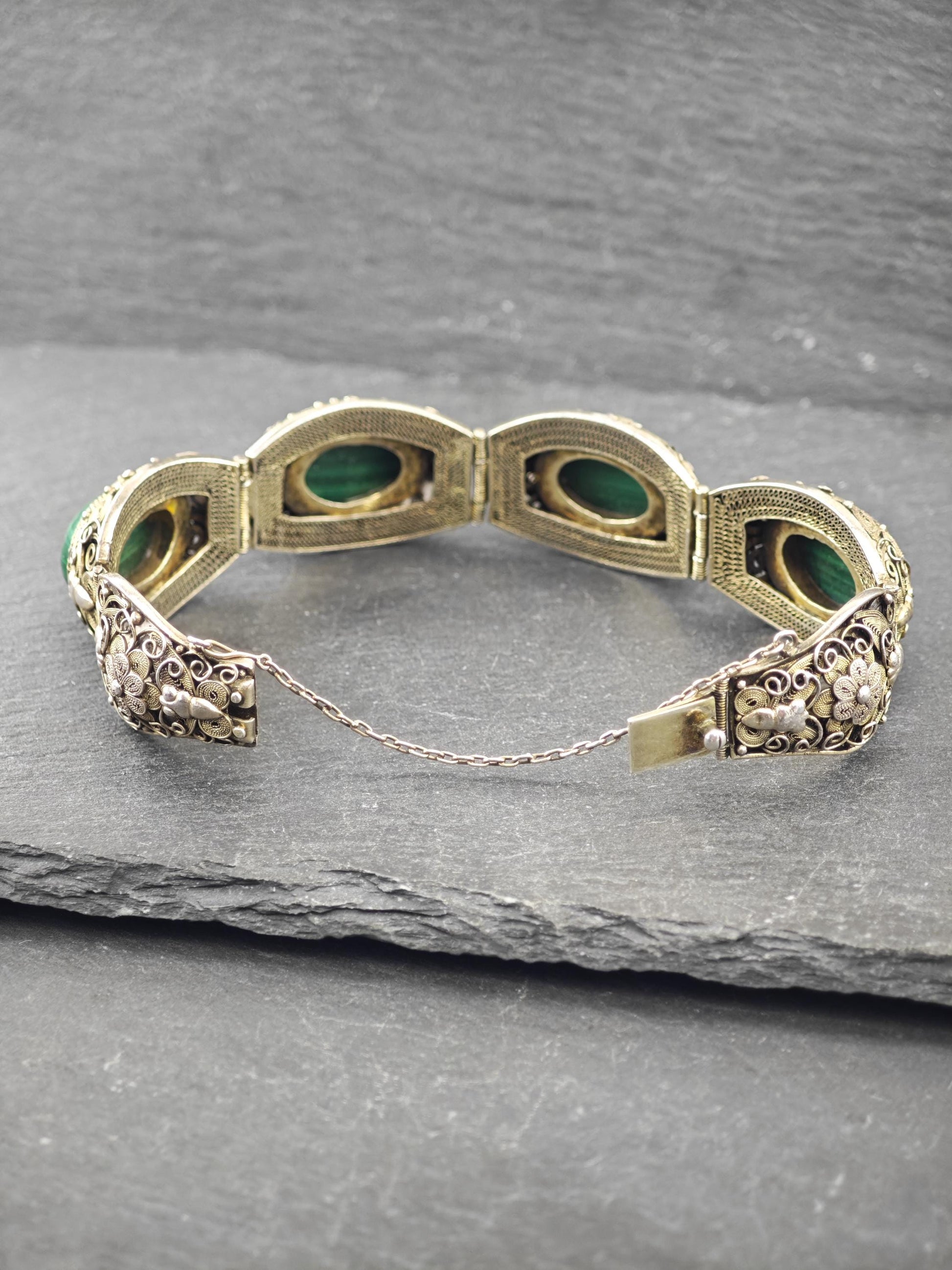 Vintage Chinese Silver Gilt Filigree Malachite Panel Bracelet Sterling Silver