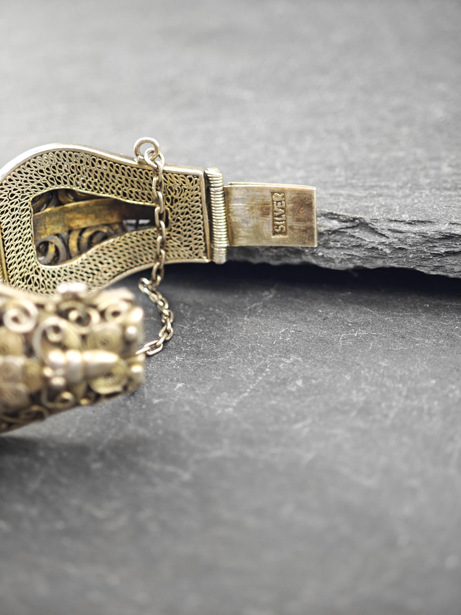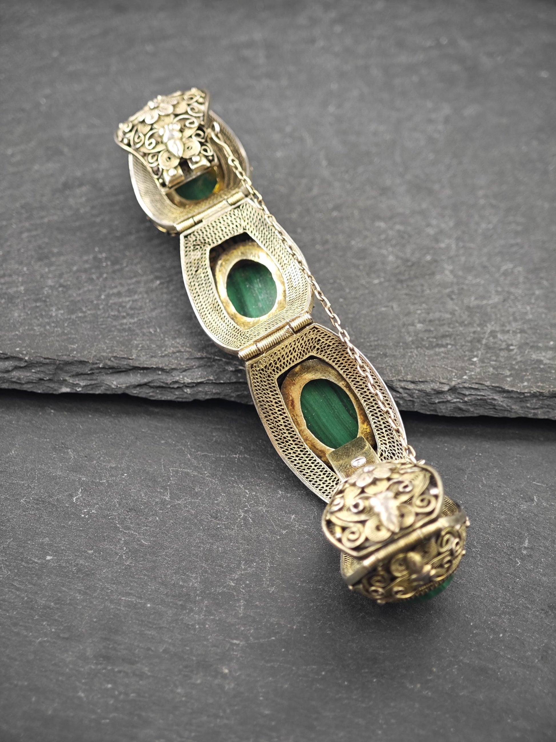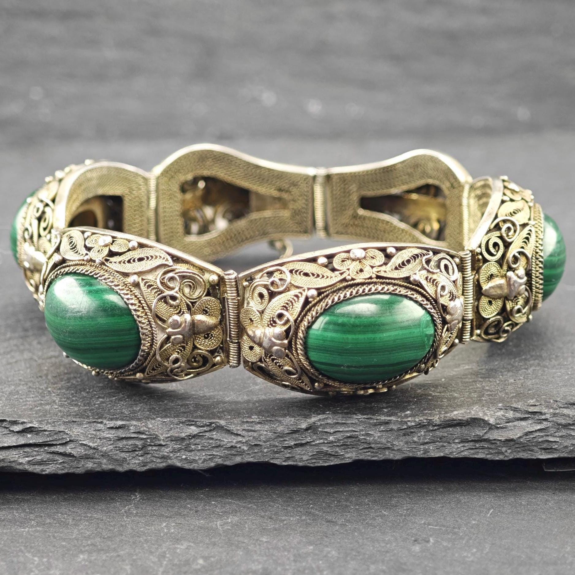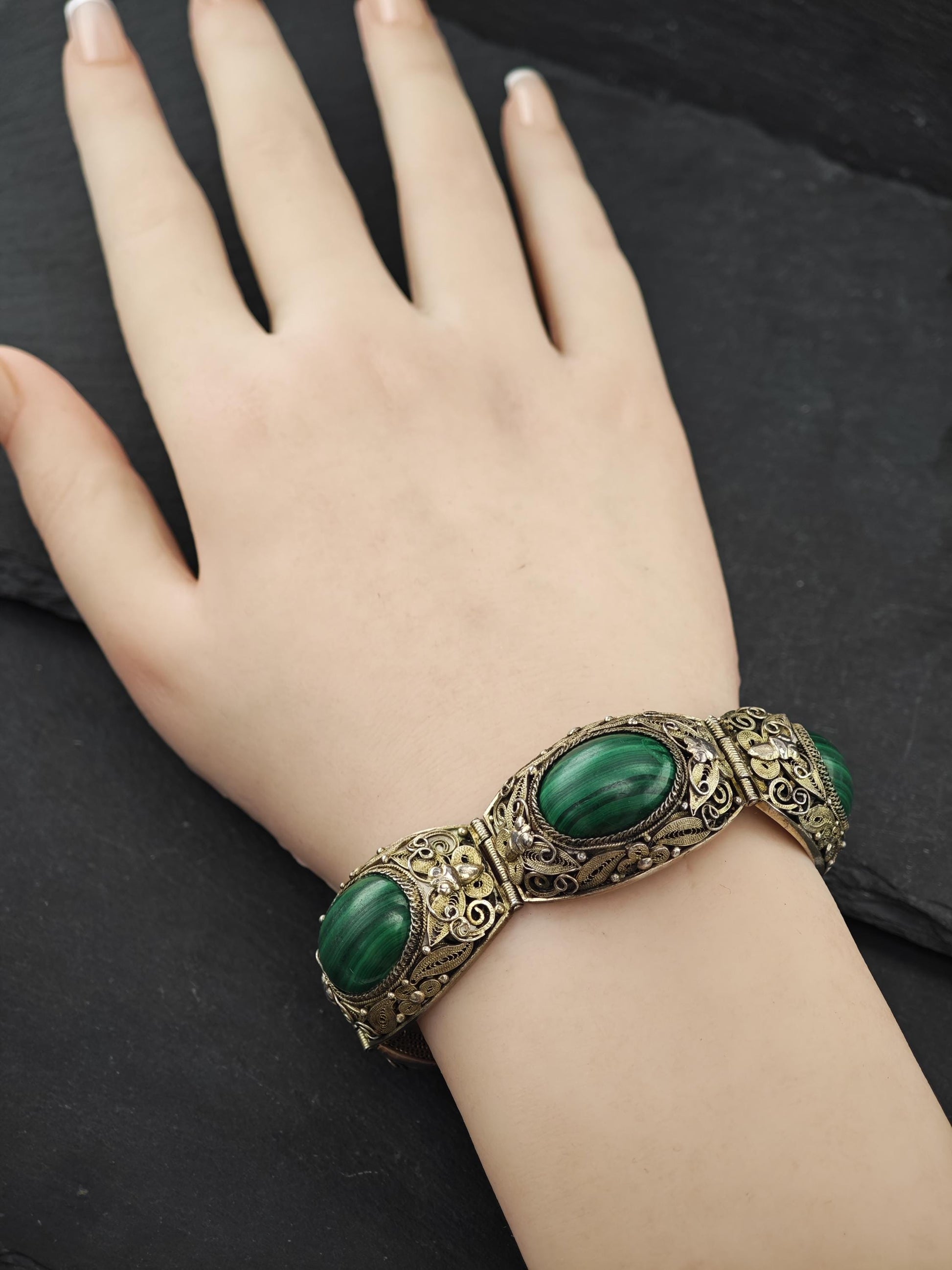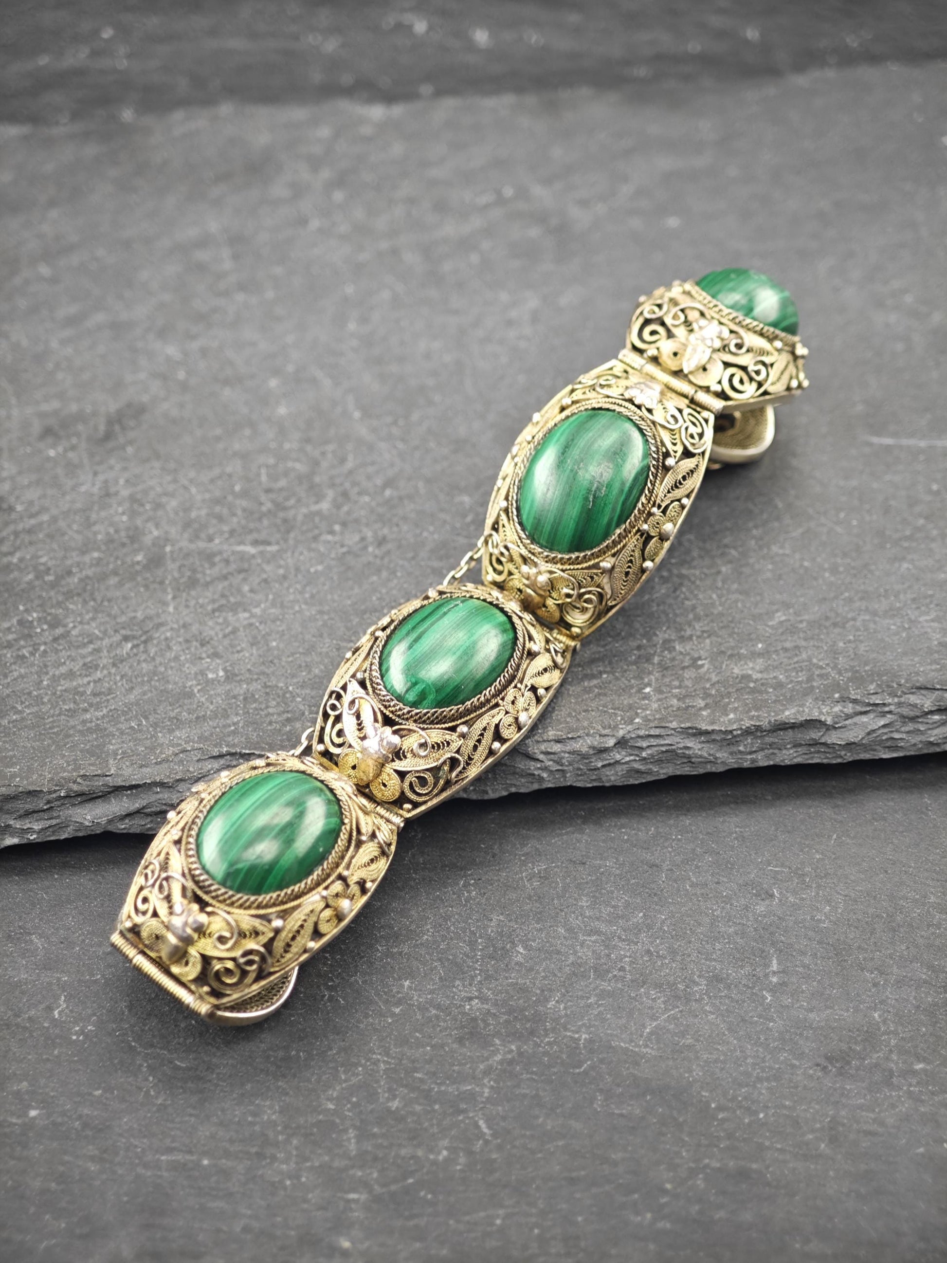 Vintage Chinese Silver Gilt Filigree Malachite Panel Bracelet Sterling Silver