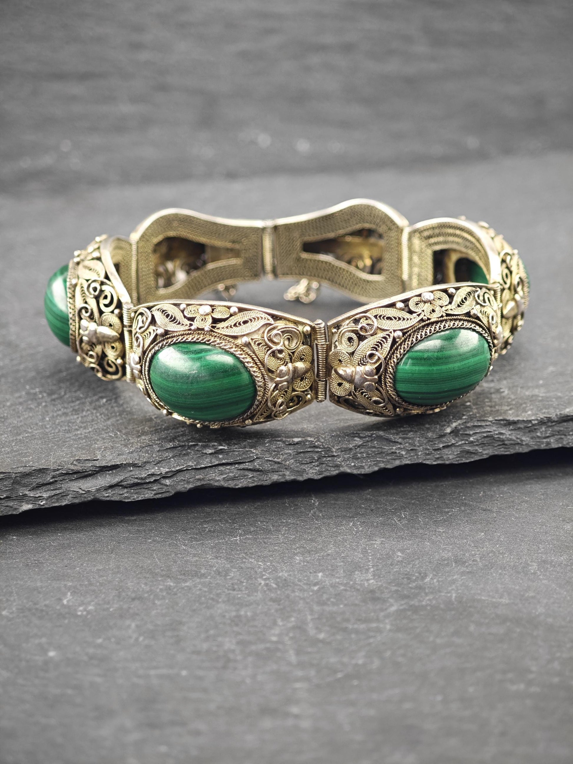 Chinese Silver Gilt Filigree, Malachite Panel Bracelet Sterling Silver