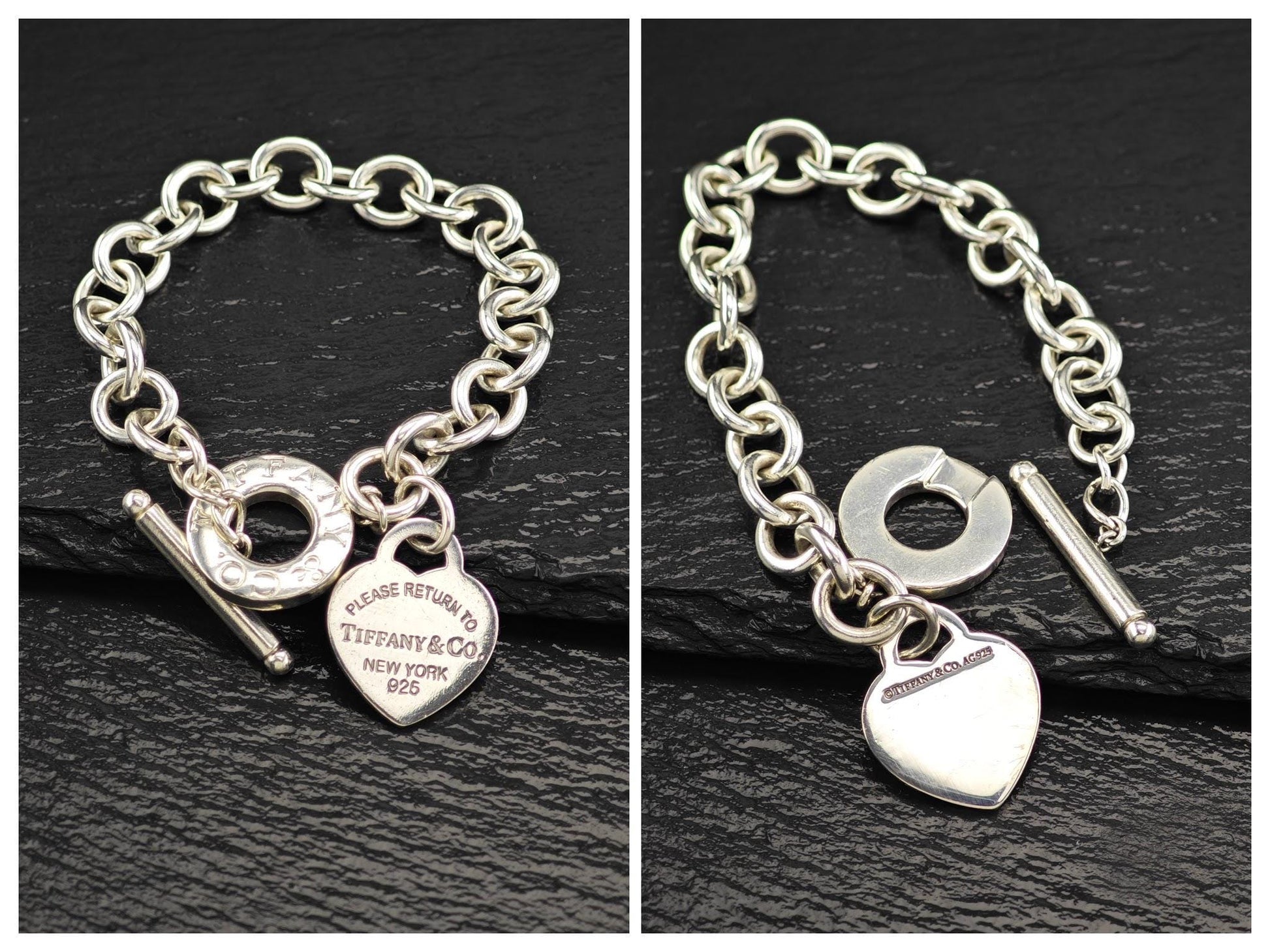 Discover the exquisite choice of authentic pre-owned Tiffany Curb Link Tag Bracelets in sterling silver, meticulously polished and cleaned to like-new condition. Each bracelet is stamped with the iconic Tiffany & Co. mark, including "Please Return To Tiffany & Co., New York," along with the 925 and copyright symbols, ensuring their authenticity and heritage.