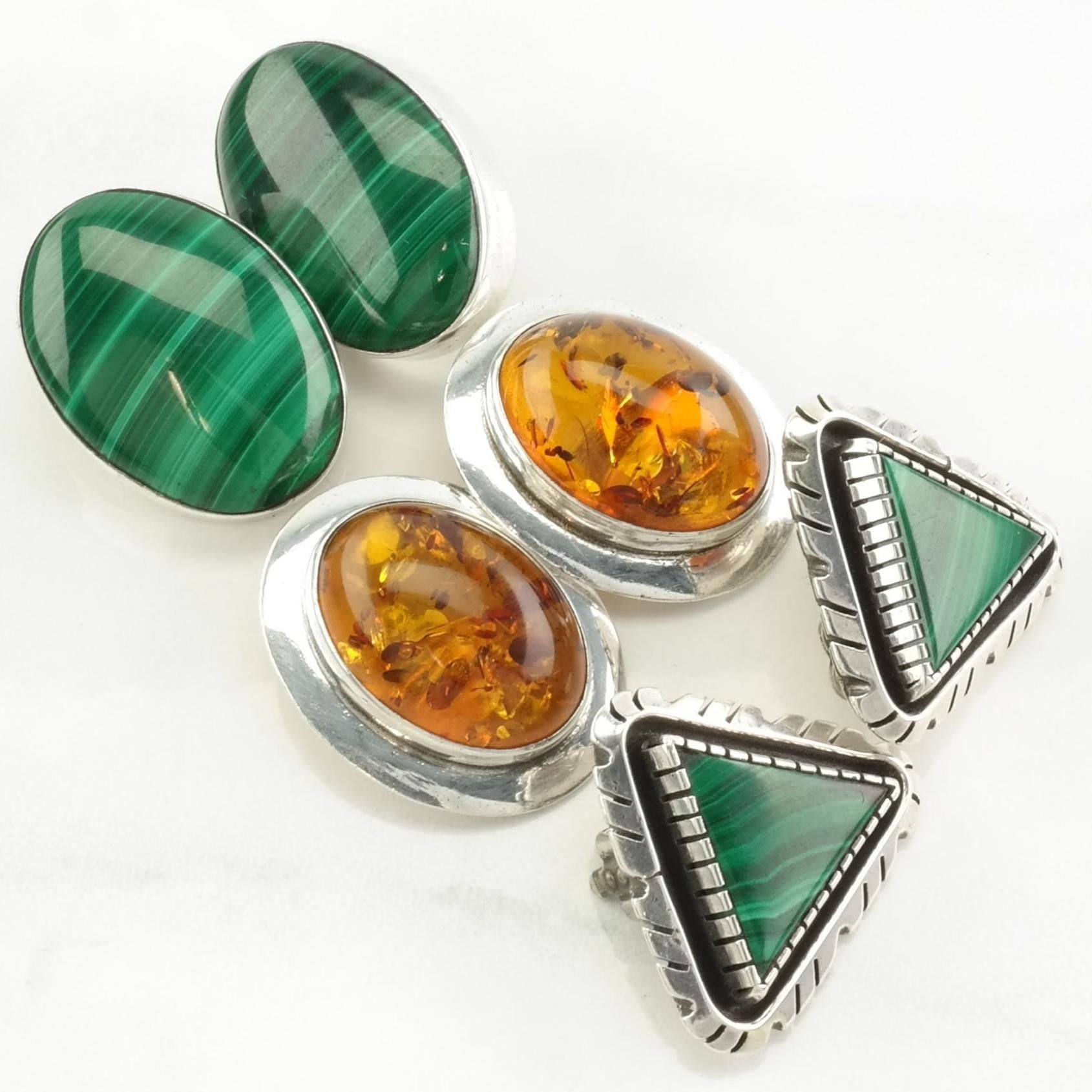 Choice of Vintage Sterling Silver Clip on Earrings Malachite, Amber