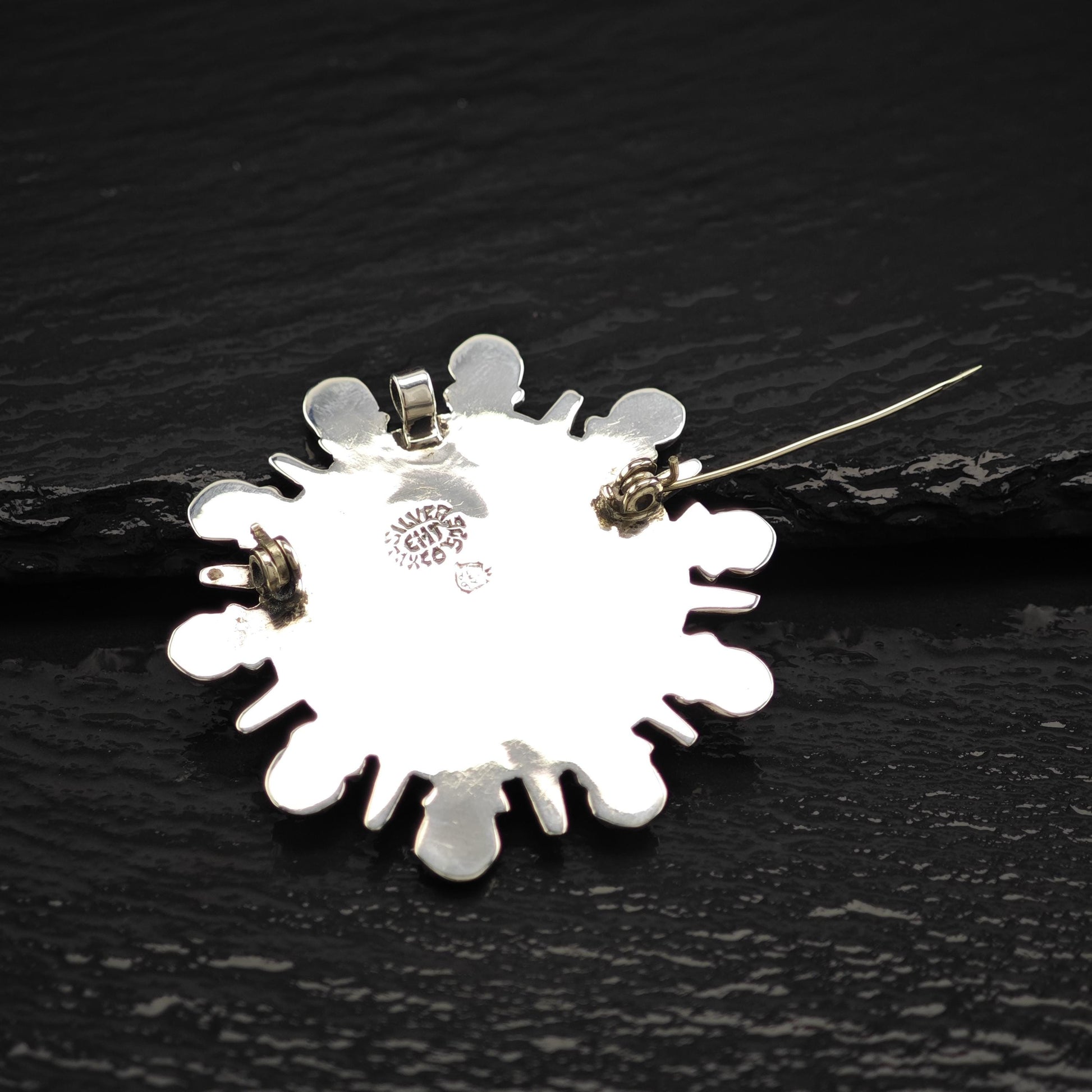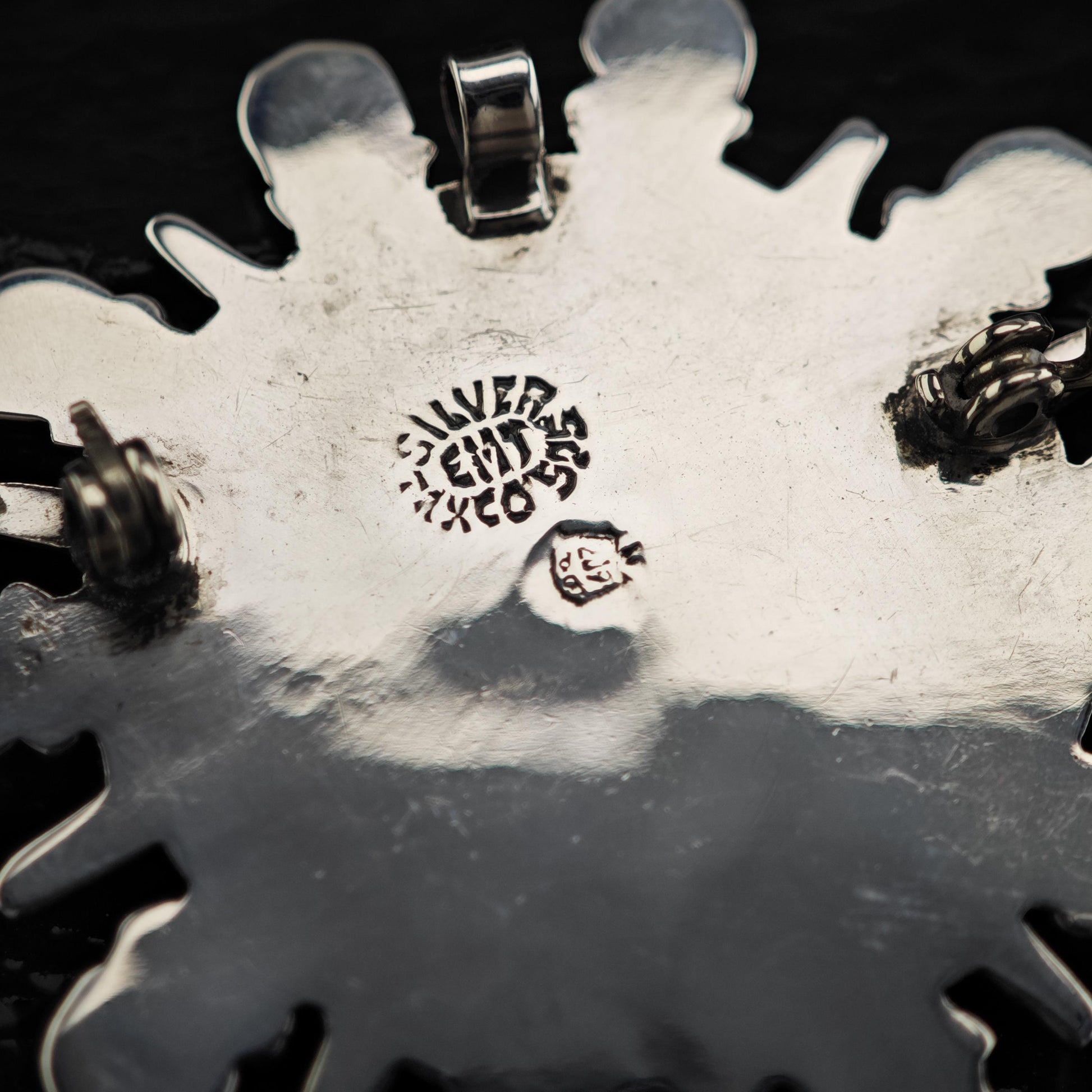 Measuring 1 ¾ inches in both length and width, this brooch is lightweight at just 9.7 grams, making it comfortable to wear. The back of the piece is marked with "EMT," "Mexico Silver 925," and a hallmark, ensuring its authenticity as tested and guaranteed sterling silver.