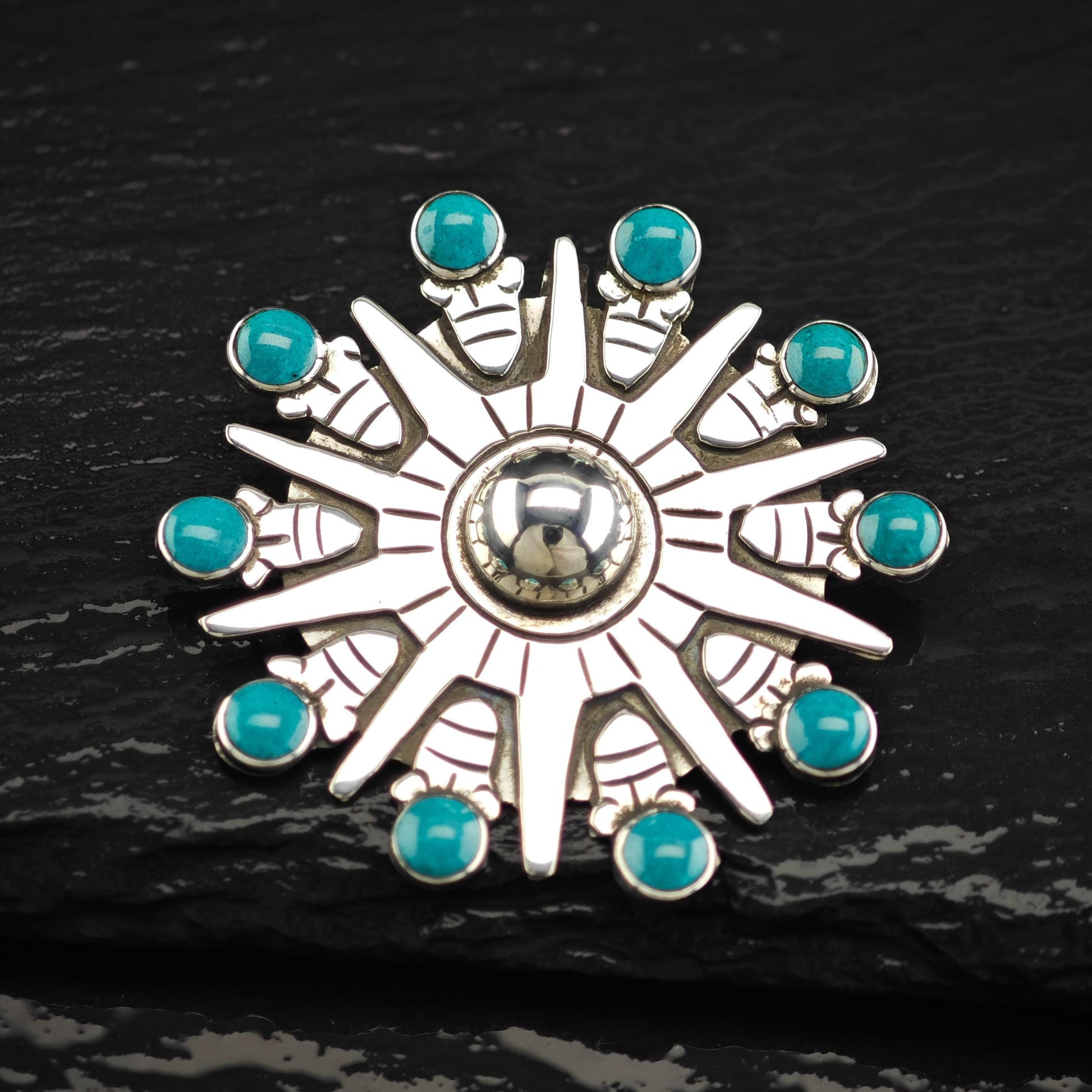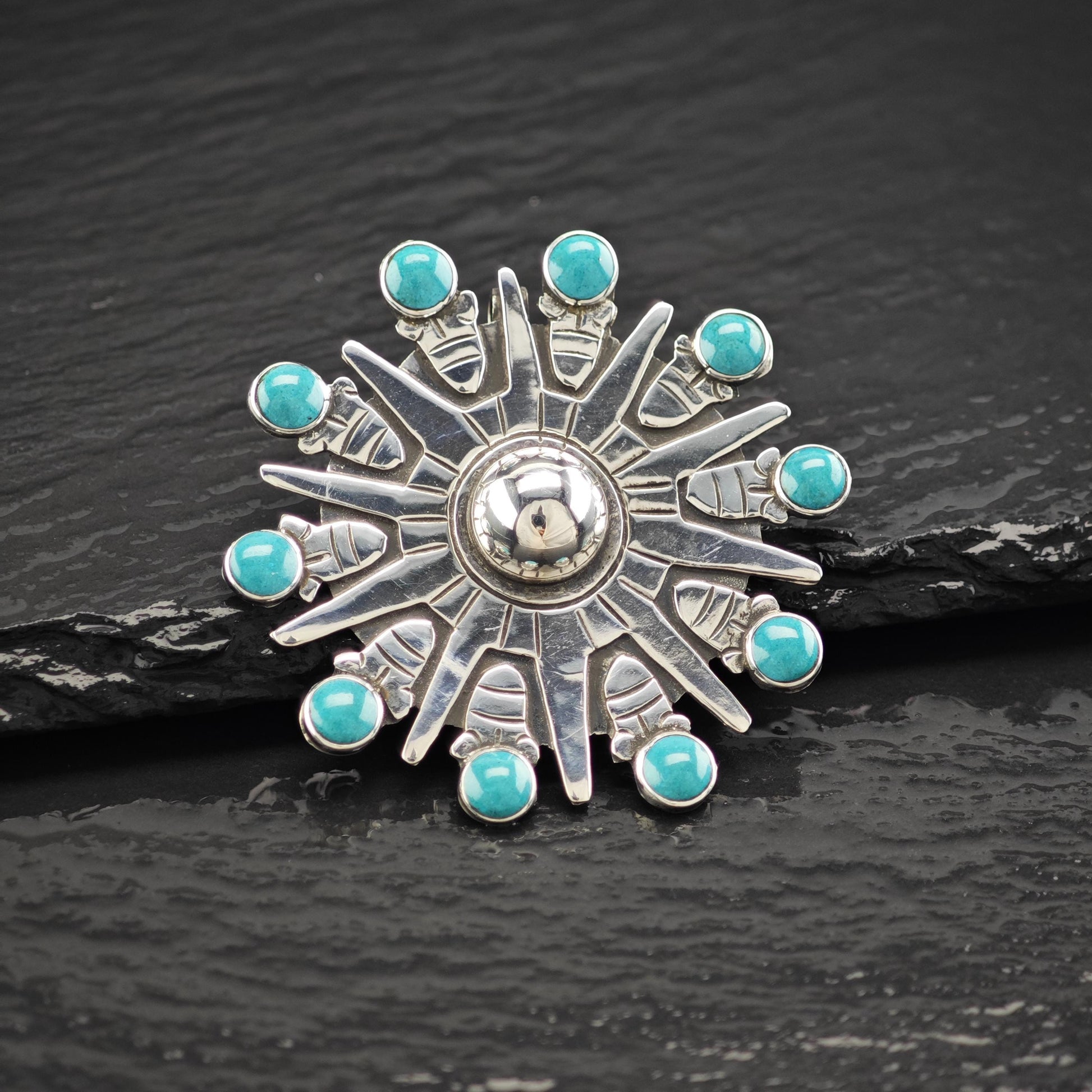 Discover a stunning Spratling-style sterling silver brooch that also serves as a pendant, perfect for adding a touch of elegance to any outfit. Crafted circa 1980, this exquisite piece features a captivating cluster of blue block turquoise, showcasing its vibrant color and unique design.