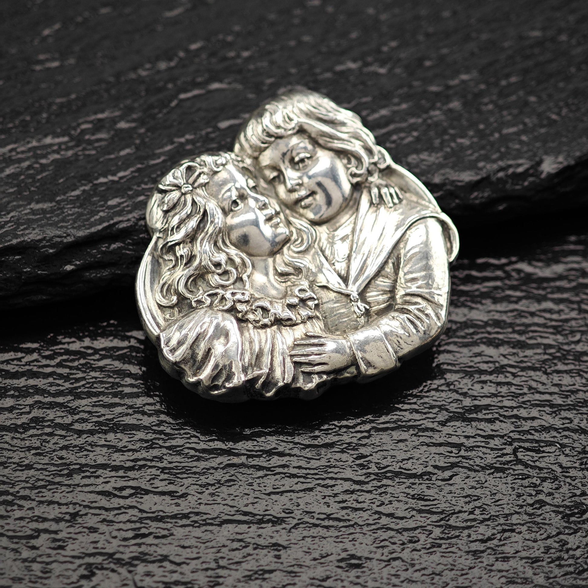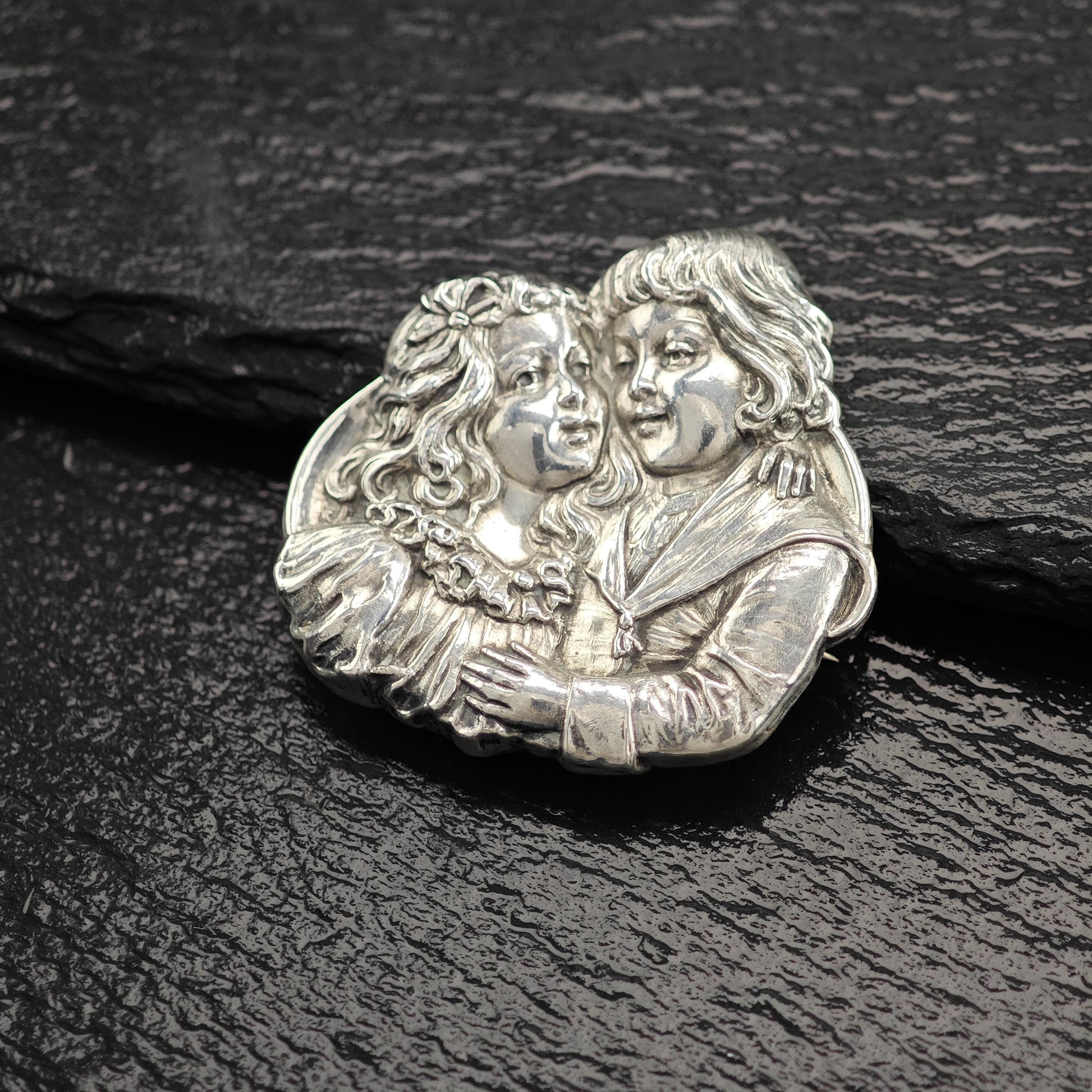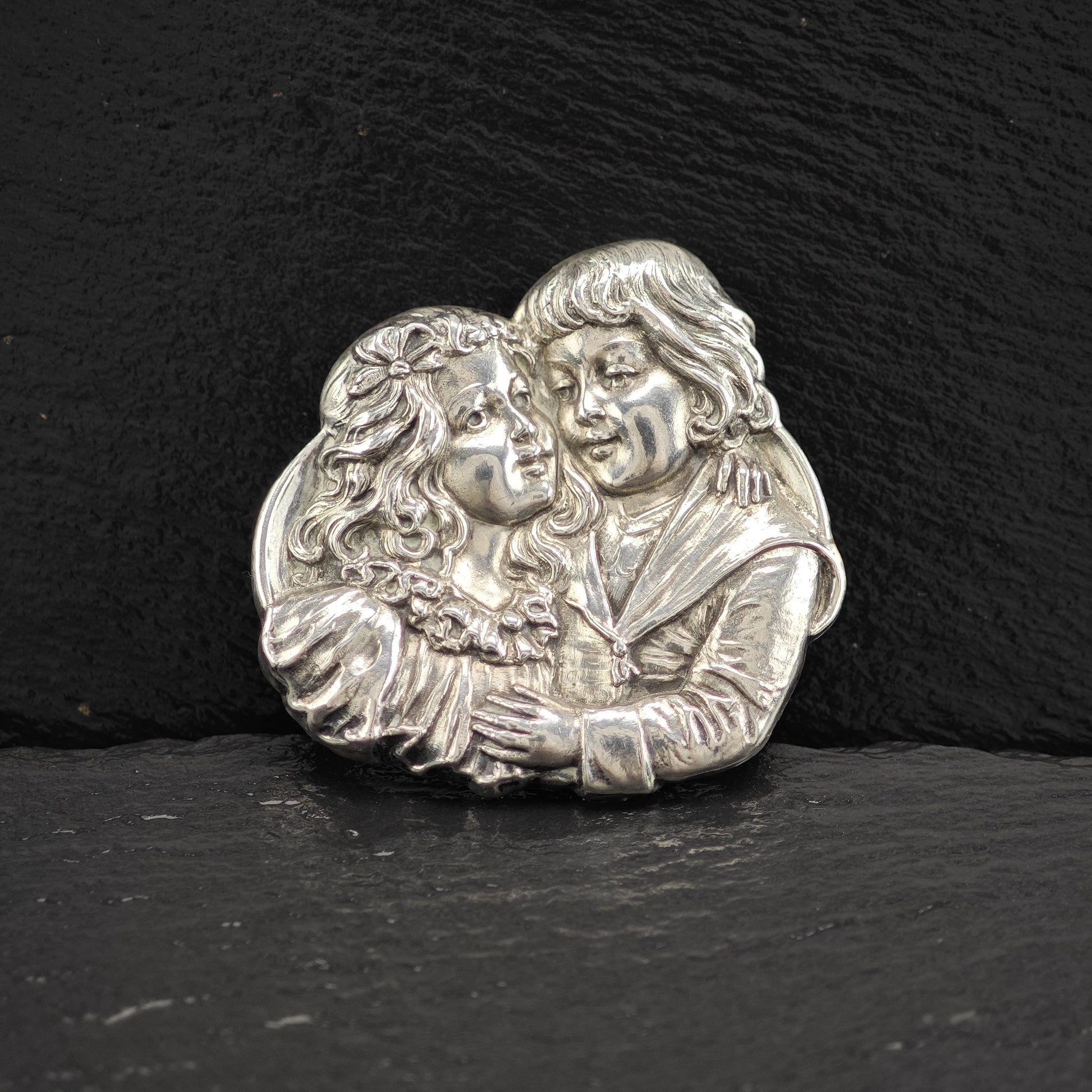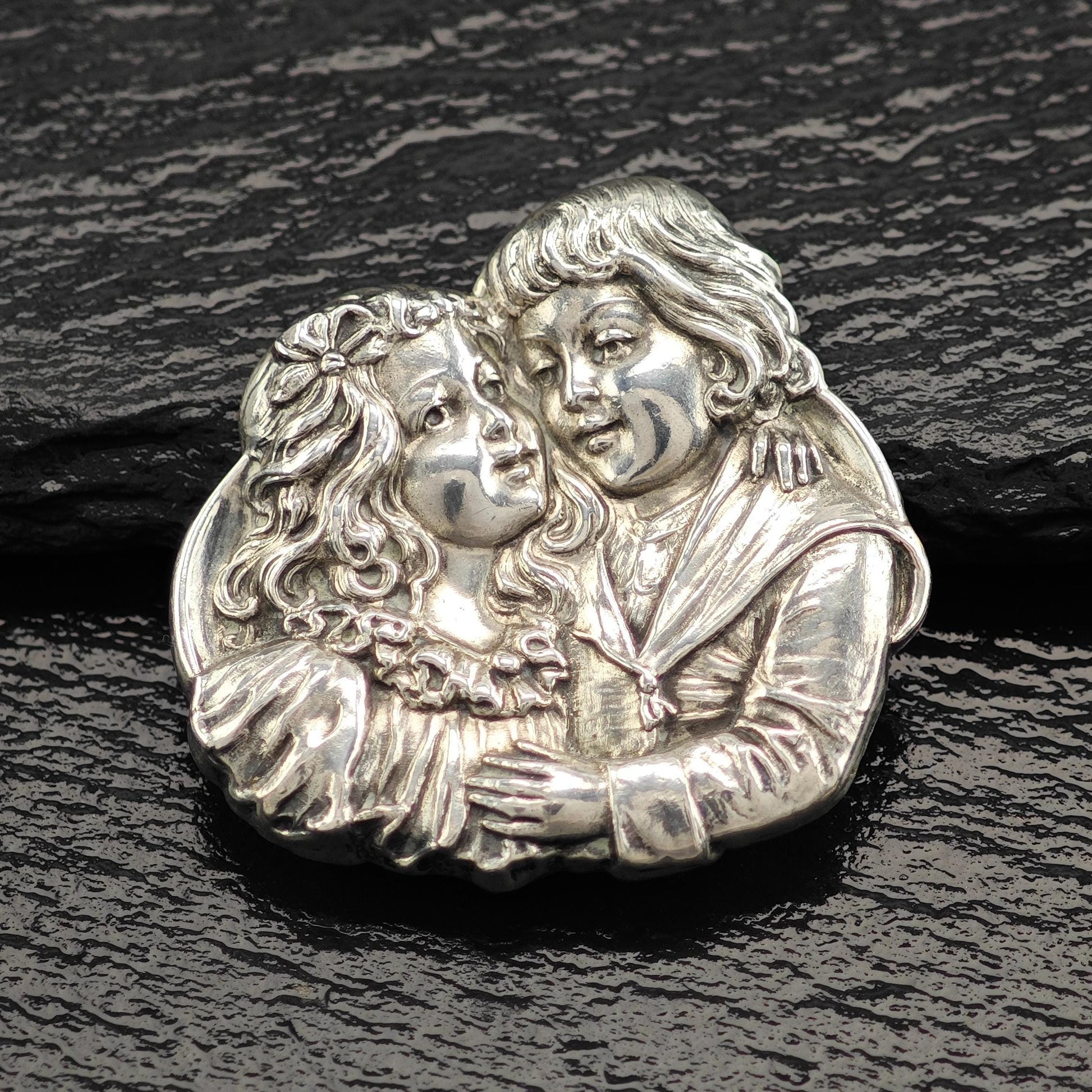 Discover a stunning Art Nouveau brooch featuring charming children, crafted from sterling silver. This beautiful piece, dating back to circa 1920, measures 1 5/8 inches in length and 1 1/2 inches in width, with a total weight of 11.2 grams.