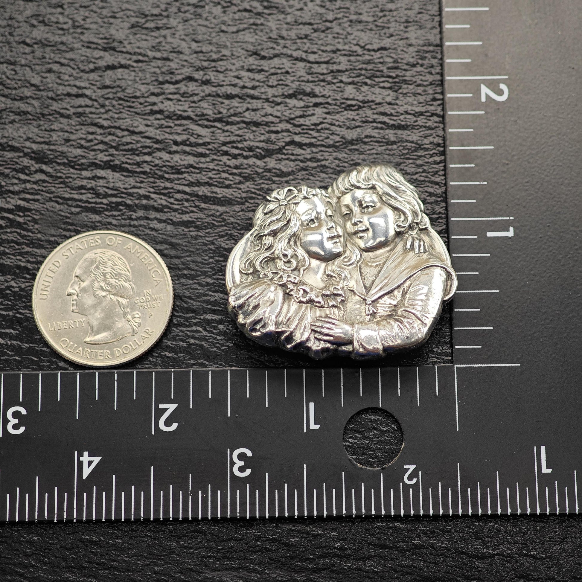 The design showcases delightful children, adding a whimsical touch to your collection. Please note that the brooch is marked "Sterling Top," which indicates that while the pin's back is not sterling silver, the front is tested and guaranteed to be genuine sterling silver.